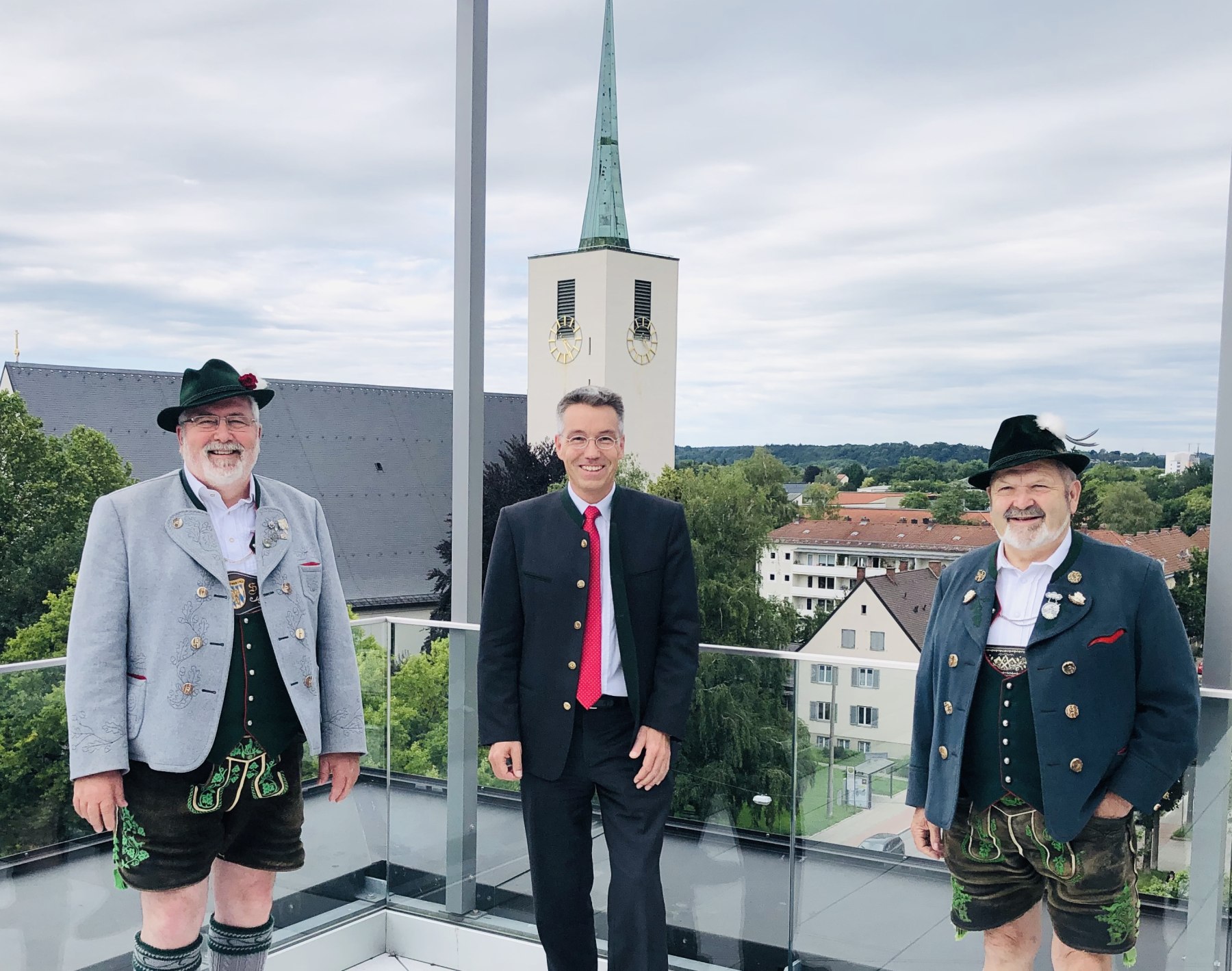 Gemeinsam machten die beiden Landesvorsitzenden Max Bertl vom Bayerischen Trachtenverband und Sebastian Friesinger vom Bayernbund ihren Antrittsbesuch beim neuen Rosenheimer Landrat Otto Lederer. Hauptgrund der Beratungen waren dabei die coronabedingten Änderungen bei der Durchführung von Versammlungen und Tagungen.