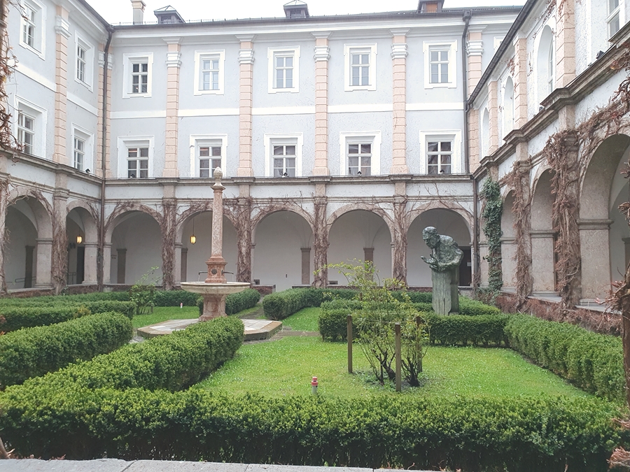 Der begrünte Innenhof befindet sich im Gebäude des ehemaligen Franziskanerklosters