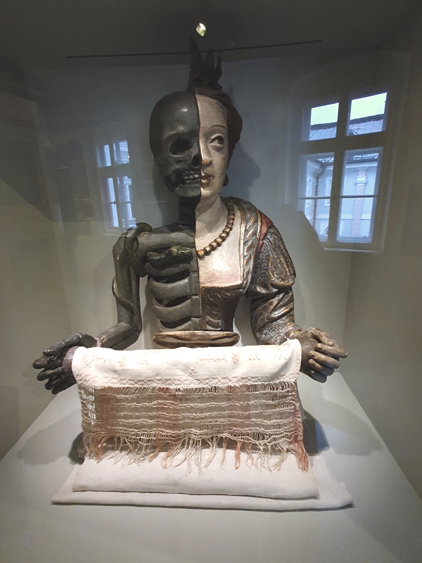 Ein Handtuchhalter, halb Mensch, halb Skelett, erinnert an das Vergängliche