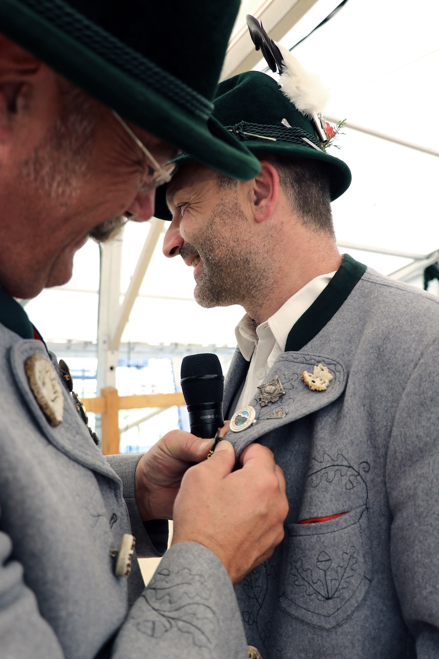 Zunächst hatte 1. Gauvorstand Pankraz Perfler die Freude, dem im vergangenen Jahr aus dem Gauausschuss ausgeschiedenen Florian Griebl das Ehrenzeichen des Bayerischen Inngau-Trachtenverbandes für Dank und Anerkennung in Gold zu überreichen. Ganze 26 Jahre war Florian in der Gaugruppe (1996 - 2021), ab 2000 war er 2. Gauvorplattler, ab 2003 1. Gauvorplattler. Von 2009 - 2012 brachte er sich als Beisitzer im Gauausschuss ein und übernahm von 2012 bis 2015 das Amt als 2. Gaujugendleiter. Von 2015 bis 2024 war er Preisrichterobmann. Außerdem war er von 2009 an 12 Jahre lang Gaujugendgruppenleiter und ist seit 1996 Preisrichter.