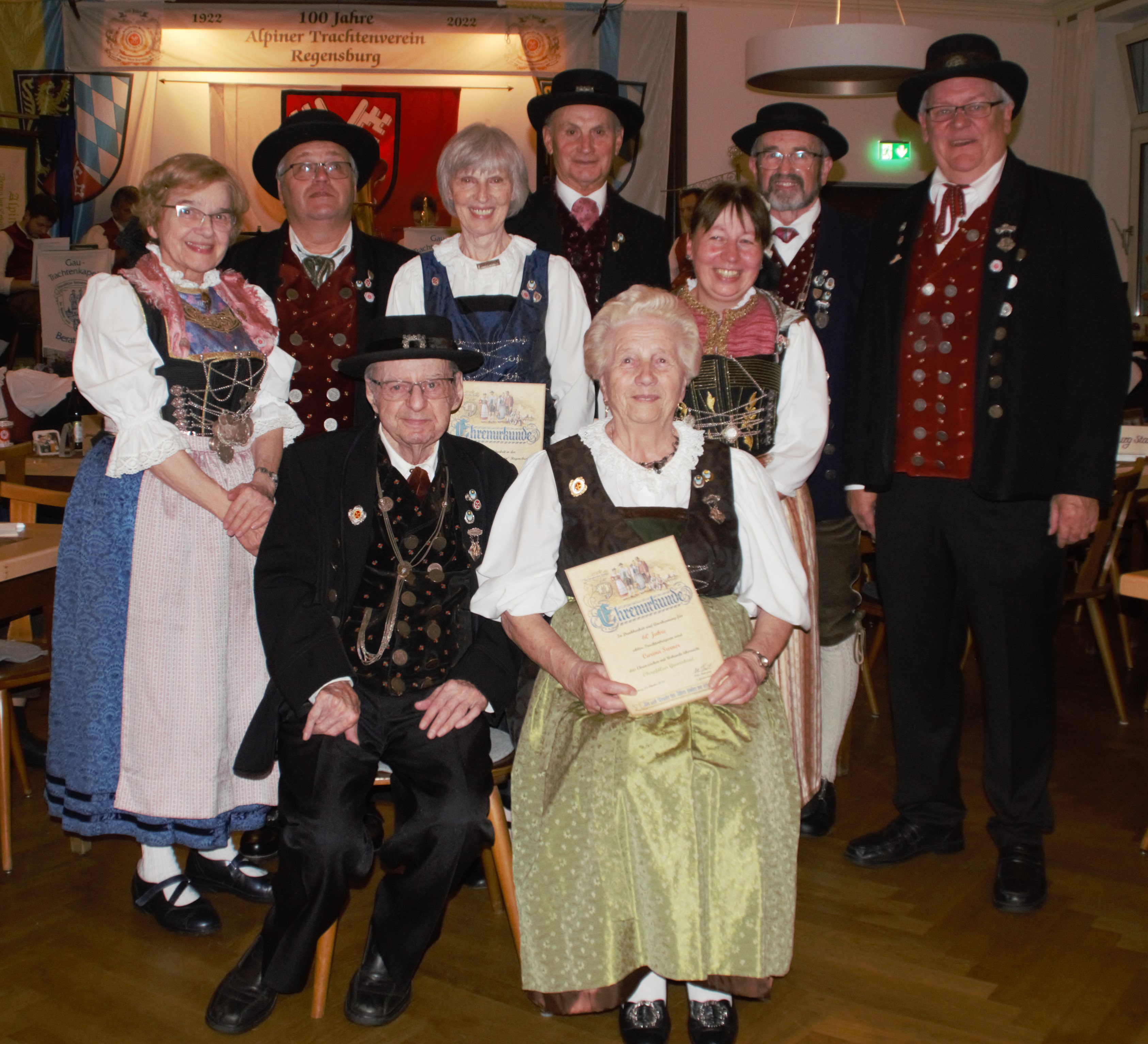 Natürlich gab es beim 100-jährigen auch zahlreiche Vereinsehrungen: für 15 Jahre Vereinszugehörigkeit das bronzene Ehrenzeichen für Agnes Rogowsky und Udo Betz; für 25 Jahre das silberne Ehrenzeichen für Christine und Markus Schmid; für 40 Jahre das goldene Ehrenzeichen für Brigitte und Sascha Rogowsky. Für 50 Jahre wurden Werner Steib sowie Elfriede und Artur Zangl, dem Ehrenvorstand der „Alpiner“, und für 60 Jahre Carina Surner jeweils mit einem besonderen Ehrenzeichen geehrt. Höhepunkt der Ehrungen war zweifellos die Ernennung von Thomas Luger zum Ehrenvortänzer aufgrund seiner außerordentlichen Verdienste um den Verein und für jahrzehntelange Mitwirkung im Vorstand. Peter Kurzwart, Gauvorstand des Oberpfälzer Gauverbandes der Heimat- und Trachtenvereine, ehrte für ihre aktive Mitgliedschaft in der Trachtenbewegung die vom Verein ausgezeichneten Mitglieder nochmals mit Gauehrenzeichen und bedankte sich herzlich für das jahrzehntelange Engagement für die Trachtensache.