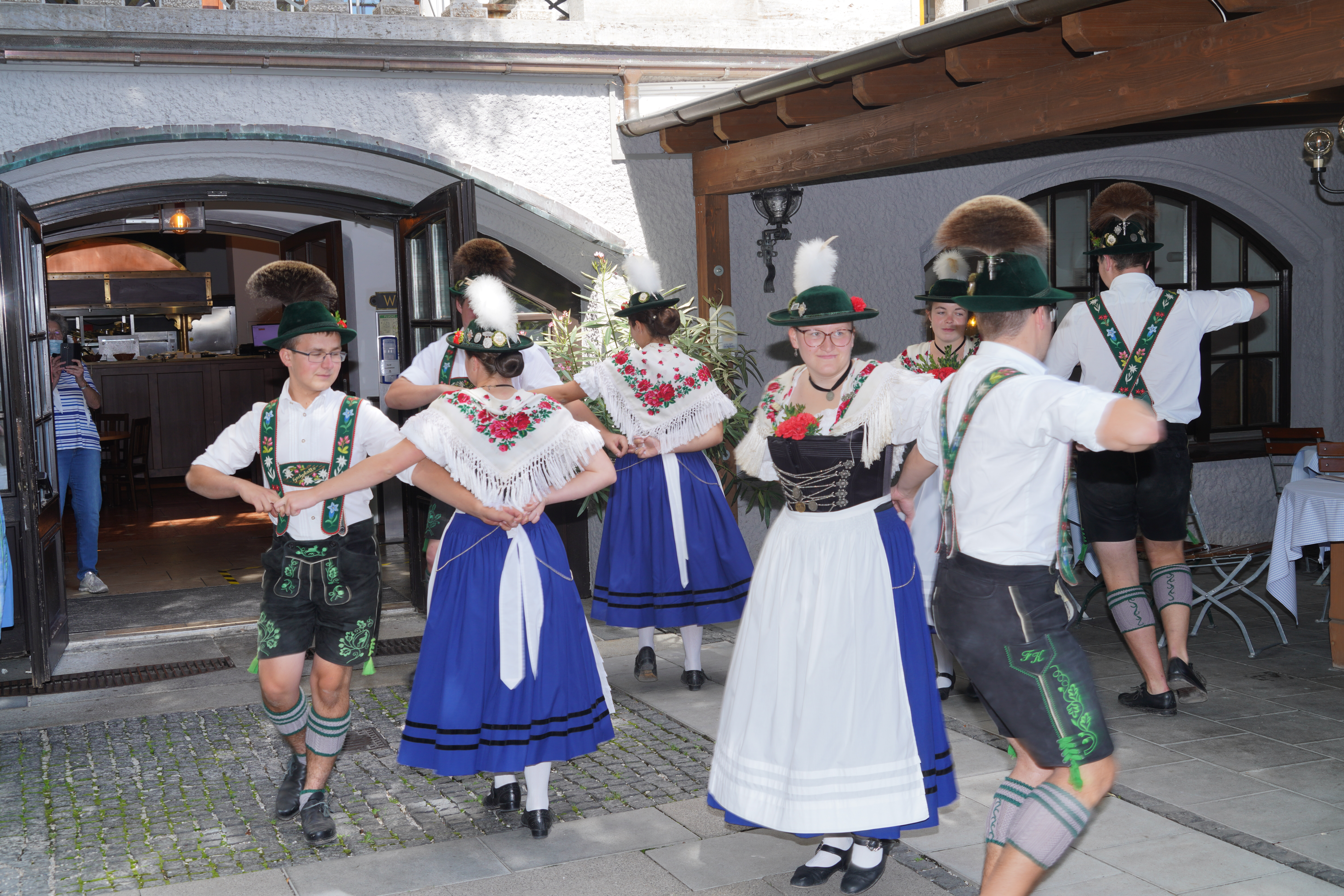 Begleitet mit Ziach und Posaune führten die rund zwanzig Aktiven, mit dem nötigen Sicherheitsabstand aber mit voller Freude, Volkstänze und Schuhplattler auf. Wegen der Pandemie gibt es in dieser Saison fast keine Auftrittsmöglichkeiten, deshalb waren die Auftritte mit viel Spaß verbunden.