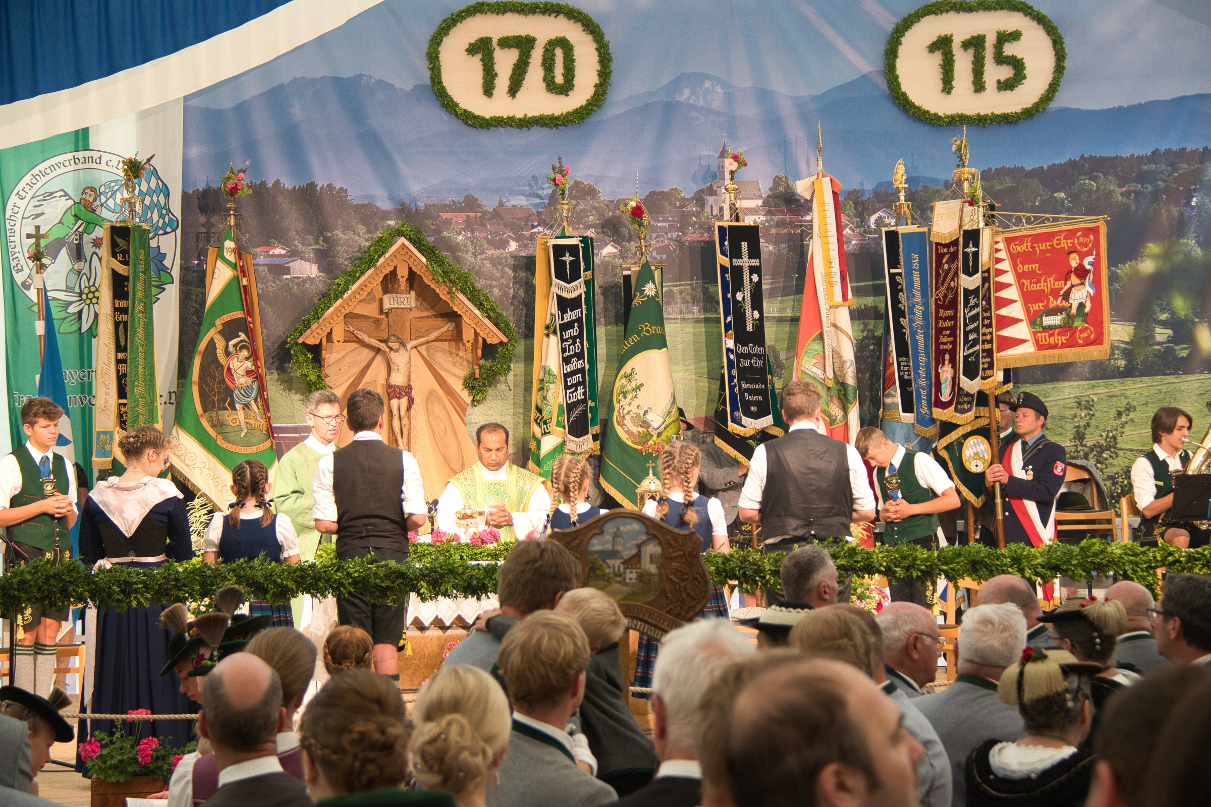 Am Festsonntag musste der Gottesdienst aufgrund der unsicheren Wetterlage im Festzelt stattfinden. Pater Baltharaju Banda zelebrierte die Messe, begleitet von den festlichen Klängen der Blaskapelle Höhenrain. Der Pater lobte in seiner Predigt die lebendige Brauchtumspflege der Vereine und ihre Verbundenheit zum Glauben, die sich in der feierlichen Gestaltung des Festgottesdienstes zeige. Er erklärte: "Ich möchte euch gratulieren, dass die Treue zur Heimat auch die Treue zu Gott beinhaltet."
