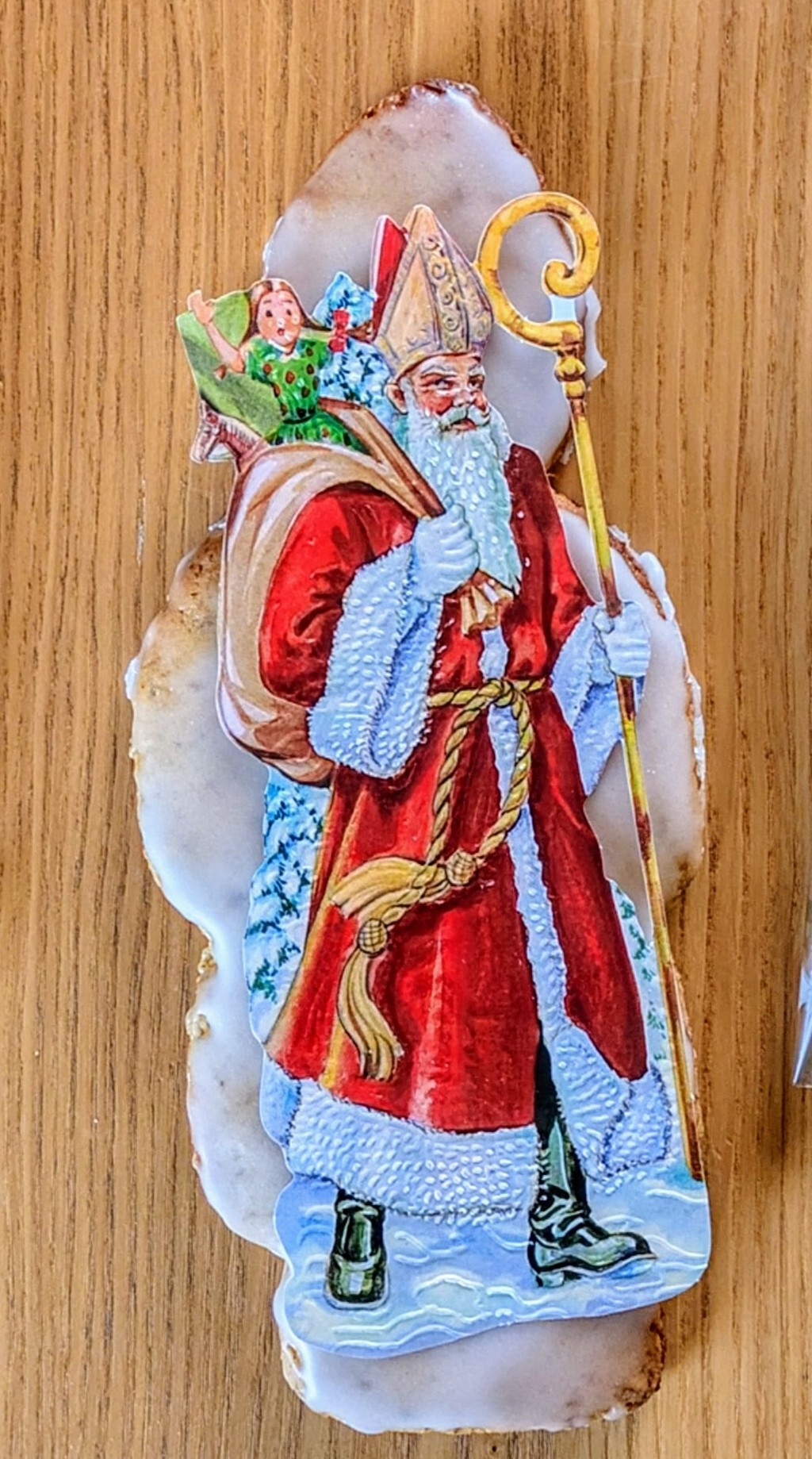 Gisela Haußner und Maria Landerer vom Sachgebiet Mundart, Brauchtum, Laienspiel des Bayerischen Trachtenverbandes haben das Wochenende vor dem ersten Advent im Trachtenkulturzentrum Holzhausen fleißig für den Adventsmarkt vom 28. bis 30. November 2025 Nikolaus aus Honig-Lebkuchen gebacken, mit Bildern beklebt und eingetütet.