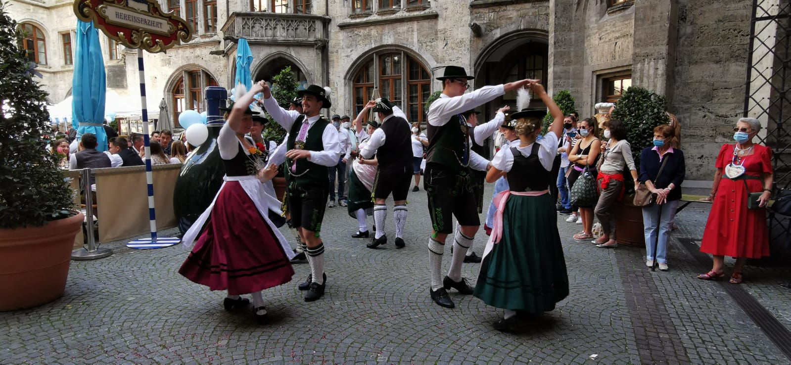 Samstag, 19.09.2020. Eigentlich wäre heute der traditionelle Start des Oktoberfestes auf der Theresienwiese, leider musste auch das größte Volksfest der Welt durch die Corona Pandemie abgesagt werden. Trotzdem ist es der Stadt München im Zusammenhang mit dem Festring München bei den politischen Kabinettssitzungen gelungen eine sogenannte „Wirtshaus-Wiesn“ zu präsentieren die bereits schon vor über 100 Jahren Tradition hatte, und jetzt wieder wiederbelebt wurde. Insgesamt 54 Wirtshausbuden haben sich dieser Idee angeschlossen und wollen jetzt bis 04. Oktober für eine kleine Wiesn Stimmung an den unterschiedlichsten Standorten Münchens sorgen. Unsere Gauvorplattler wurden vom Festring München eingeladen mit der Gaugruppe am Anstich der „Wirtshaus Wiesn“ im Prunkhof des Münchner Rathauses einige Auftritte zu präsentieren. Mit insgesamt 5 Paaren unter der Leitung von unserem 3. Gauvorplattler Roland Hemmer wurden wieder nach längerer Corona Tanzpause verschiedene Volkstänze, Plattler und Burschenplattler aufgeführt. Musikalisch wurde die Gaugruppe von Michael Unruh unterstützt. Es war ein schöner Auftritt unter strahlend blauem Himmel. Wir bedanken uns bei den Organisatoren und dem Festring München für die Einladung.