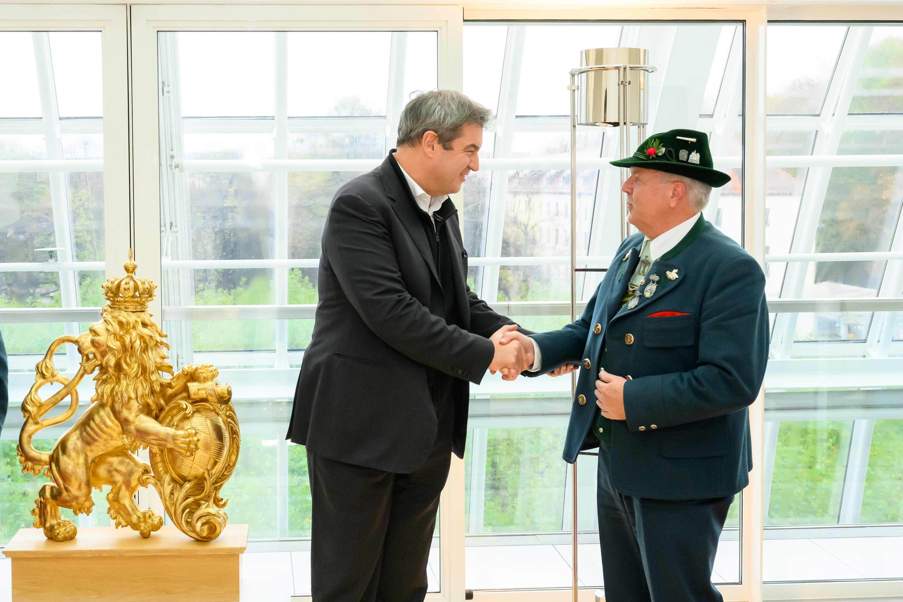 In diesem Sinne lud der Bayerische Ministerpräsident Dr. Markus Söder den Ehrenvorsitzenden des Bayerischen Trachtenverbandes Max Bertl aus Wildsteig und dessen Nachfolger im Amt des Landesvorsitzenden Günter Frey aus Sulzschneid zu einem Gedankenaustausch in die Bayerische Staatskanzlei ein.