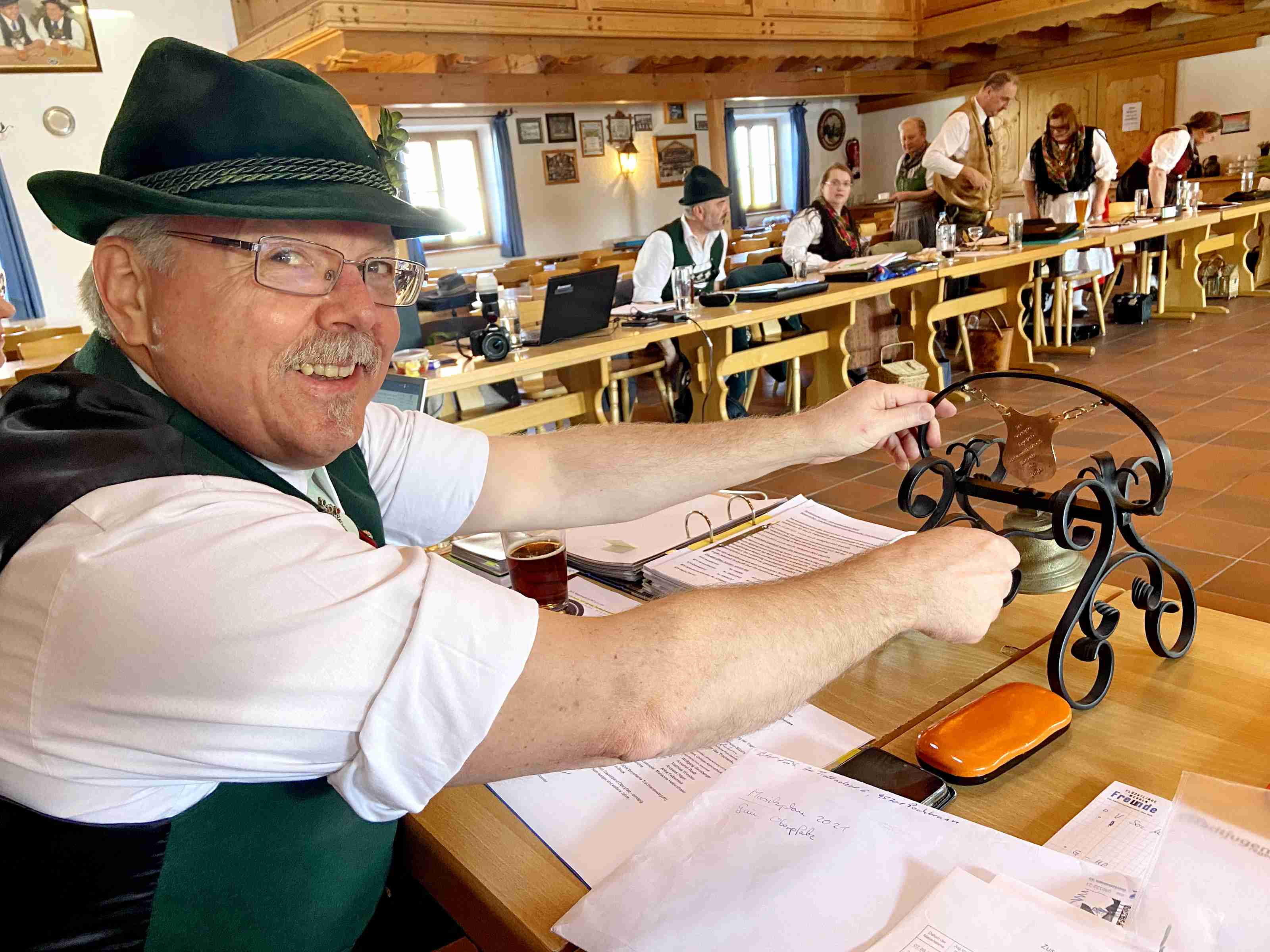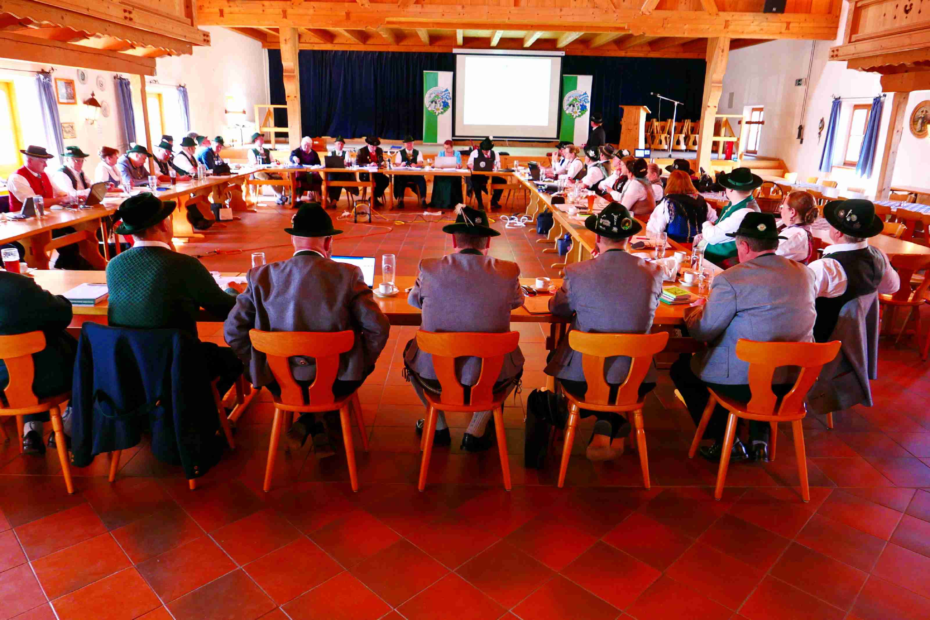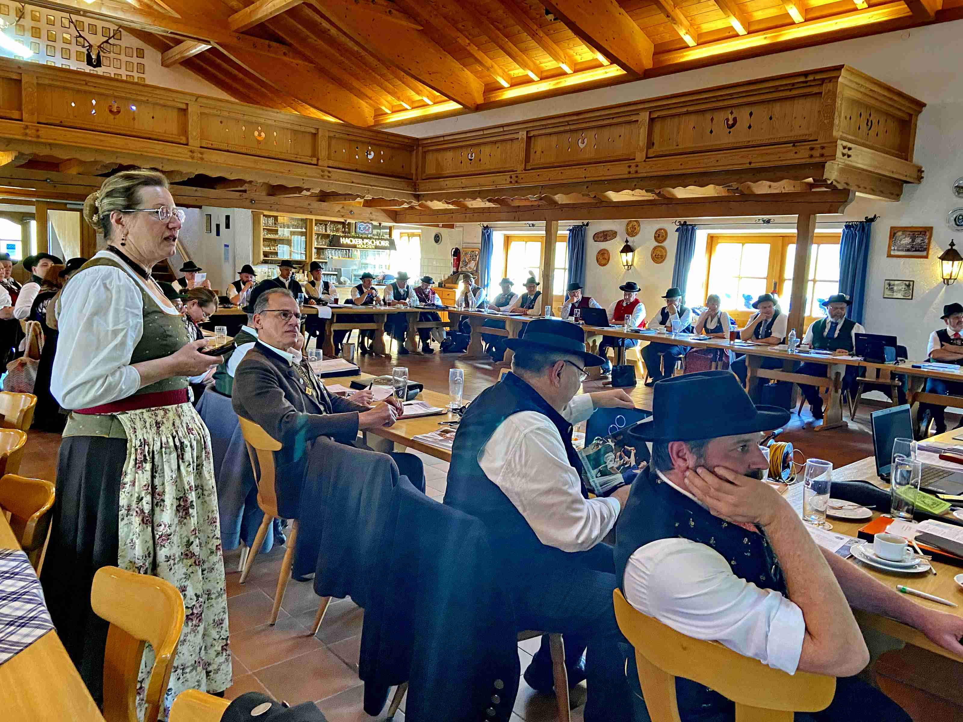Fotos: Hötzelsperger – Eindrücke vom Frühjahrs-Seminar des Bayerischen Trachtenverbandes im Trachtenheim von Irschenberg – 1. An der Sitzungs-Glocke: Landesvorsitzender Günter Frey – 2. Blick in die Versammlung.