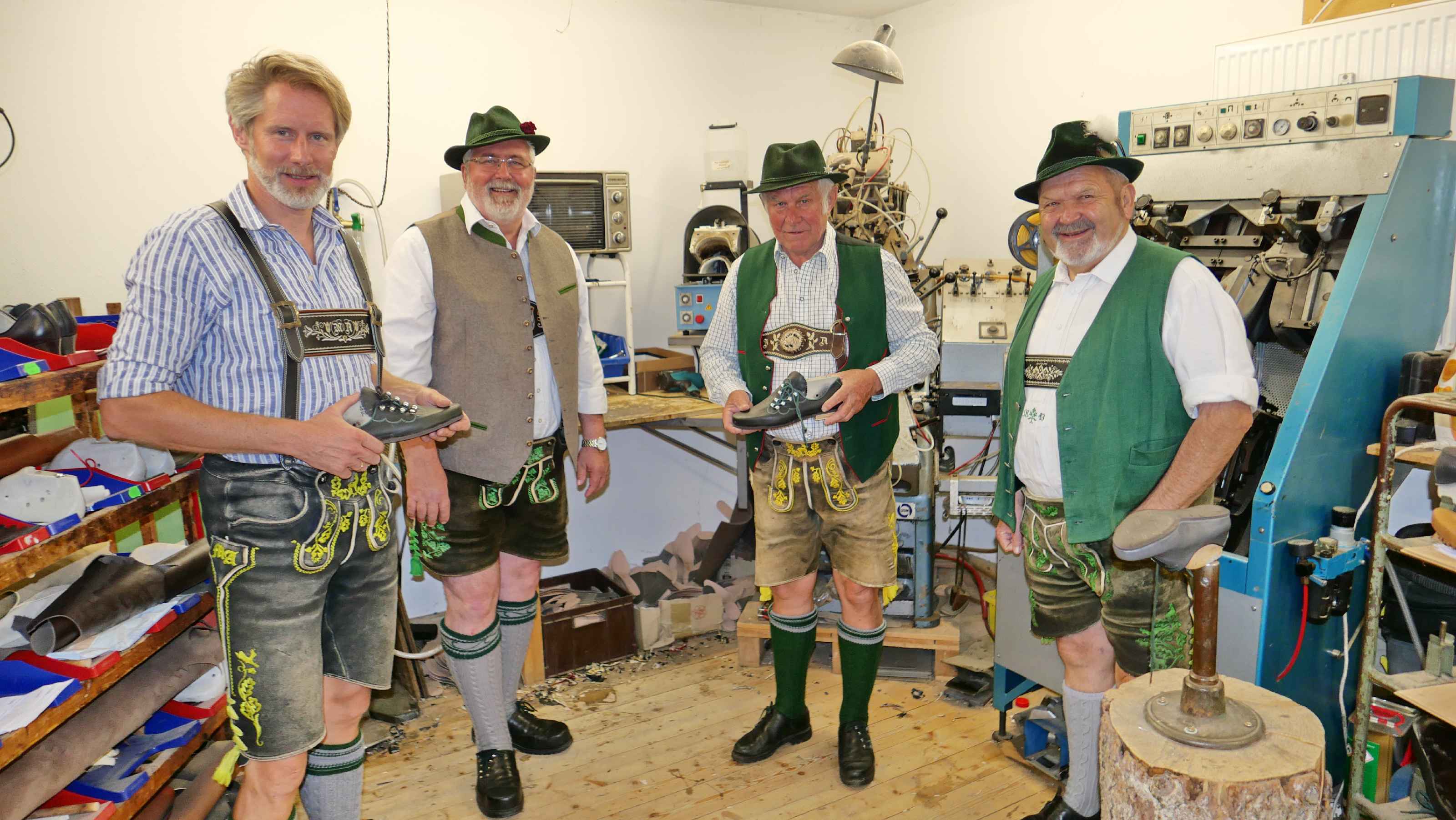 „Ein Jahr ohne Gautrachtenfeste und Plattlerproben bedeutet auch für die Hersteller und Verkäufer von Trachtengwand und Trachtenschuhen eine Herausforderung, umso mehr schätzen wir Kreativität und Engagement von Schuh Auer am Samerberg“ – so Max Bertl als Landesvorsitzender des Bayerischen Trachtenverbandes und Sebastian Friesinger als Landesvorsitzender des Bayernbundes bei einem Besuch in Törwang am Samerberg. Dabei ließen sie sich von Inhaber Michael Auer und seinem Vater Hans Auer deren Erweiterung im Ladensortiment sowie in der Werkstatt die eigene Herstellung ganz individueller Trachtenschuhe erklärten. „Die ganz persönlichen Schuhe erfordern natürlich mehr Aufwand und Zeit, aber heuer, da das Rosenheimer Herbstfest und das Münchner Oktoberfest nicht stattfinden, können wir uns diesen Kundenwünschen leichter widmen. Und jedes selbst hergestellte Paar Trachtenschuhe für Männer und Frauen ist eine Freude für sich“ – so die Schuhmacher vom Samerberg.