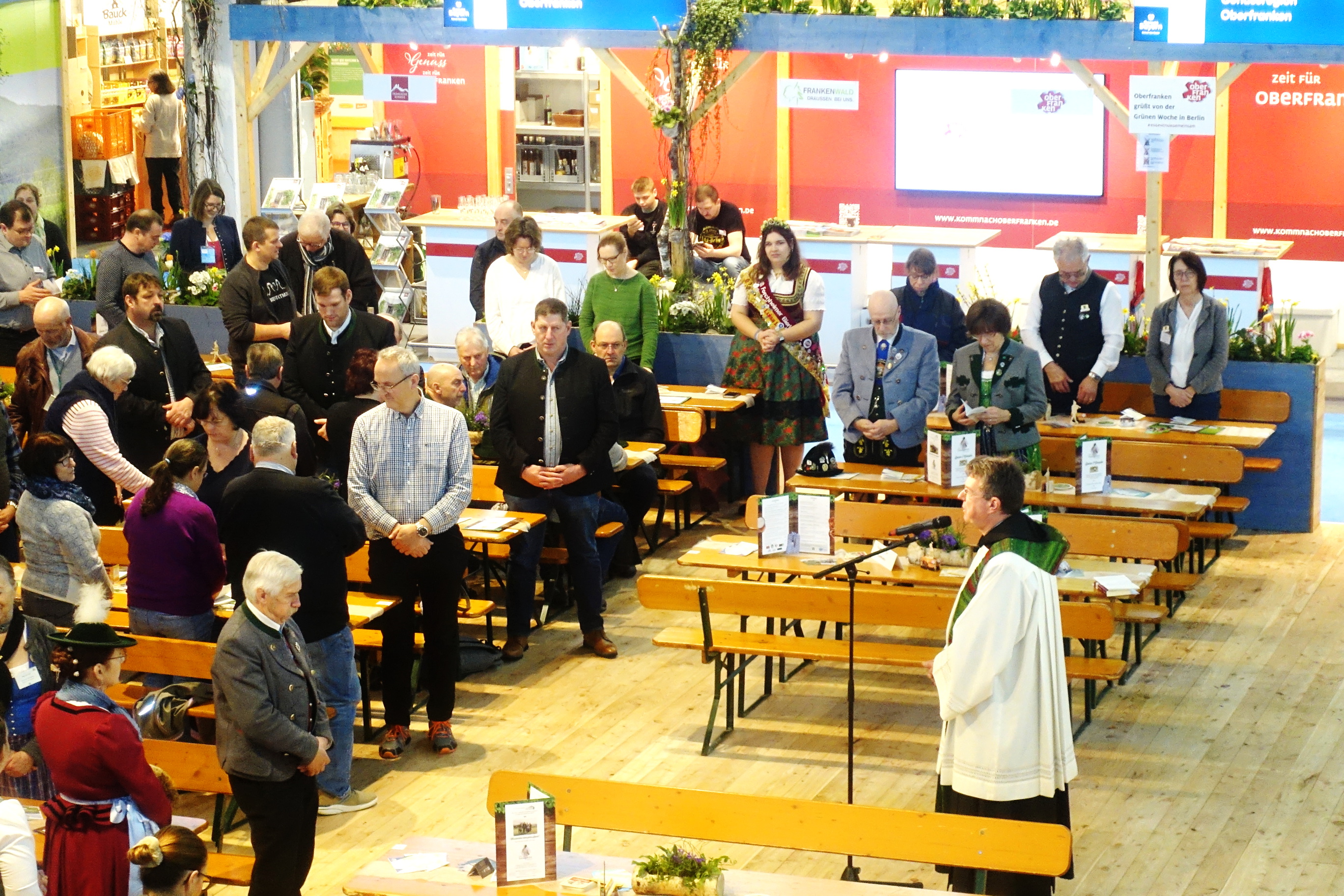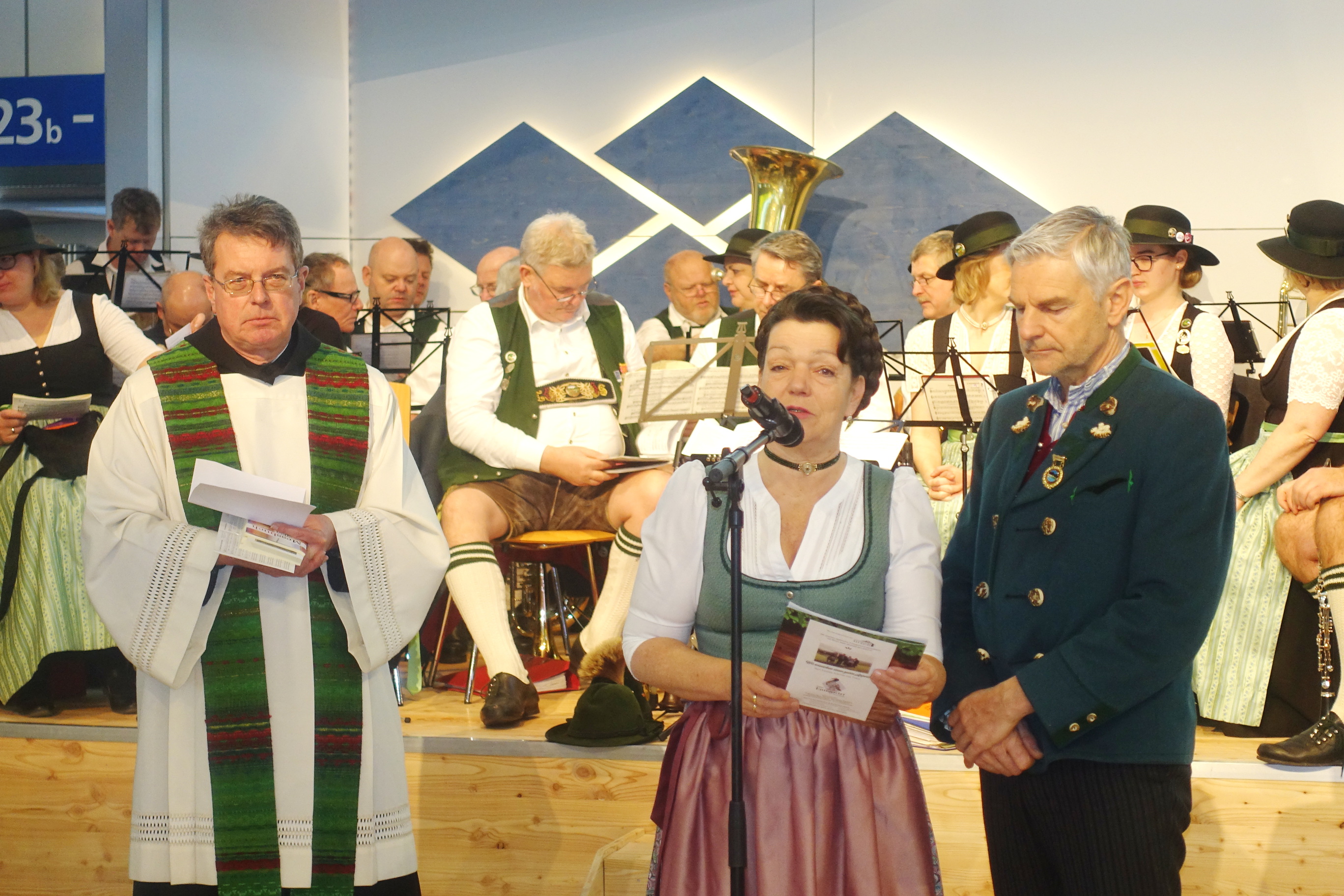 Der Gottesdienst im Berliner Messegelände ist schon seit ein paar Jahren ein wichtiger Bestandteil des zehntägigen Programmes vom Bayerischen Landwirtschaftsministeriums für Aussteller, Servicekräfte und Bühnen-Mitwirkende. Heuer gestalteten die Feier vor Beginn des Messetages die Blaskapelle Übersee-Feldwies musikalisch. Abschließend bedankte sich Pater Lukas für die Unterstützung bei der Vorbereitung und bei der Mitgestaltung bei der Musikkapelle Übersee-Feldwies, beim Feldwieser Trachtenverein sowie beim Bayerischen Trachtenverband, der in der Bayernhalle mit einem Informationsstand präsent ist und das Trachtler-Liederbuch für Gottesdienste zur Verfügung stellte.