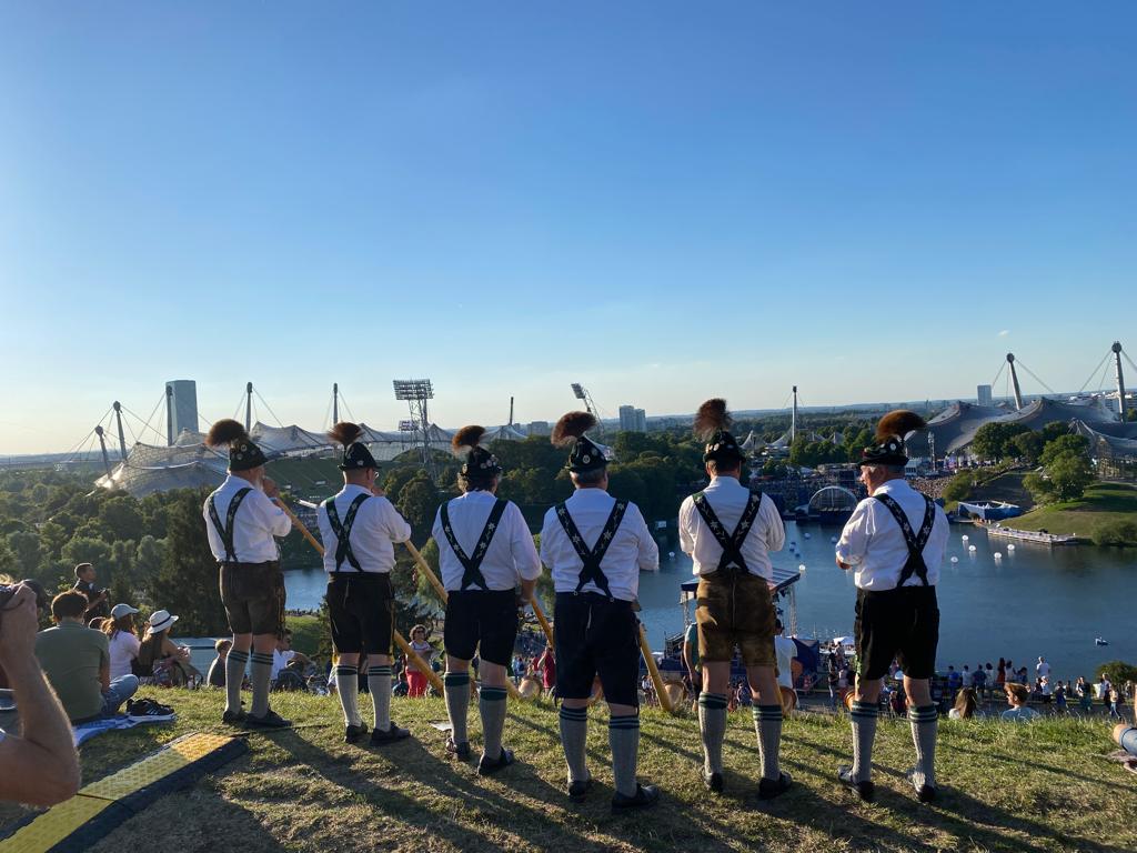 Im Rahmen der Eröffnungsfeier der ‚European Championships‘ (Europameisterschaften in neun Disziplinen) am 10. August 2022 im Münchner Olympiapark wirkten auch drei Gruppen aus den Reihen des Bayerischen Trachtenverbandes mit. So faszinierten kurz vor Sonnenuntergang oben auf dem Olympiaberg die Alphornbläser aus Altusried (Allgäuer Gauverband) die Zuschauer mit ihren beeindruckenden Klängen, gefolgt vom schneidigen Plattln der Bernauer Schuhplattler (Chiemgau-Alpenverband), die unten am Olympiasee auf der großen Bühne des ‚Central Roof‘ ihr Können demonstrierten und unter tosendem Applaus zur eigentlichen Eröffnung dieser großen Sportveranstaltung überleiteten. Beide Auftritte wurden im ZDF-Livestream übertragen und die vielen Zuschauer vor Ort und an den Bildschirmen zeigten sich begeistert von den Darbietungen der Trachtler. Abgerundet wurde der ‚boarische‘ Block von der Musikkapelle Bernau (Chiemgau-Alpenverband), die zusammen mit zahlreichen anderen Gruppen den Olympiapark zum Klingen brachte und damit den passenden Bogen spannte zu ‚50 Jahre Olympische Spiele 1972 in München‘, als die damaligen Musikanten dieser Blaskapelle bei der Eröffnungsfeier der Olympischen Spiele 1972 im Olympiastadion gemeinsam mit der Blaskapelle Ruhpolding die ‚Vereinigten-Kapelle‘ der damals ‚Vereinigten Bayerischen Trachtenverbände‘ bildeten und die Schuhplattler bei ihrem fulminanten Auftritt musikalisch begleiteten.