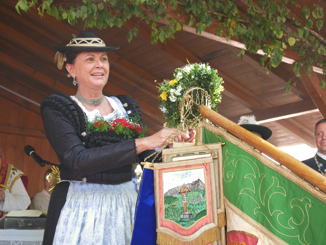 Begleitet von Prologen ihrer Vortänzerinnen bekamen die drei ausrichtenden Vereine, der G.T.E.V. „D’Gmiadlichn“ Hochbergler e.V., der G.T.E.V. „Eschenwald“ Rettenbach e.V. und der G.T.E.V. „Trauntal“ Traunstein e.V., die als Festgemeinschaft Gaufest Traunstein 2025 Ausrichter des diesjährigen Gaufestes sind, jeweils ein Erinnerungsband überreicht. Gestiftet wurden die Bänder von Bayerns Landtagspräsidentin Ilse Aigner, Siegfried Walch, dem ehemaligen Landrat des Landkreises Traunstein und jetzigem Mitglied des Deutschen Bundestages und Dr. Christian Hümmer, Oberbürgermeister und Schirmherrn des Gaufestes in Traunstein.