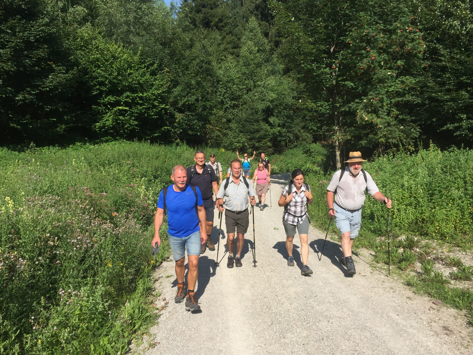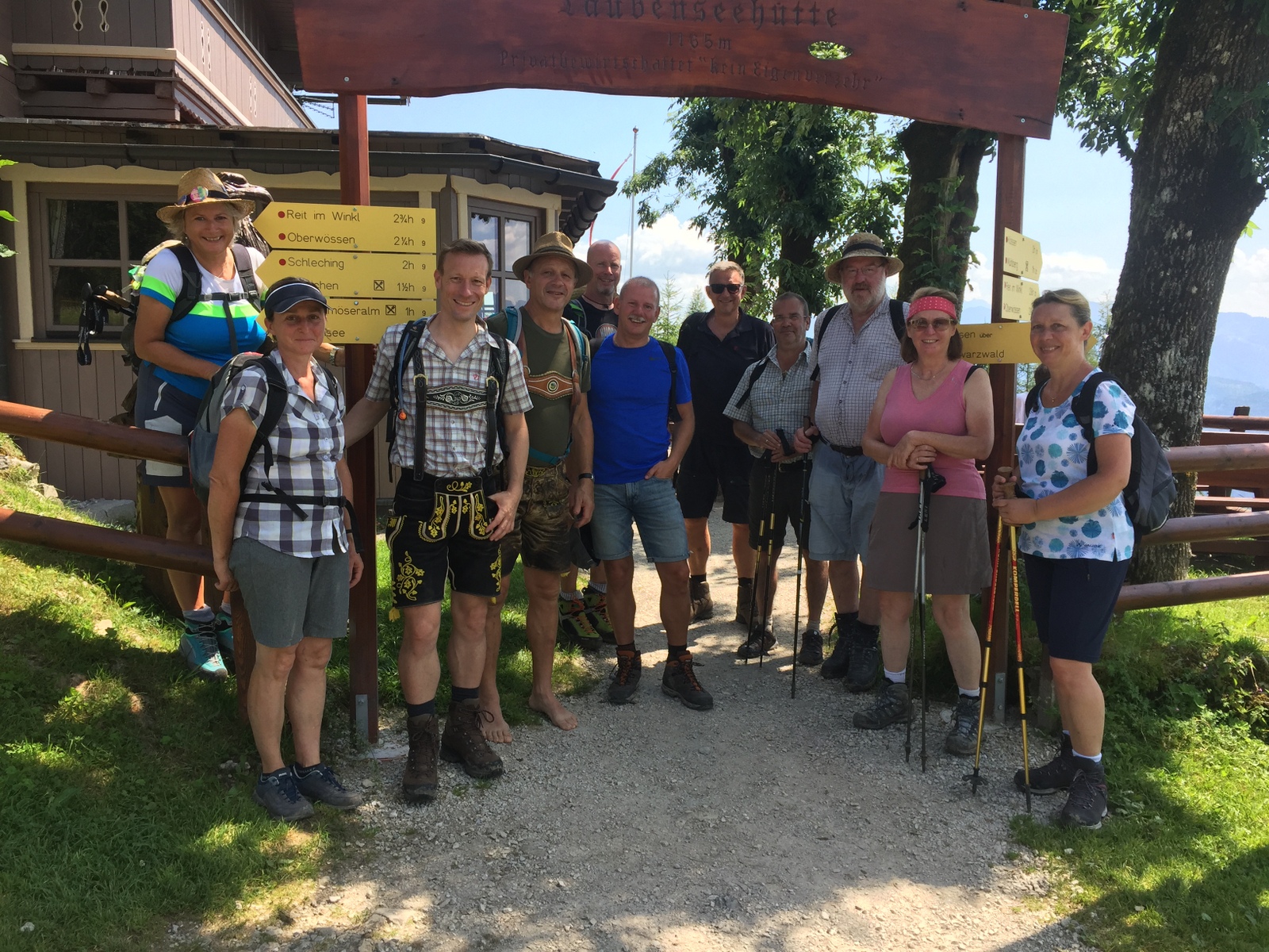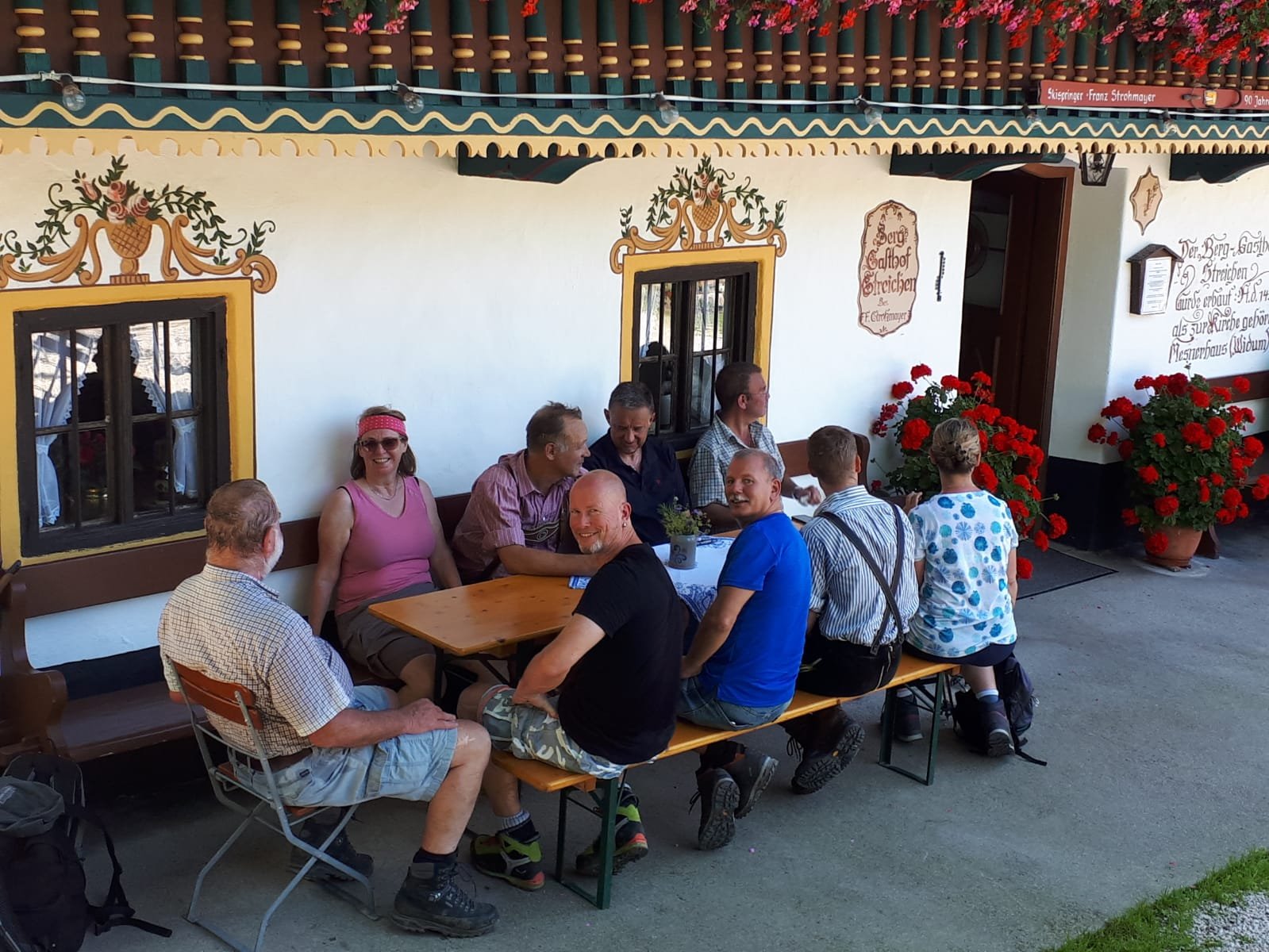 Heuer war es dann wieder soweit. Alle waren sich einig, dass auch Corona dem keinen Abbruch tun sollte. Doch es waren eher hochsommerliche Temperaturen, die den Bergmarsch in Frage stellten. Kurzerhand schlug Miche eine leichte Tour im Wald mit Abkühlung im Taubensee vor. So trafen wir uns in Schleching an der Kirche und mit dem Auto ging es zum Start am Wanderparkplatz unterhalb vom Berggasthof Streichen. Wir sieben Münchner wurden heuer vom Huber Miche, seiner Frau Claudia, der Hilger Lisi und dem Max Winklmair aus Rottau begleitet. Es folgte nach wenigen Höhenmetern die erste Einkehr in der Chiemhauser Alm und anschließend das gemeinsame Mittagessen in der Taubenseehütte oberhalb von Kössen. Danach kam in der Mittagshitze die von allen ersehnte Abkühlung im Taubensee. So ließen sich auch die hochsommerlichen Temperaturen um die 30 Grad gut ertragen. Erfrischt brachen alle zur letzten Etappe auf – Ziel: Berggasthof Streichen. Franz und Anderl Strohmayr begrüßten uns dort. Manche probierten die berühmte Schwammerlsuppe, anderen war dann doch eher nach weiterer Abkühlung in Form eines üppigen Erdbeer-Eisbechers oder einer Halbe Bier.