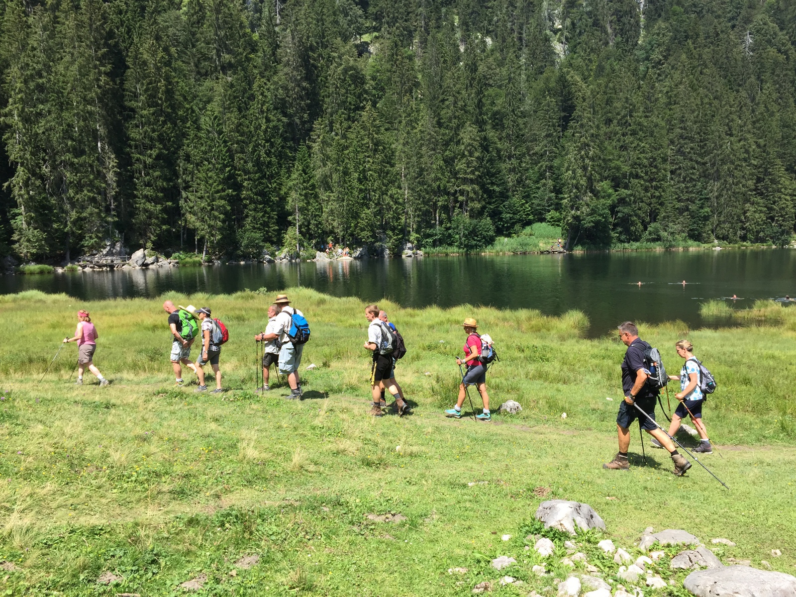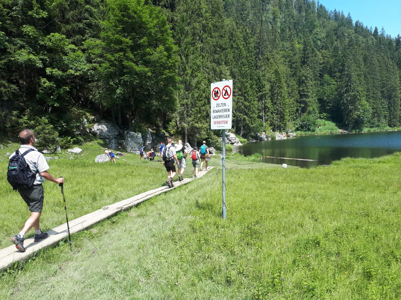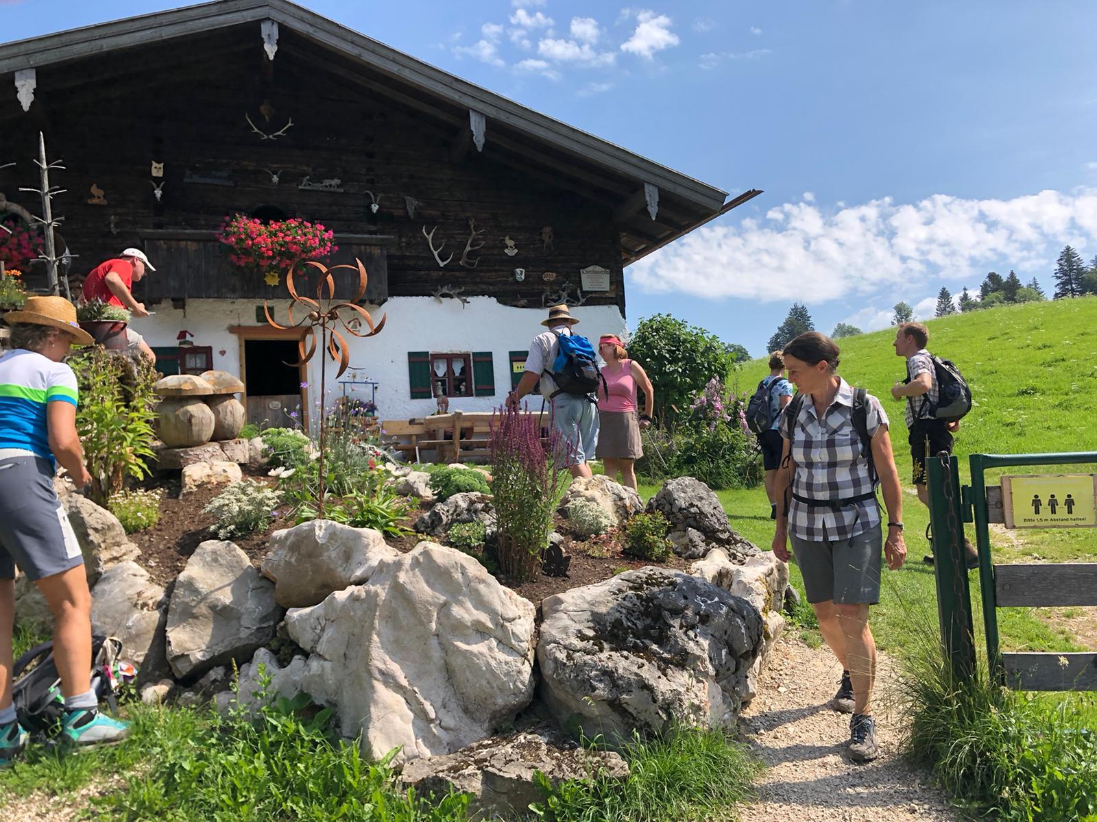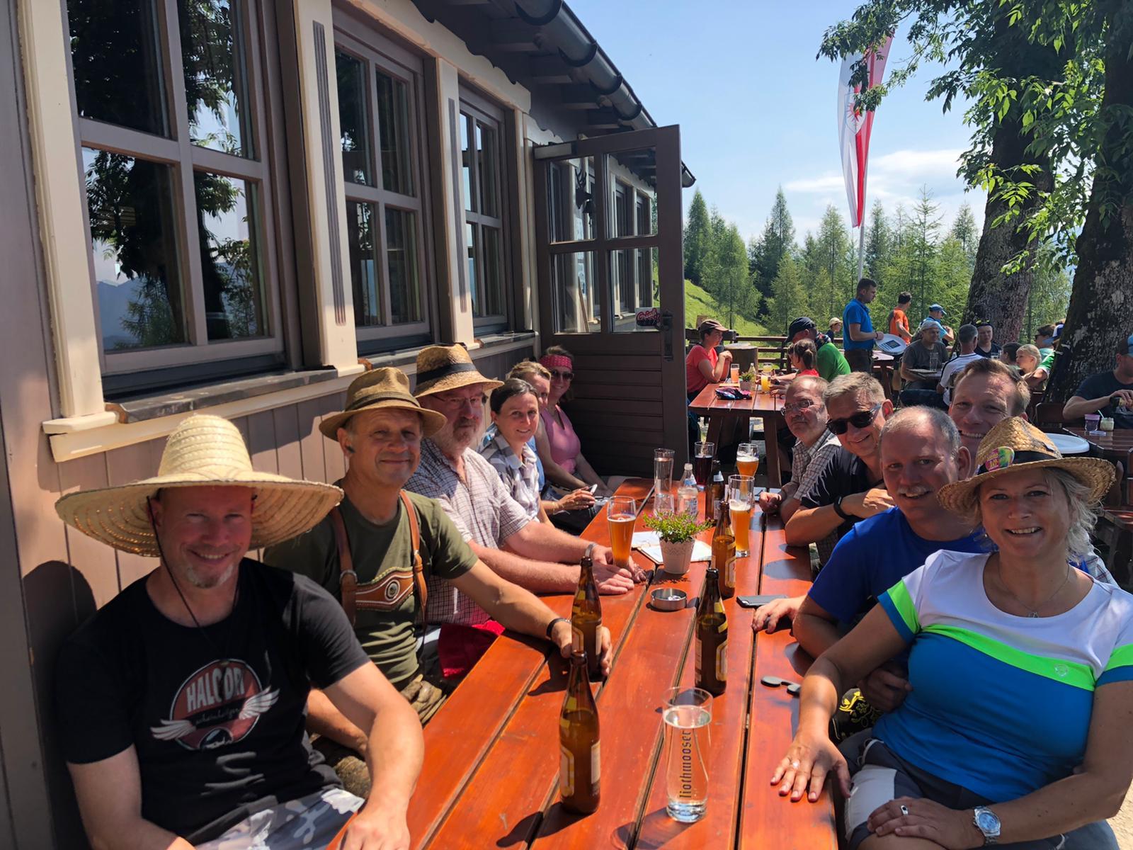 Heuer war es dann wieder soweit. Alle waren sich einig, dass auch Corona dem keinen Abbruch tun sollte. Doch es waren eher hochsommerliche Temperaturen, die den Bergmarsch in Frage stellten. Kurzerhand schlug Miche eine leichte Tour im Wald mit Abkühlung im Taubensee vor. So trafen wir uns in Schleching an der Kirche und mit dem Auto ging es zum Start am Wanderparkplatz unterhalb vom Berggasthof Streichen. Wir sieben Münchner wurden heuer vom Huber Miche, seiner Frau Claudia, der Hilger Lisi und dem Max Winklmair aus Rottau begleitet. Es folgte nach wenigen Höhenmetern die erste Einkehr in der Chiemhauser Alm und anschließend das gemeinsame Mittagessen in der Taubenseehütte oberhalb von Kössen. Danach kam in der Mittagshitze die von allen ersehnte Abkühlung im Taubensee. So ließen sich auch die hochsommerlichen Temperaturen um die 30 Grad gut ertragen. Erfrischt brachen alle zur letzten Etappe auf – Ziel: Berggasthof Streichen. Franz und Anderl Strohmayr begrüßten uns dort. Manche probierten die berühmte Schwammerlsuppe, anderen war dann doch eher nach weiterer Abkühlung in Form eines üppigen Erdbeer-Eisbechers oder einer Halbe Bier.