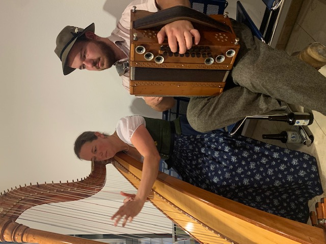 Die anwesenden Gäste aus den Ebersberger Vereinen, dem Gauausschuss sowie die 2. Bürgermeisterin aus Grafing, Frau Offenburger und der Bairer Bürgermeister Martin Riedl wurden beim Betrachten der verschiedenen Gaufeste bestens unterhalten von unserer "Gauausschussmusi" (Bettina Hanfstingl an der Harfe & Sebastian Mühlhuber an der Ziach).