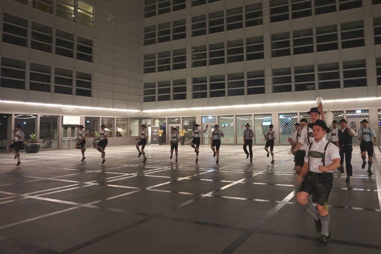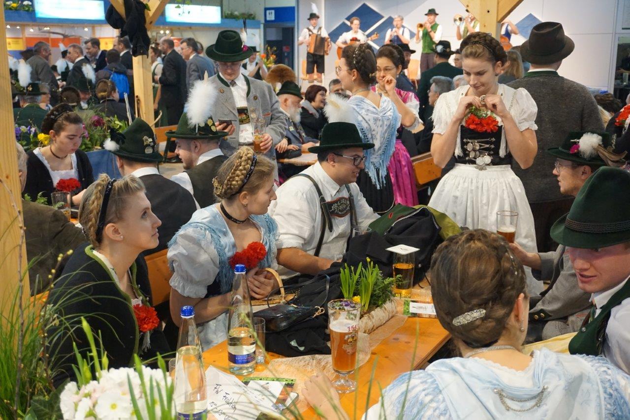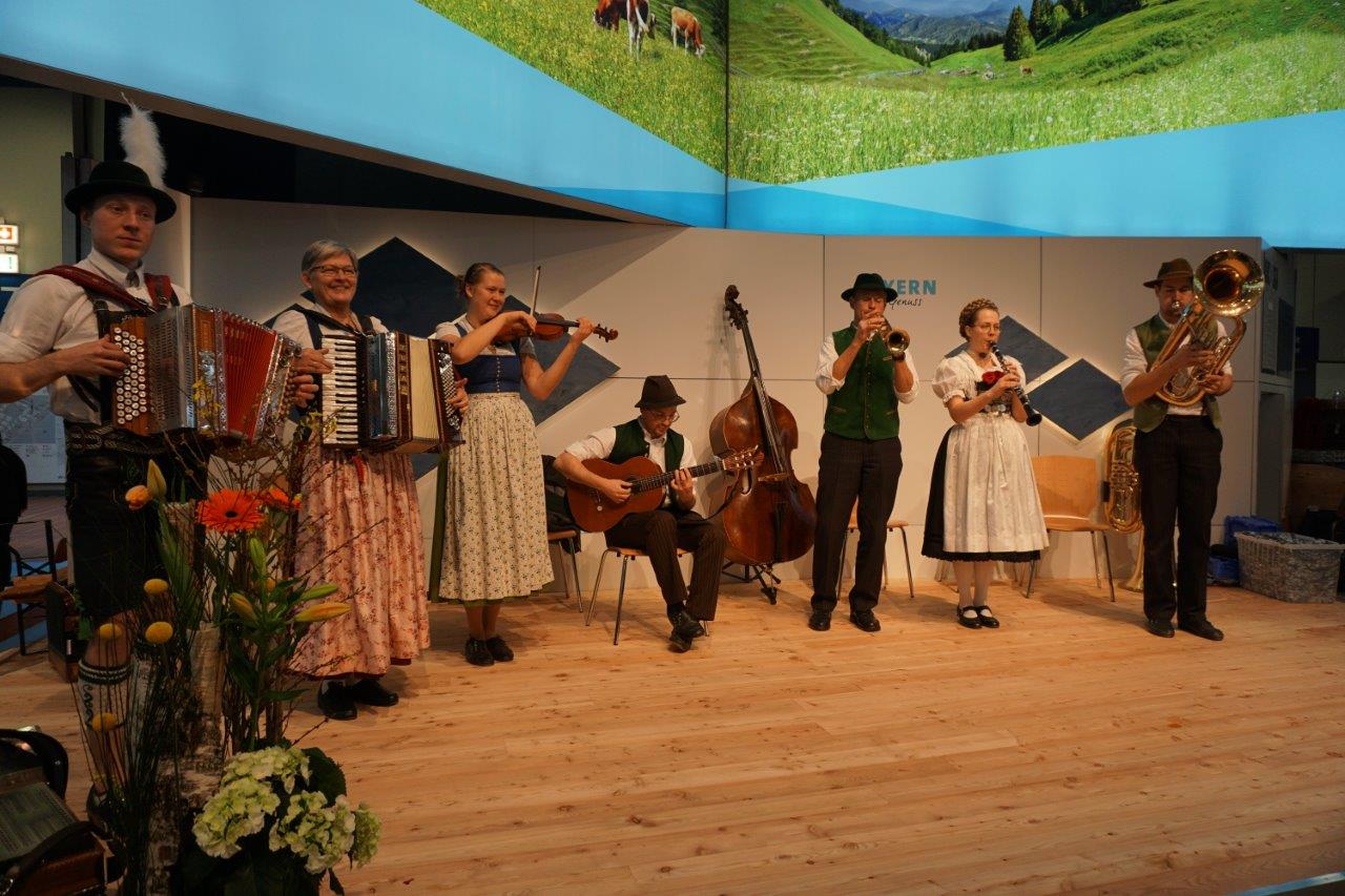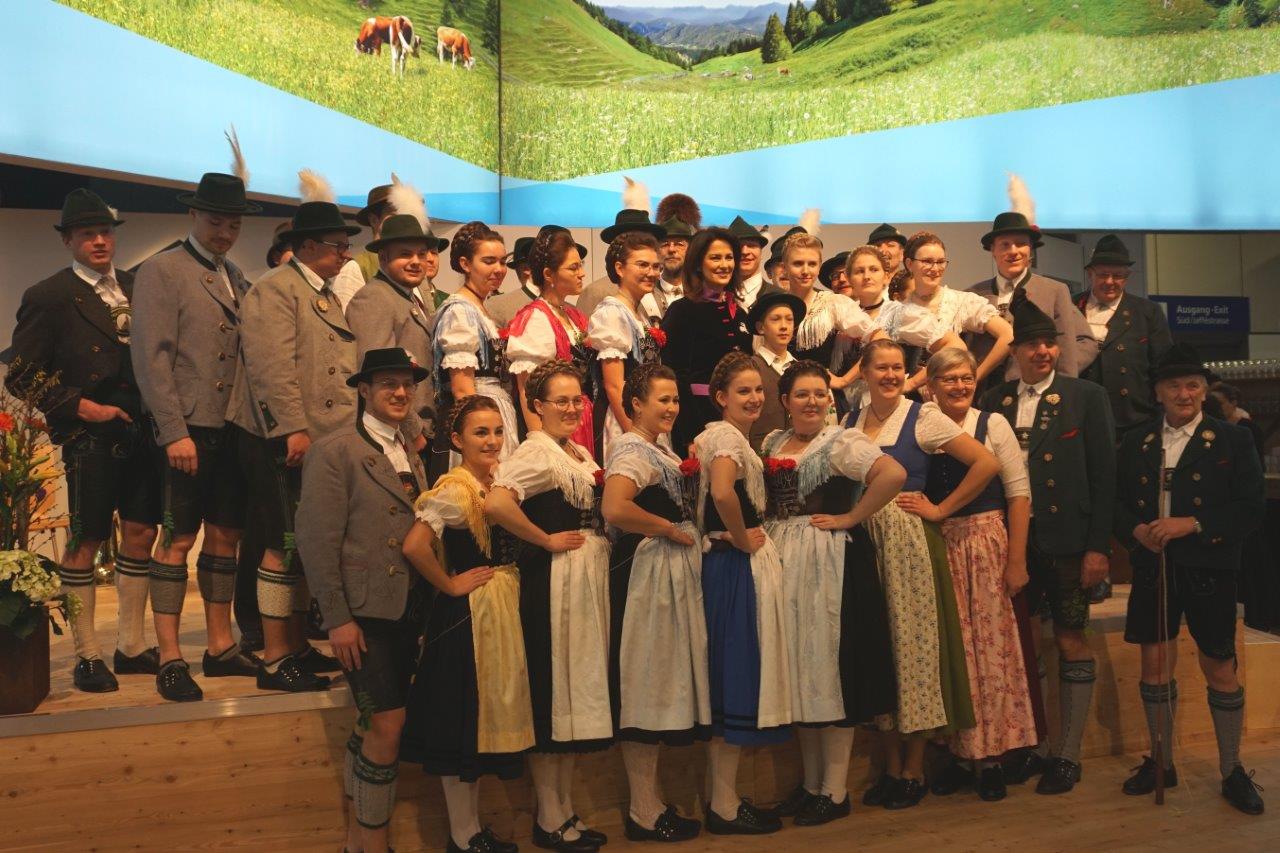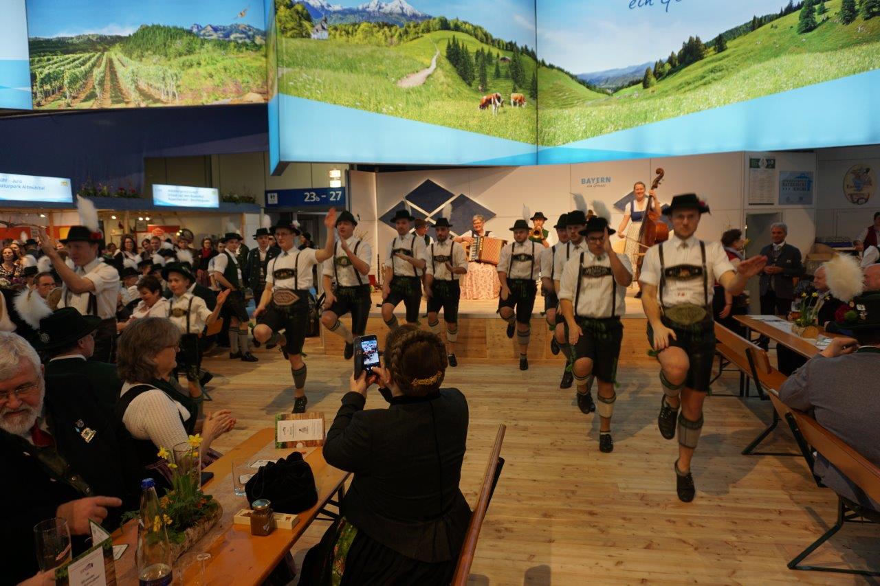 Am nächsten Tag war der Auftritt auf der Grünen Woche angesagt. Bereits um 08:00 Uhr war der erste Auftritt geplant. Deshalb fuhr der Bus bereits um 07:15 Uhr vom Hotel ab, so dass einige Teilnehmer schon um 05:00 Uhr aufstehen mussten, um sich für die Grüne Woche herzurichten. Dort angekommen waren wir zunächst gespannt, wie das mit den online-Karten funktioniert, da heuer zum ersten Mal ein Zugang zur Grünen Woche nur mit online-Tickets möglich war. Von 08:00 bis 11:00 Uhr unterbrochen durch eine Stunde Pressekonferenz gestalteten nun die Trachtler, Schnoitzer und Musikanten vom Gebiet Inn-Salzach und dem Trachtenverein Teisendorf, der heuer das Gaufest ausrichtet, das Programm. Sie begeisterten die Zuschauer mit der Olympiapolka, der Ambosspolka, dem Mühlradl und dem Sterntanz. Dazwischen spielte die Familienmusik Ernst und gaben die Schnoitzer aus Burgkirchen, Reischach und Töging ihr Bestes. Auch Landrat Max Heimerl war vom Programm begeistert und stand für ein Gruppenfoto zur Verfügung. Nach den Auftritten konnten sich die Teilnehmer die Aussteller auf der Grünen Woche anschauen und auch Einiges probieren. Im Maximilians, wo das Abendessen eingenommen wurde, gab es auch noch einige Auftritte.