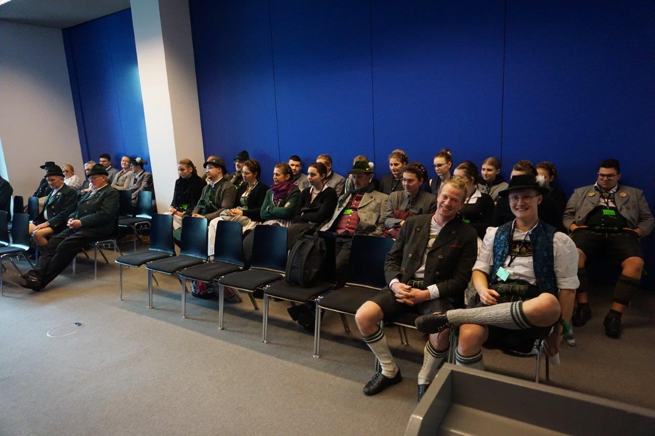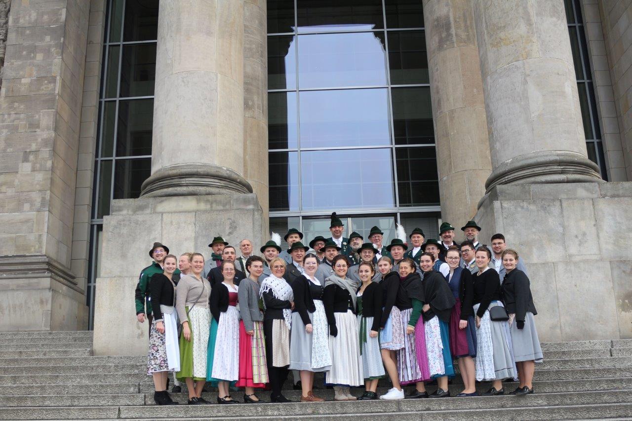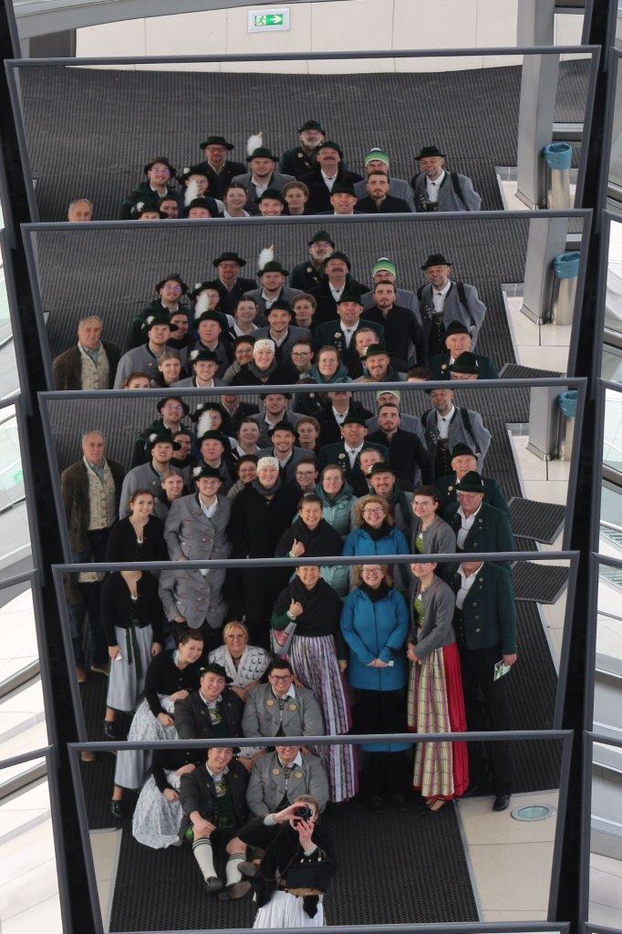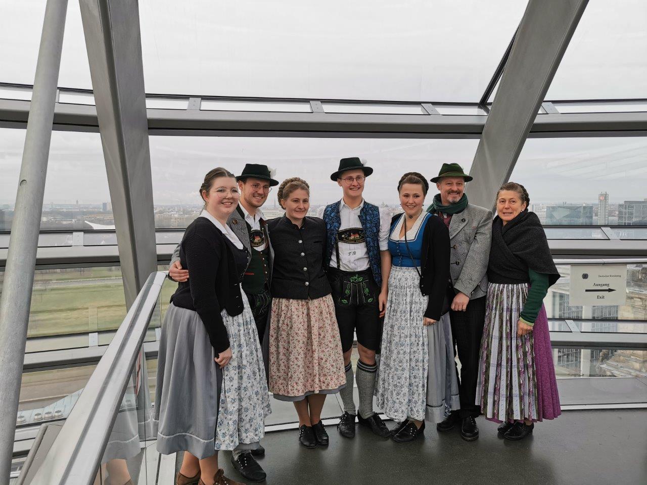 Am Samstag fuhr die Reisegruppe zum Bundestag. Auf der Besuchertribüne wurde den Teilnehmern zunächst die Geschichte des Reichstagsgebäudes vermittelt und dann der Plenarsaal erklärt. Anschließend hielt Frau Benz, eine Mitarbeiterin vom Abgeordneten Stephan Mayer, einen Vortrag und beantwortete sehr ausführlich die Fragen der Teilnehmer. Danach ging es mit dem Aufzug zur gläsernen Kuppel. Bis zur Aussichtsplattform musste man zu Fuß gehen. Zur Belohnung gab es einen wunderbaren Rundblick über die Stadt. Das Abendessen wurde im Gasthaus Krombach eingenommen, wo die Familie Ernst zur Unterhaltung aufspielte und einige aktive Buam ein paar Plattler zeigten. Da es für die Aktiven noch zu früh für die Heimfahrt ins Hotel war, statteten sie noch einen Besuch im Europacenter ab, wo sie wieder das Mühlradl zeigten.