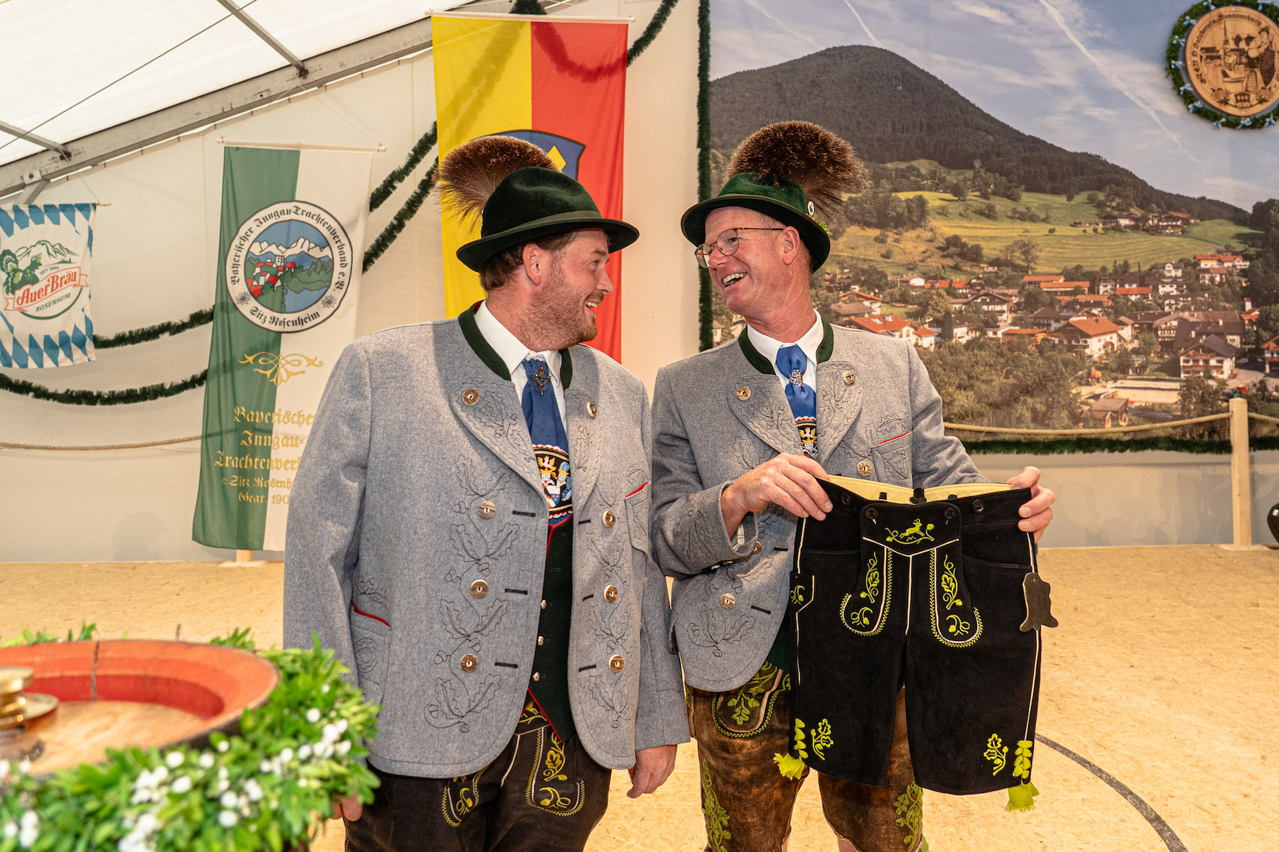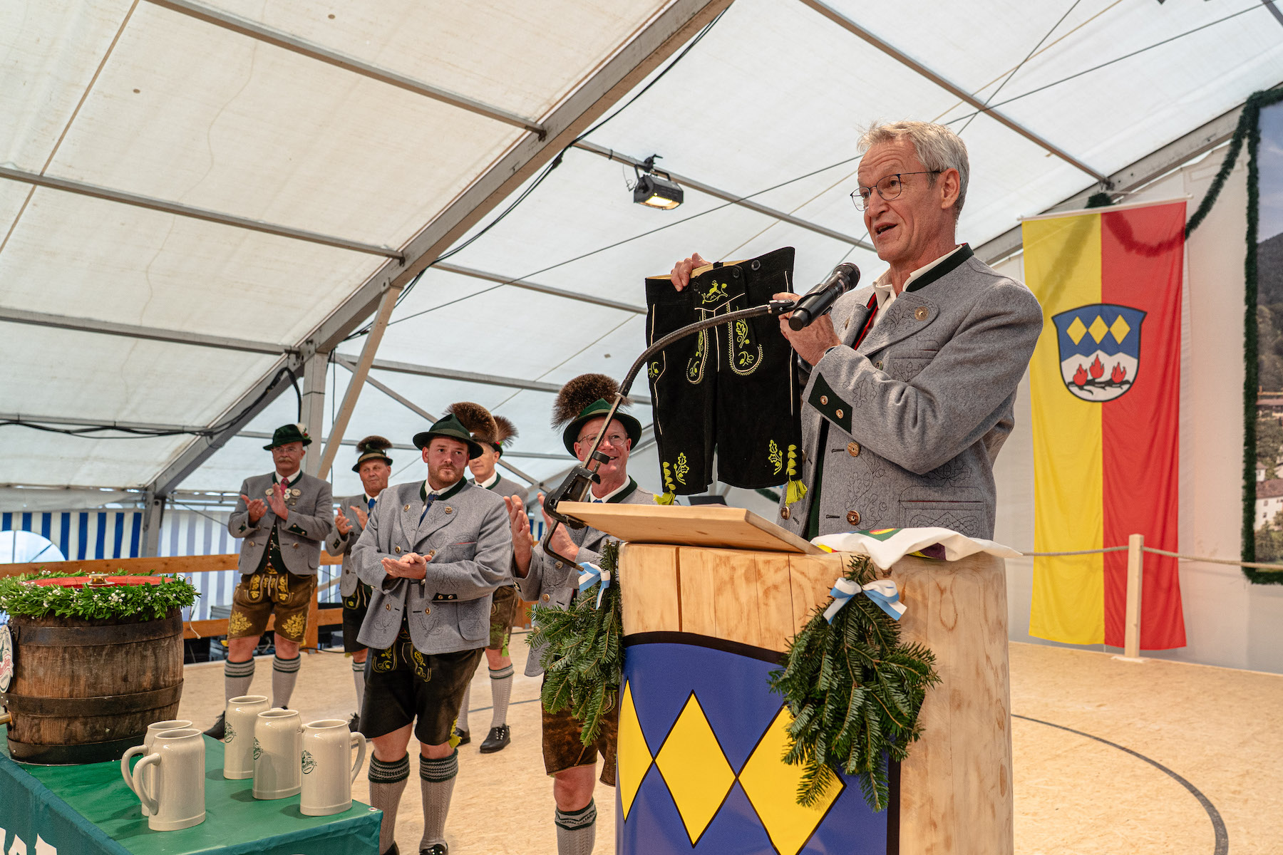 Einen kleinen Beitrag zur Nachwuchsförderung leistete auch Bürgermeister Matthias Jokisch, der Schirmherr des Gaufestes. Sein Gastgeschenk: eine Lederhose, passend fürs Alter von etwa zwölf bis vierzehn Jahren. Denn ein frühes aktives Dabeisein beim Trachtenverein soll keineswegs daran scheitern, dass die Eltern ihre Kinder nicht trachtlerisch einkleiden könnten, weshalb das Gwand für die Kinder auch verliehen wird.