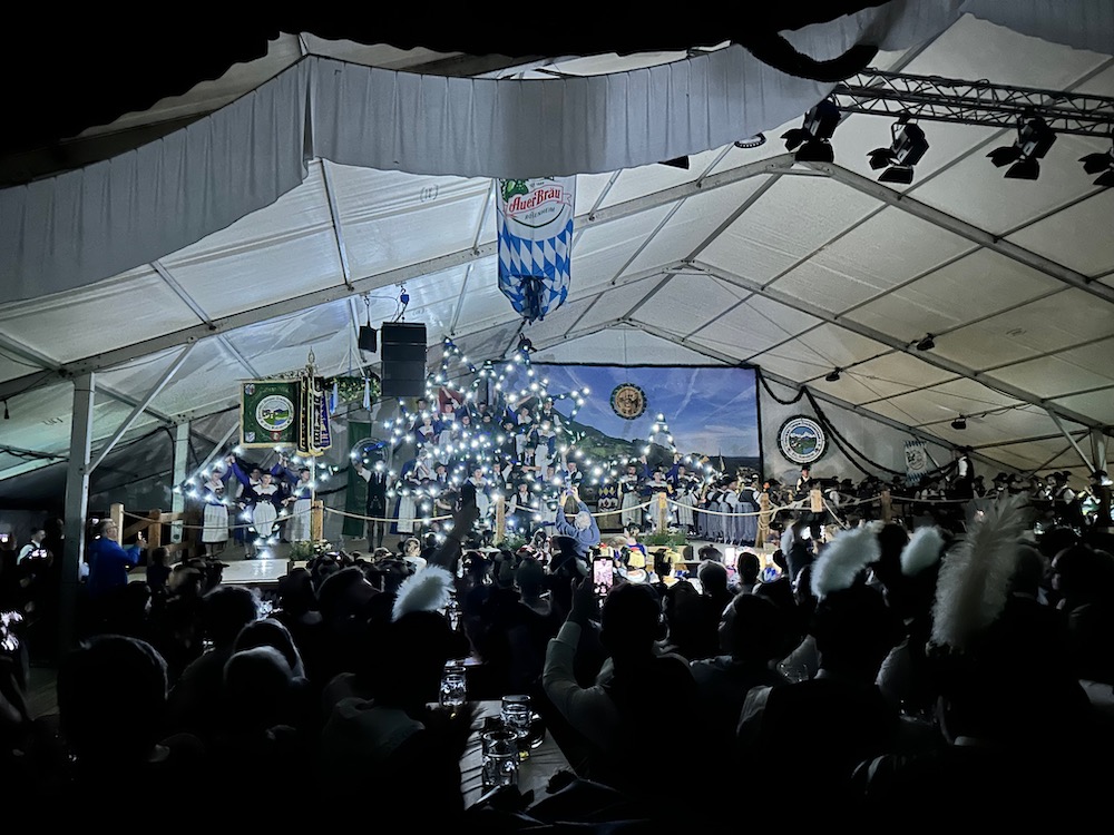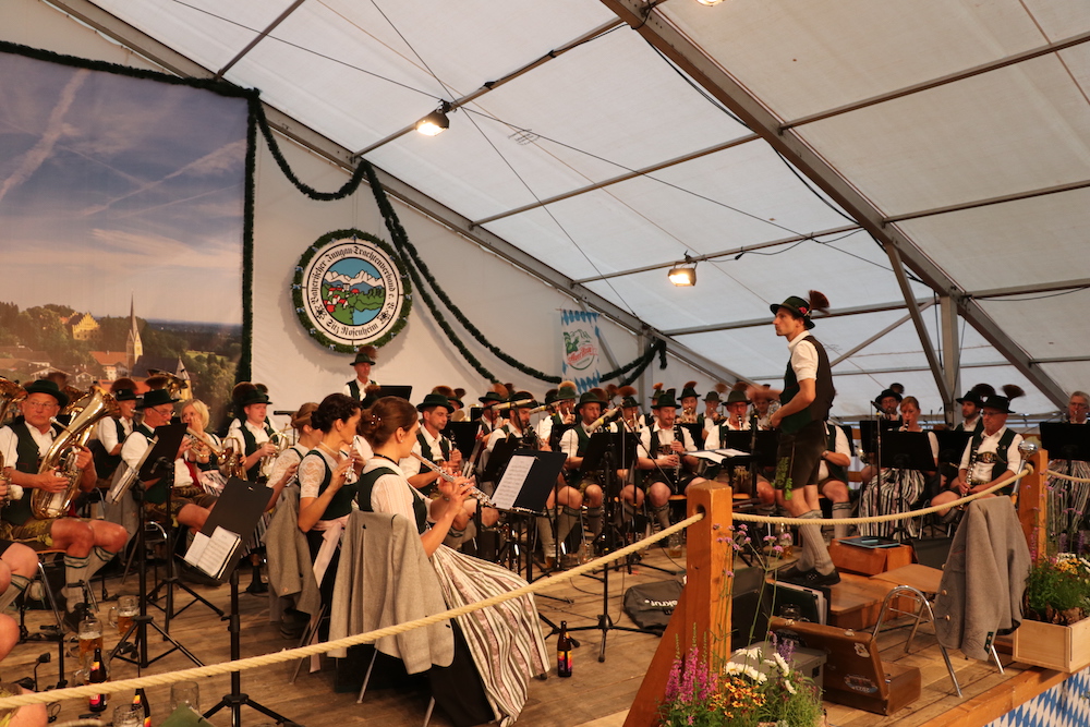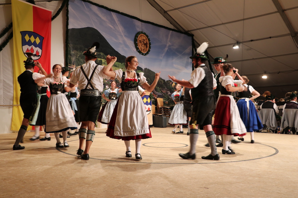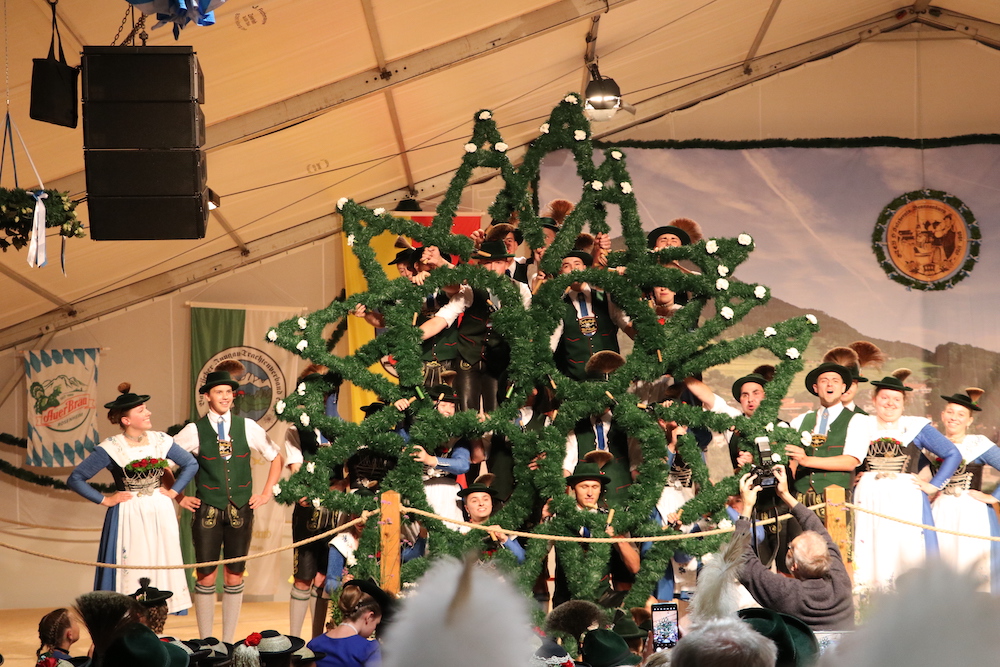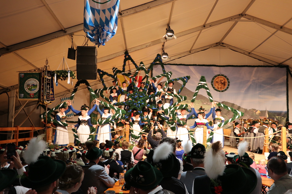 Im Anschluß sang ein Kinderchor, der aus den Plattlergruppen des Vereins besteht, zwei Lieder in baierischer Mundart, bevor der Verein die "Olympia Sternpolka" zeigte. Auch die Gaujugendgruppe zeigte ihr Können mit dem "Innsbrucker" (Plattler) und dem "Gaujugendgruppentanz". Neben den Goaßlschnalzern des Festvereins spielte ein Bläserensemble auf. Außerdem spielte eine Gruppe aus 16 Ziacherern von jung bis alt zwei Stücke. "Die haben nur ein paar Mal geprobt und können nur zwei Stücke" wurde sie vorgestellt: diese zwei Stücke waren aber trotz der kurzen Probezeit ein echter Genuß! Die beiden Patenvereine der Brannenburger "D'Jenbachtaler" Bad Feilnbach (Gau I) und "D'Kaltentaler" Pang (Inngau) zeigten den "Edelweiß Tanz" bzw. den "Kronentanz" - und freuten sich sichtlich, daß sie bei ihrem Göd auftreten konnten. Natürlich durfte auch die Gaugruppe nicht fehlen: sie zeigten den "Marquardstoana" (Marschplattler), "d'Lahn" (Plattler) und den "2012er". Ein Gemeinschaftsplattler und der abschließende "Sterntanz" des Festvereins rundeten das Programm ab. Ein Höhepunkt des "Sterntanzes" war mit Sicherheit, dass die Lichter im Zelt ausgingen - und die Sterntanzbögen zu Leuchten anfingen. Dieser moderne Aspekt des Sterntanzes passte auch gut zu einem Gedicht, daß die Ansager vorgetragen hatten: sie ließen die Künstliche Intelligenz (KI) ein Gedicht über das Platteln verfassen. "Das war jetzt arg leer und wie wenn es von jemand geschrieben wäre, der noch nie in Bayern war" so Sepp Bliemetsrieder und ließ den Vergleich mit einem Gedicht, daß von einem Plattler übers Platteln geschrieben wurde, folgen. Besonders freute sich 2.