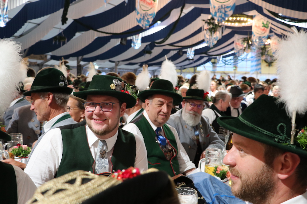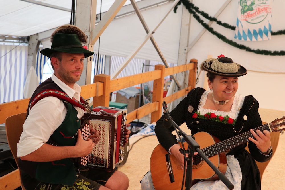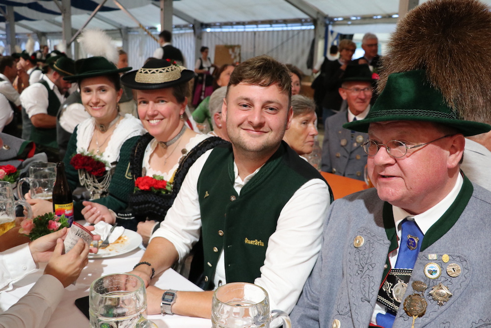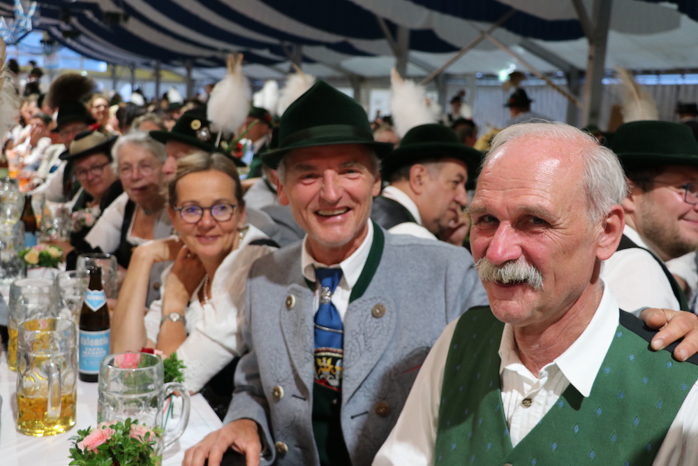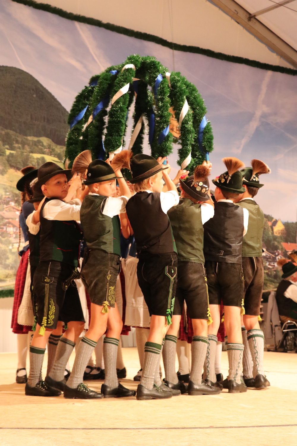 Im Anschluß sang ein Kinderchor, der aus den Plattlergruppen des Vereins besteht, zwei Lieder in baierischer Mundart, bevor der Verein die "Olympia Sternpolka" zeigte. Auch die Gaujugendgruppe zeigte ihr Können mit dem "Innsbrucker" (Plattler) und dem "Gaujugendgruppentanz". Neben den Goaßlschnalzern des Festvereins spielte ein Bläserensemble auf. Außerdem spielte eine Gruppe aus 16 Ziacherern von jung bis alt zwei Stücke. "Die haben nur ein paar Mal geprobt und können nur zwei Stücke" wurde sie vorgestellt: diese zwei Stücke waren aber trotz der kurzen Probezeit ein echter Genuß! Die beiden Patenvereine der Brannenburger "D'Jenbachtaler" Bad Feilnbach (Gau I) und "D'Kaltentaler" Pang (Inngau) zeigten den "Edelweiß Tanz" bzw. den "Kronentanz" - und freuten sich sichtlich, daß sie bei ihrem Göd auftreten konnten. Natürlich durfte auch die Gaugruppe nicht fehlen: sie zeigten den "Marquardstoana" (Marschplattler), "d'Lahn" (Plattler) und den "2012er". Ein Gemeinschaftsplattler und der abschließende "Sterntanz" des Festvereins rundeten das Programm ab. Ein Höhepunkt des "Sterntanzes" war mit Sicherheit, dass die Lichter im Zelt ausgingen - und die Sterntanzbögen zu Leuchten anfingen. Dieser moderne Aspekt des Sterntanzes passte auch gut zu einem Gedicht, daß die Ansager vorgetragen hatten: sie ließen die Künstliche Intelligenz (KI) ein Gedicht über das Platteln verfassen. "Das war jetzt arg leer und wie wenn es von jemand geschrieben wäre, der noch nie in Bayern war" so Sepp Bliemetsrieder und ließ den Vergleich mit einem Gedicht, daß von einem Plattler übers Platteln geschrieben wurde, folgen. Besonders freute sich 2.