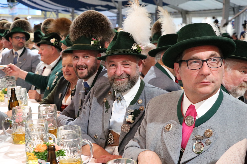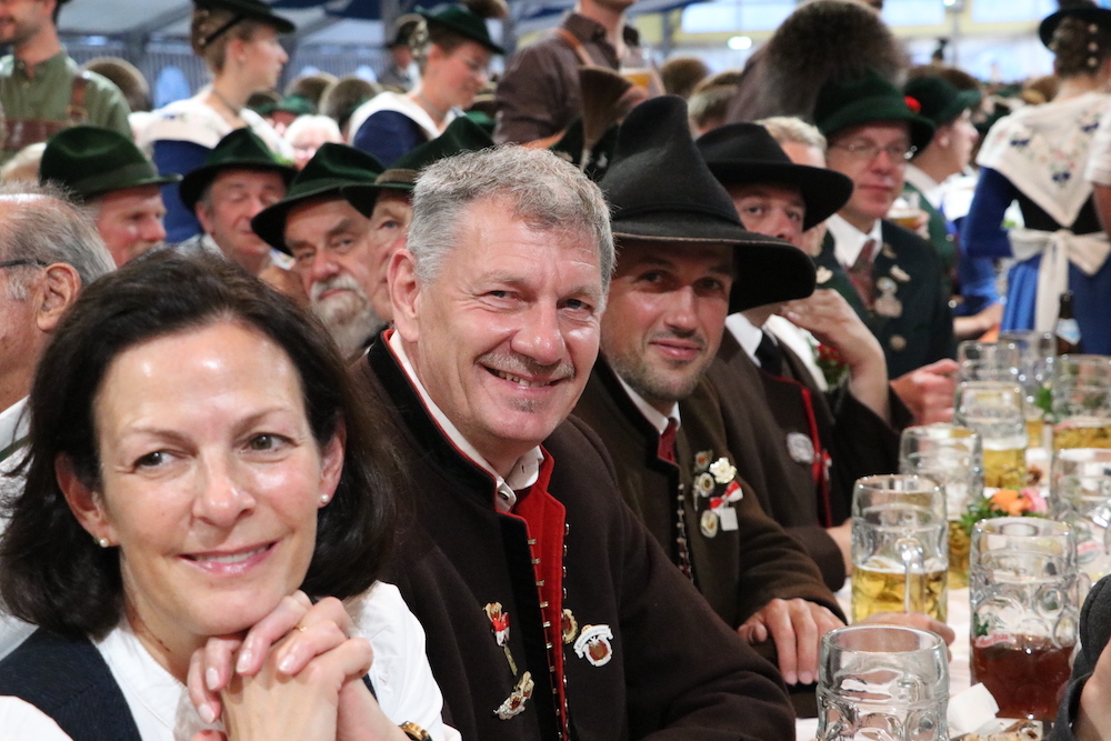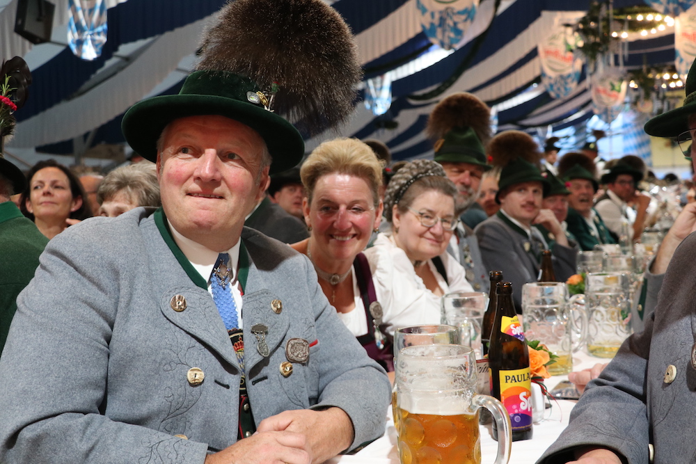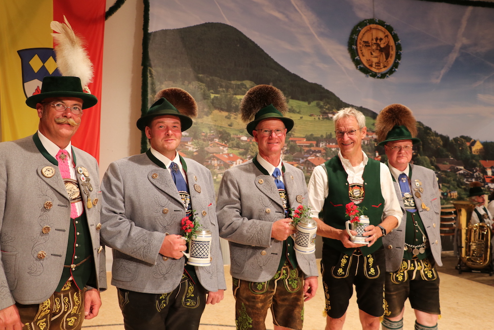 Gauvorstand Markus Kronberger in seiner Ansprache, daß er neben den zahlreich erschienenen Trachtlern aus dem Gaugebiet und Mitgliedern der Ortsvereine auch die Vertreter der beiden Patengaue begrüßen durfte: so war vom Chiemgau-Alpenverband Gauvorstand Thomas Hiendl mit mehreren Ausschußmitgliedern vor Ort. Auch Michi Hauser, Gauvorstand beim Gauverband I, bei dem der Bayerische Inngau-Trachtenverband im Vorjahr die Patenschaft über die neue Gaustandarte übernommen hat, war mit etlichen Ausschußmitgliedern anwesend. Außerdem war der Oberlandler Gauverband durch Gaukassier Andreas Kirchhuber, der Unterinntaler Trachtenverband aus Tirol mit Obmann Markus Nachtschatten und die Gebirgsschützen durch Günter Reichelt vertreten. Auch Günter Frey vom Bayerischen Trachtenverband war mit etlichen Sachgebietsmitgliedern und Andreas Wachs sowie Stephanie Perfler von der Bayerischen Trachtenjugend vor Ort. Außerdem konnte Markus Kronberger Landrat Otto Lederer, die beiden Landtagsabgeordneten Sebastian Friesinger und Sepp Lausch sowie Christian Glas vom Bayernbund begrüßen. Markus Kronberger nutzte seine kurze Ansprache außerdem, um auf den Festverein zu blicken: nur wenige Monate nach dem 1. Weltkrieg wurde der Verein am 3.3.1920 gegründet. Heute hat er über 500 Mitglieder und damit ein sehr gesundes Fundament. Nach 1931 und 1975 richtet er nun zum dritten Mal das Gaufest des Bayerischen Inngau-Trachtenverbandes aus. "Die Sulzbergler Brannenburg leben die Trachtensache: sie verbinden dabei Gemeinschaft und Gemütlichkeit. Ihr feiert keine Fest für die Zuschauer, sondern fürs Herz" betonte Markus Kronberger und lobte die hervorragende und vertrauensvolle Zusammenarbeit im Vorfeld des Gaufestes. Wie es der Brauch ist, übergab er zusammen mit 1. Gauvorstand Pankraz Perfler als Dank Bierkrügerl an den Brannenburger Bürgermeister Matthias Jokisch, den Festleiter Markus Vogt und den 1. Vorstand Peter Zaggl.