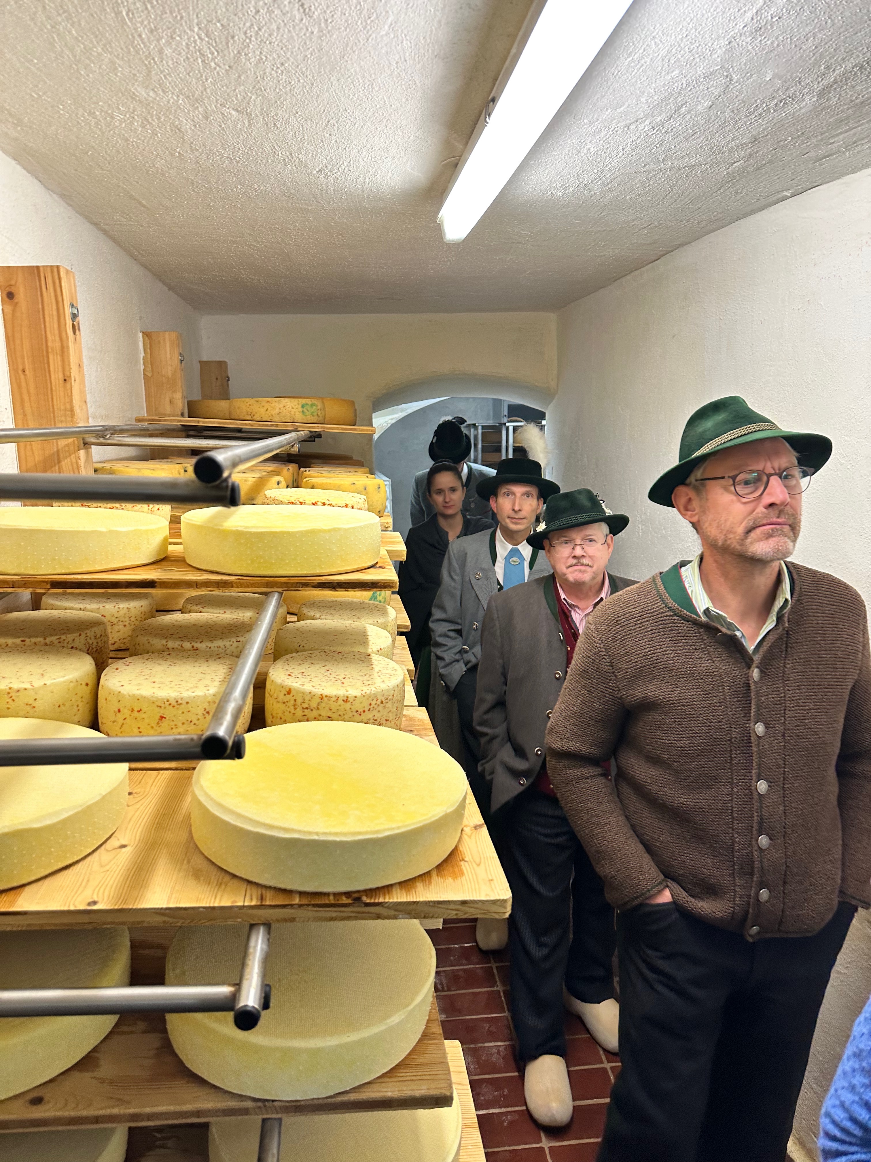 "Schuhe aus" hieß es für die Teilnehmer der Brauchtumswarteversammlung am Donnerstag, 14. November in der Hofkäserei Stroblberg (Baiern): für die Besichtigung der Hofkäserei bekamen alle (nicht sonderlich) bequeme Holzschuhe vom Hausherrn, um keinen Straßendreck in die Räumlichkeiten zu tragen.