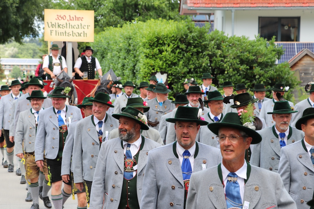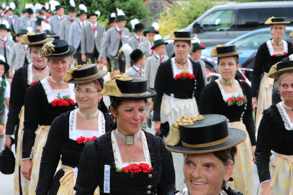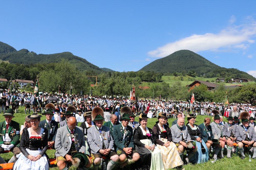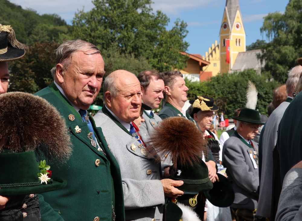 So machten sich bereits 4195 Trachtler am Sonntag vormittag um 9:15 Uhr über zwei verschiedene Strecken auf den Weg zum Kirchplatz, auf dem um 10:00 Uhr zunächst 1. Gauvorstand Pankraz Perfler die Erschienenen begrüßte. Besonders freute er sich, daß neben den zahlreichen Trachtltern viele Ehrengäste aus der Trachtenbewegung und der Politik vor Ort waren: Landrat Otto Lederer, die stellvertretende Landrätin aus Ebersberg Magdalena Förstl, der stellvertretender Landrat aus Pfarrkirchen Kurt Vallet, der Oberbürgermeister der Stadt Rosenheim Andreas Merz sowie der Bürgermeister der Gemeinde Brannenburg Matthias Jokisch. Auch Landtagspräsidentin Ilse Aigner hat ihr Kommen für den Festzug am Nachmittag angekündigt und ließ sich vormittags bestens vertreten von den Abgeordneten Daniel Artmann MdL, Sebastian Friesinger MdL, Thomas Huber MdL und Josef Lausch MdL. Der Bezirkstag war mit Marianne Loferer und Barbara Stein vertreten. Bei den trachtlerischen Ehrengästen konnte Pankraz Perfler den 1. Gauvorstand des Chiemgau-Alpenverbands, Thomas Hiendl ebenso wie den stellvertretenden Gauvorstand des Gauverband I, Fred Gehmacher begrüßen, die beide mit einer großen Abordnung gekommen waren. Auch der Oberpfälzer Gauverband war mit seinem 2. Gauvorstand Tobias Lehner und einer Abordnung vor Ort. Vom Tiroler Landestrachtenverband war Landesverbandsobmann Alexander Schatz, von der Bayerischen Trachtenjugend die beiden stellvertretenden Landesjugendvorsitzende Andreas Wachs und Stephanie Perfler, von den Gebirgsschützen Landesschatzmeiter Günter Reichelt, vom Bayernbund Rosenheim der Vorsitzende Christian Glas und vom wirtschaftlichen Verband Rosenheim der stellvertretende Vorsitzende Tobias Tomczyk als Ehrengäste dabei. Besonders freute Pankraz Perfler, daß Gauehrenvorstand Walter Weinzierl und alle Gauehrenmitglieder anwesend sein konnten: Anneliese Weinzierl, Richard Bonnetsmüller, Thomas Fischbacher, Rosi Spiel, Georg Schinnagl und das neueste Gauehrenmitglied Sepp Kolb, dessen Heimatverein die „Sulzbergla“ Brannenburg sind.