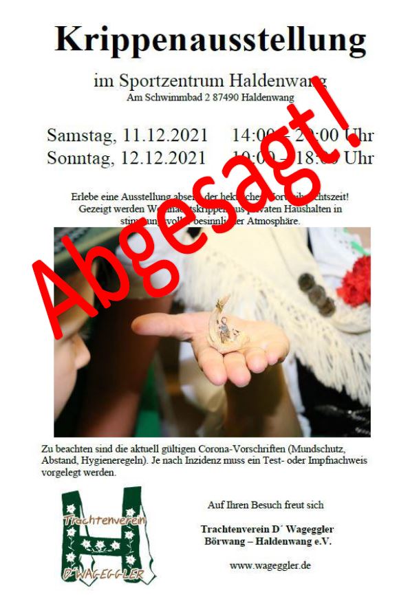 Die Vorstandschaft der Wageggler hat schweren Herzens beschlossen die geplante Krippenausstellung vom 11.-12.12.2021 aufgrund der hohen Corona-Inzidenz abzusagen.