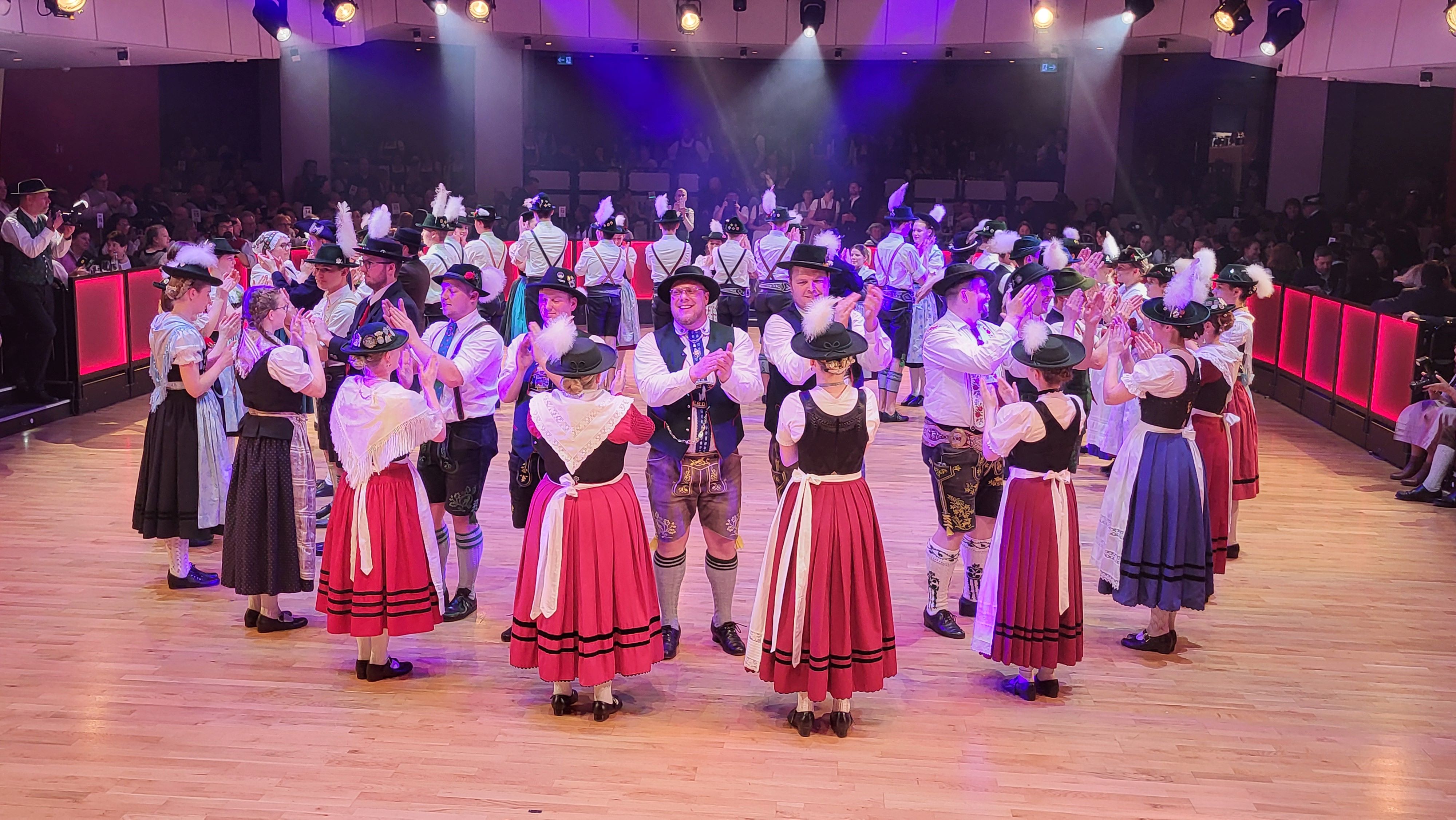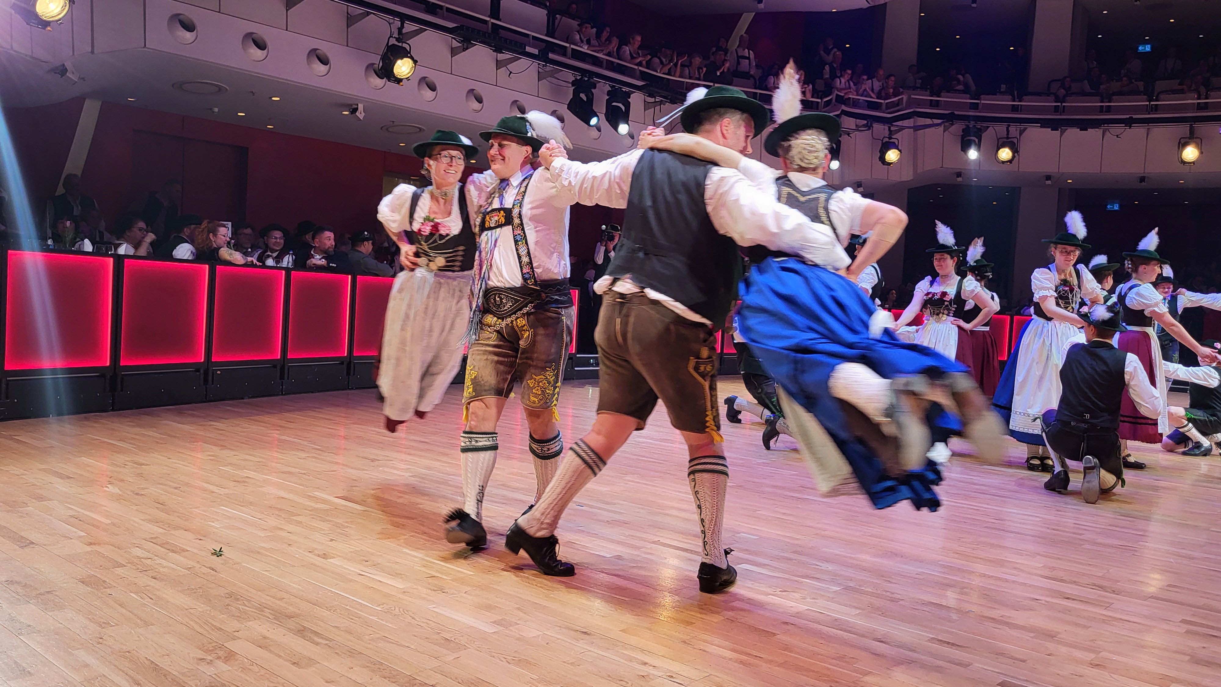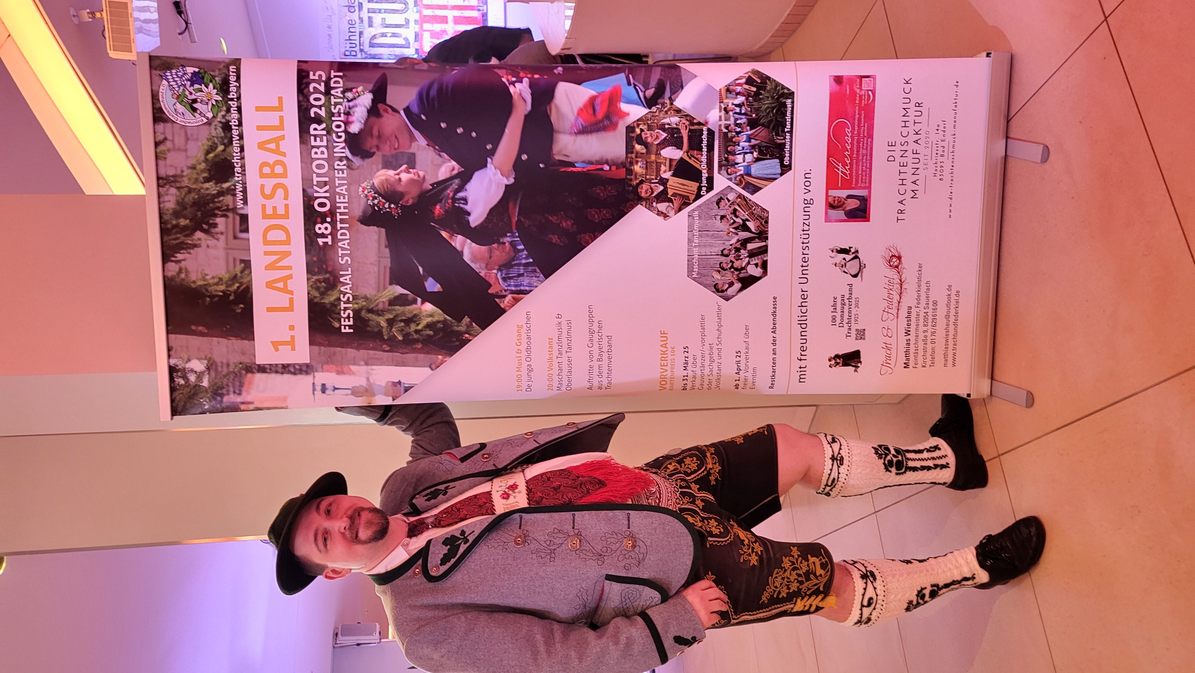 Im Foyer empfing die Rottauer Tanzlmusi aus dem Chiemgau die vielen Gäste musikalisch und auch der Aufsteller vom ersten Landesball des Bayerischen Trachtenverbandes am 18. Oktober 2025 in Ingolstadt war ein vielbeachteter "Hingucker". Nach dem Auftanz, musikalisch begleitet von Wolfgang Grünbauer und seinen Oktoberfest-Musikanten und angeführt von den Tanzmeistern Melanie und Christian Baumann, boten 30 (!) Repräsentanten-Paare der angeschlossenen Gauverbände den ersten Höhepunkt des Abends. Sie zeigten zunächst einige Mühlradl-Figuren und anschließend die Olympia-Sternpolka als Referenz an die Stadt München, da dieser Tanz 1972 anlässlich der Olympischen Spiele in München entstanden ist.