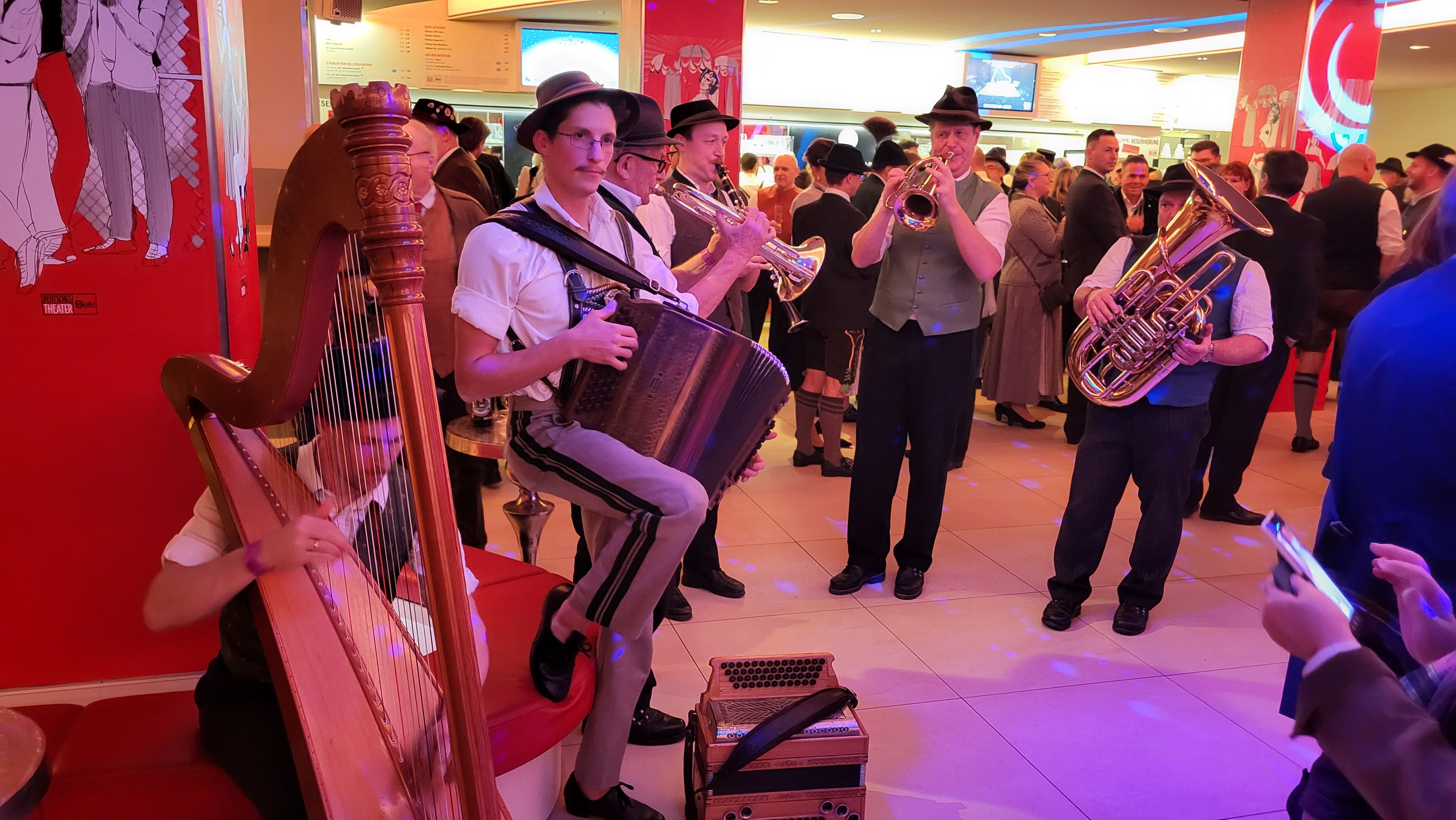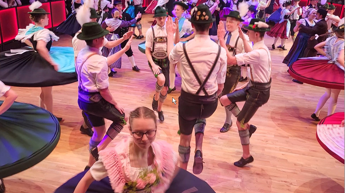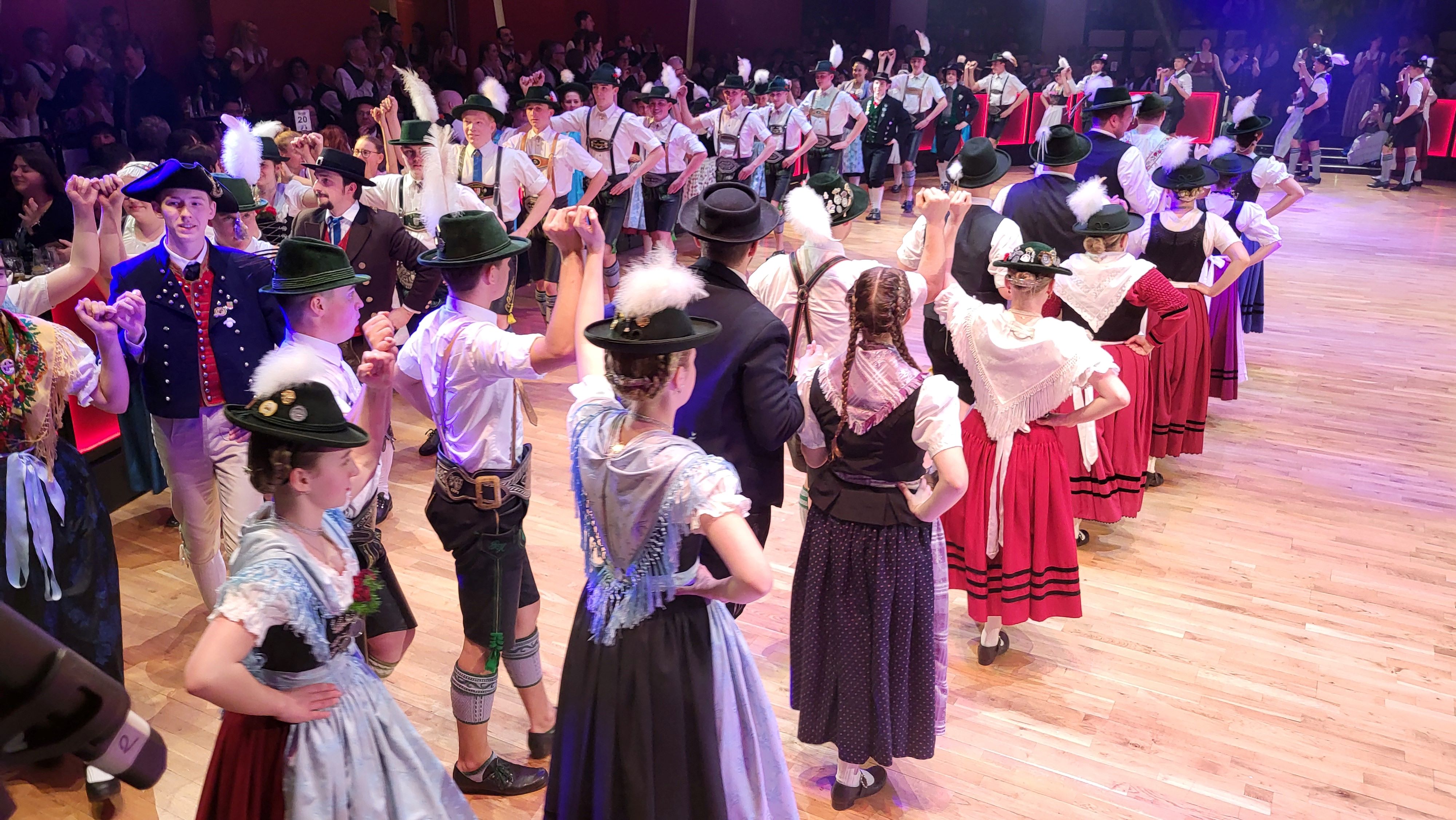 Im Foyer empfing die Rottauer Tanzlmusi aus dem Chiemgau die vielen Gäste musikalisch und auch der Aufsteller vom ersten Landesball des Bayerischen Trachtenverbandes am 18. Oktober 2025 in Ingolstadt war ein vielbeachteter "Hingucker". Nach dem Auftanz, musikalisch begleitet von Wolfgang Grünbauer und seinen Oktoberfest-Musikanten und angeführt von den Tanzmeistern Melanie und Christian Baumann, boten 30 (!) Repräsentanten-Paare der angeschlossenen Gauverbände den ersten Höhepunkt des Abends. Sie zeigten zunächst einige Mühlradl-Figuren und anschließend die Olympia-Sternpolka als Referenz an die Stadt München, da dieser Tanz 1972 anlässlich der Olympischen Spiele in München entstanden ist.
