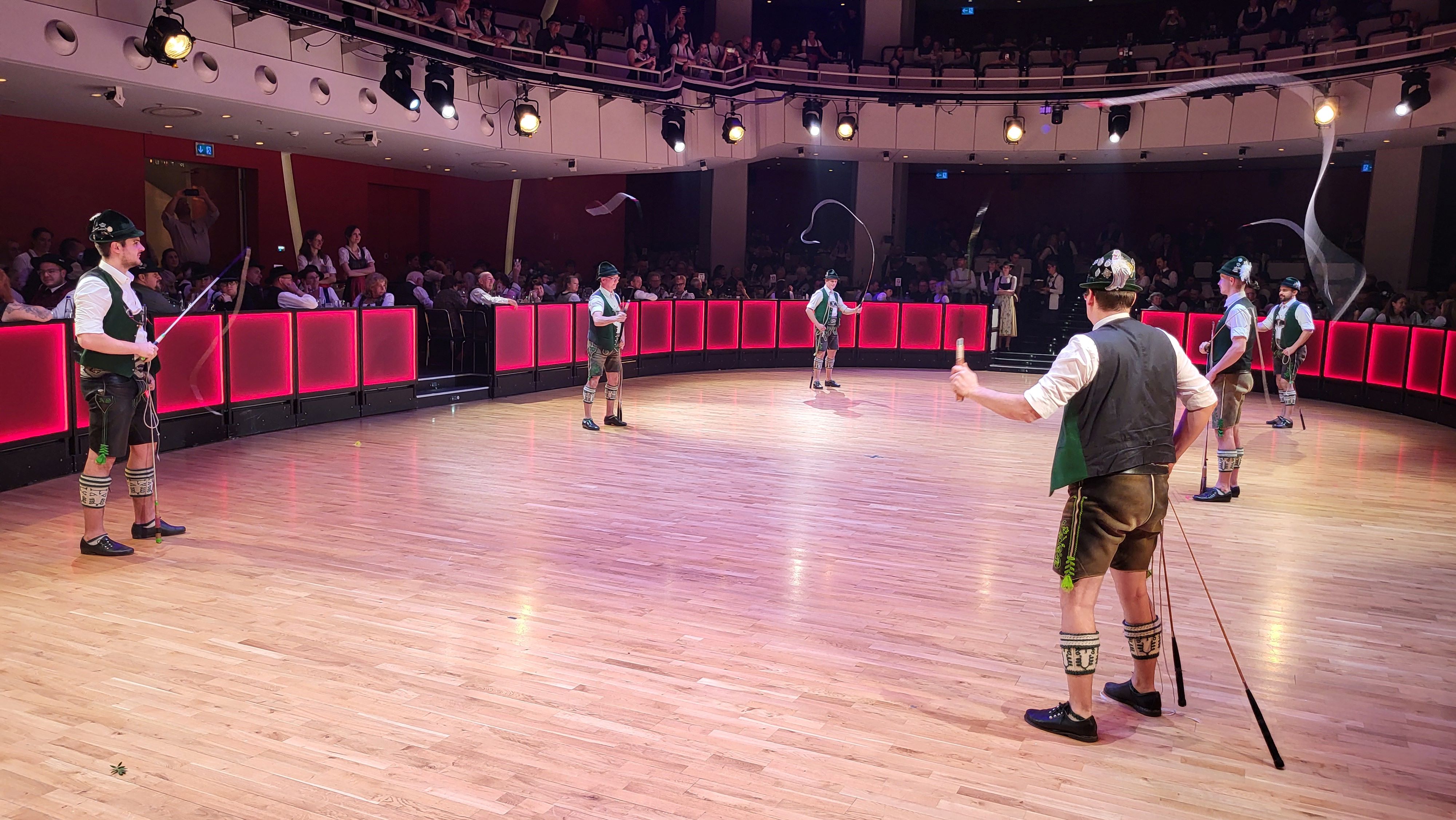 Weitere Höhepunkte des ‚Oide Wiesn Bürgerballs‘ bildeten die gekonnten Auftritte der Plattler und Dirndln vom Isargau unter der Leitung von Gau- und Landesvorplattler Matthias Wiesheu sowie die Goaßlschnalzer vom Trachtenverein Truchtlaching (Gauverband I) mit ihren kraftvollen Schnalzereinlagen.