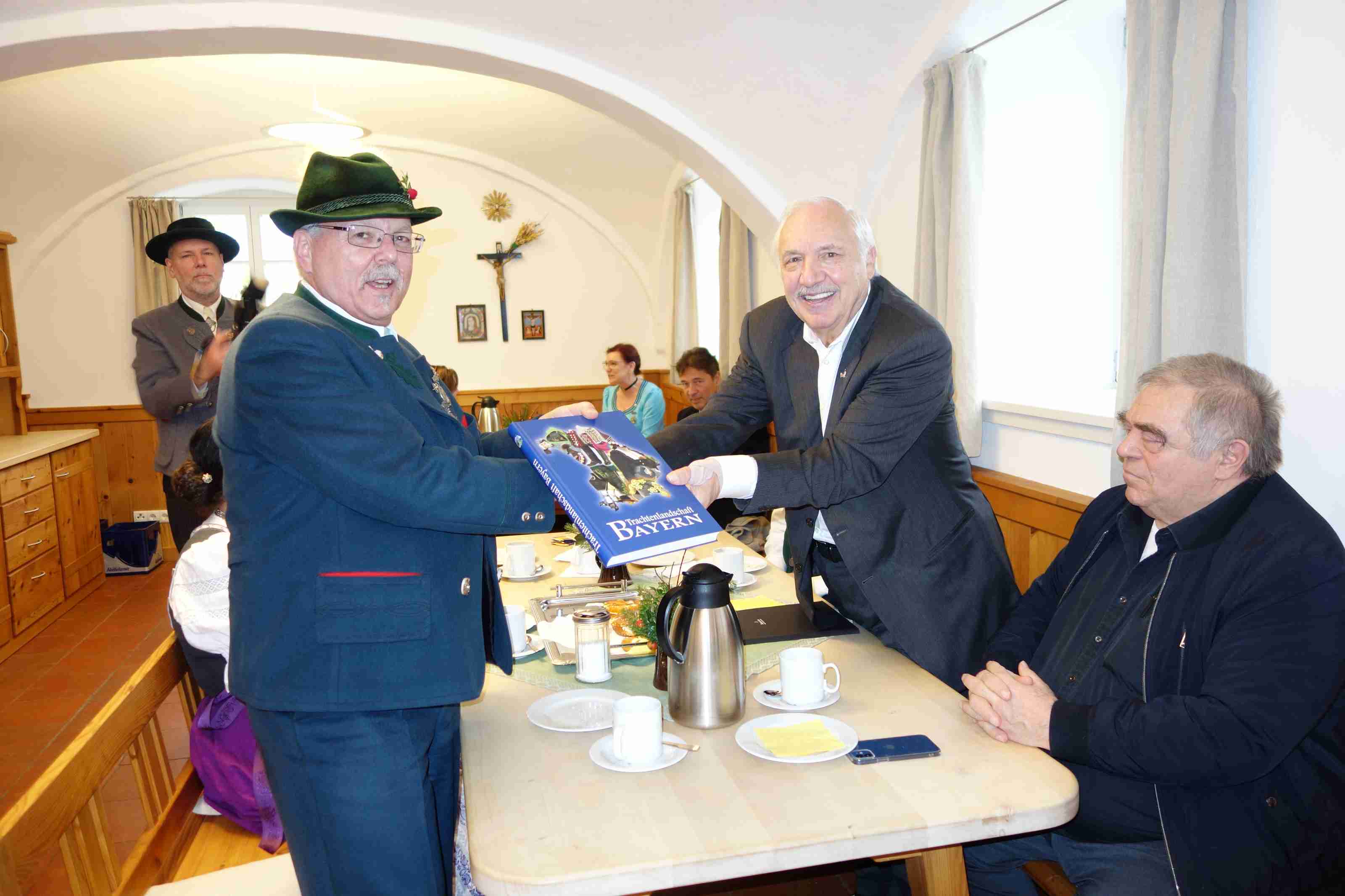 „Alle Werke der drei Künstler waren bereits in bedeutenden Ausstellungen und deren Wert möge im Falle einer Veräußerung oder Versteigerung die bayerische Trachtenbewegung fördern“ – mit diesen Worten übergab Unternehmer, Investor und Kunstsammler William Hetzler seine Schenkung an den Landesvorsitzenden Günter Frey und an den Ehrenvorsitzenden Max Bertl vom Bayerischen Trachtenverband. Diese bedankten sich für die großzügige Spende und bezeichneten diese als weiteren Beweis und Beitrag zur Trachtler-Freundschaft mit dem Gauverband Nordamerika. William Hetzler gehört nämlich als Ehrenmitglied dem Trachtenverein Schlierachtaler Stamm in New York an. Ebenfalls mit dabei bei der Schenkung in Holzhausen war dessen weiteres Mitglied Bob Hugel. Dieser überbrachte als Beisitzer vom Gauverband Nordamerika die besten Grüßen von dessen 1. Gauvorstand Tom Vogt. Dieser ließ die herzlichsten Trachtengrüße aus Kanada und aus den USA übermitteln, dazu hieß es: „Es ist schön, nach mehr als einem Jahr des Zögerns über Covid-19 wieder etwas Persönliches zu machen. Es ist das Zusammenkommen, das unsere Freundschaft stärkt“. Zugleich gratulierte Tom Vogt dem neuen Landesvorsitzenden Günter Frey und bat um weiterhin gute Zusammenarbeit. Günter Frey bedankte sich bei den Trachtenfreunden von Nordamerika mit einem signierten Buch „Trachtenlandschaft“ Bayern.