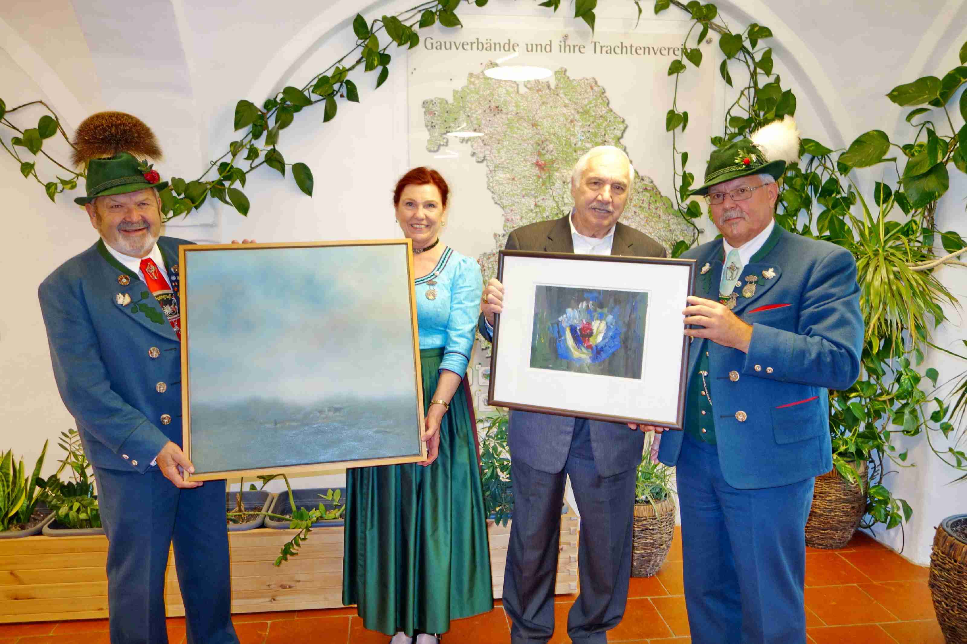 Fotos: Hötzelsperger – 1. Von links Ehrenvorsitzender Max Bertl, Landesschriftführerin Hildegard Hoffmann, William Hetzler und Landesvorsitzender Günter Frey mit Werken von Nikolaus Hipp und Rudolf L. Reiter. 2. Betrachtungen der Kunstwerke im Trachtenkulturzentrum Holzhausen. 3. Ehrenvorsitzender Max Bertl und William Hetzler. 4. Landesvorsitzender Günter Frey bedankt sich mit dem Buch „Trachtenlandschaft Bayern“ bei William Hetzler.