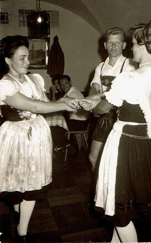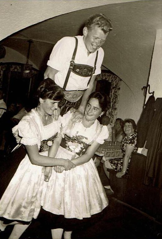 - Peter Eicher als Aktiver beim Dreisteyerer mit Liesi Steinbacher (li.) und mit Anne Bauregger (Bild aufgestützt, beim anderen Bild Liesi = re.).
