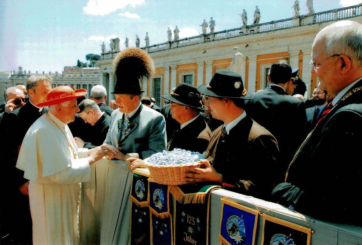 - Peter Eicher bei Papst Benedikt XVI in Rom zusammen mit (von re.) Bürgermeister Herbert Hofbauer, Gauvorplattler Jürgen Wiedl und Trachtenvorstand Fritz Stocker aus Altötting.
