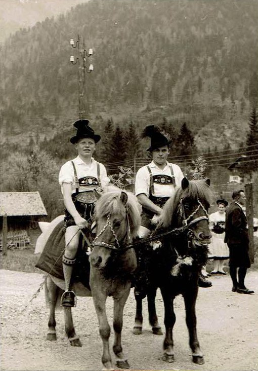 - Peter Eicher als junger Schuhplattler bei seinem ersten öffentlichen Einsatz beim Maibaumaufstellen in Weißbach mit seinem Freund und damaligen Vorplattler Hans Holzner (re.)
