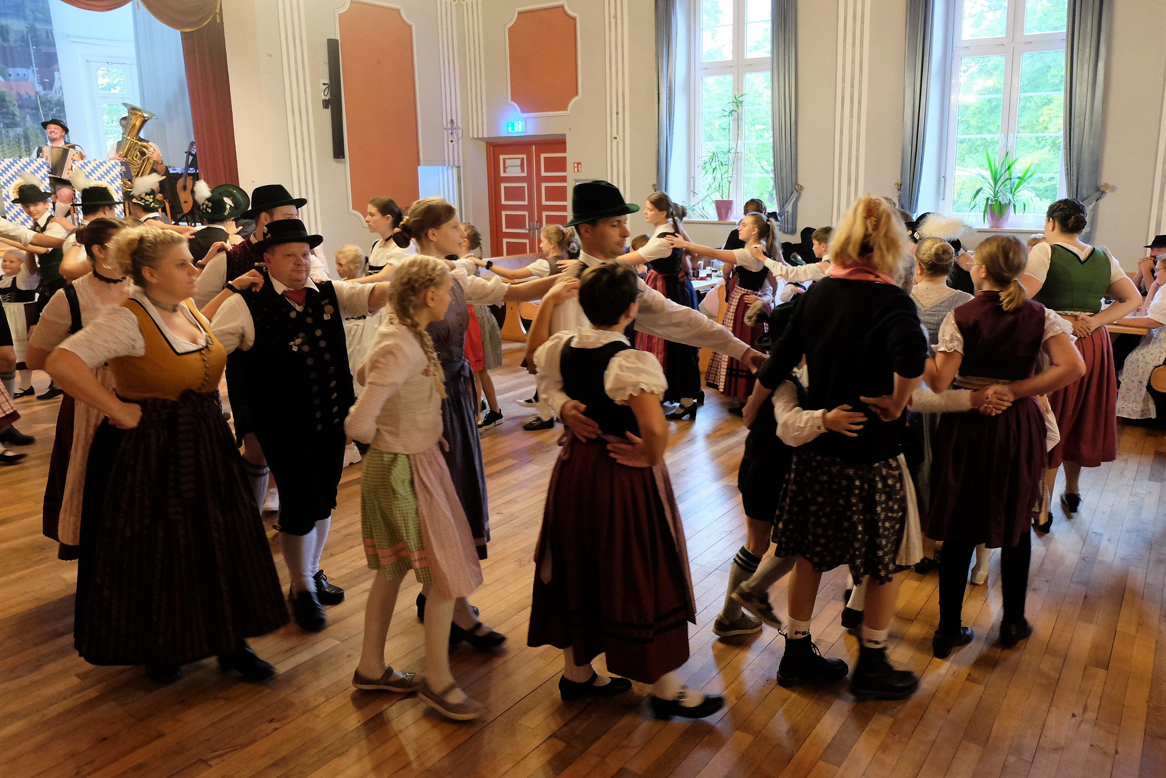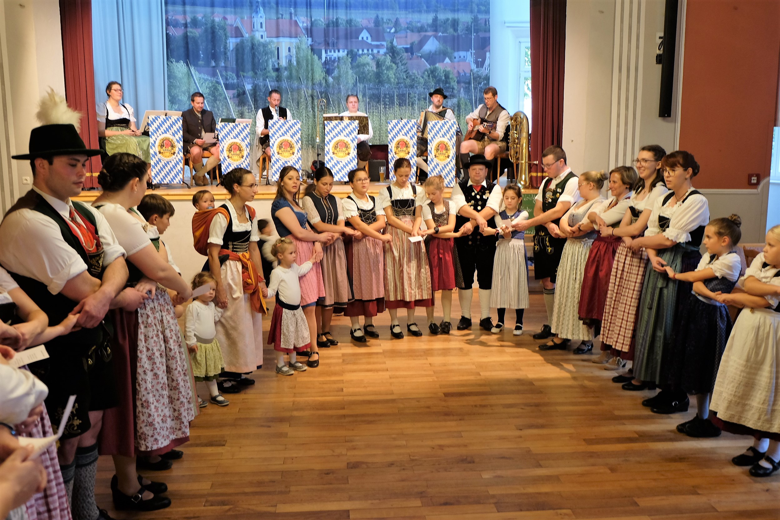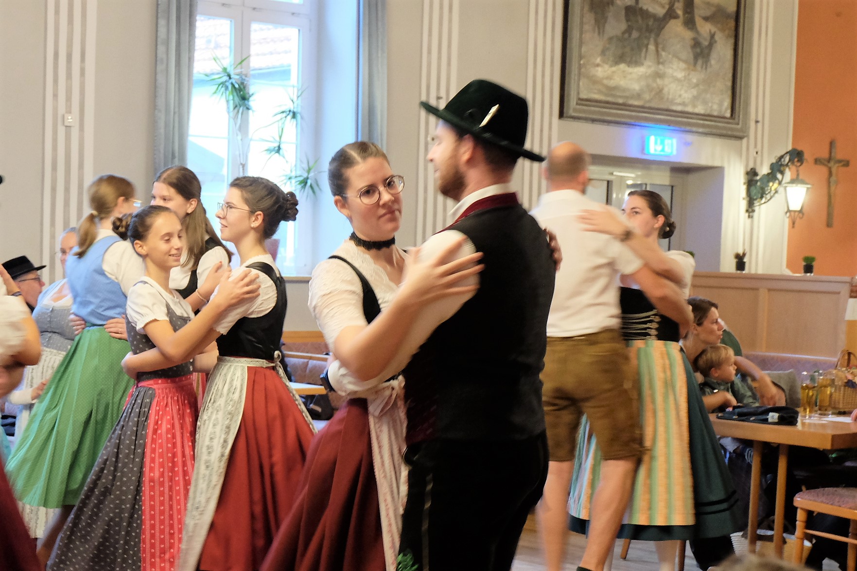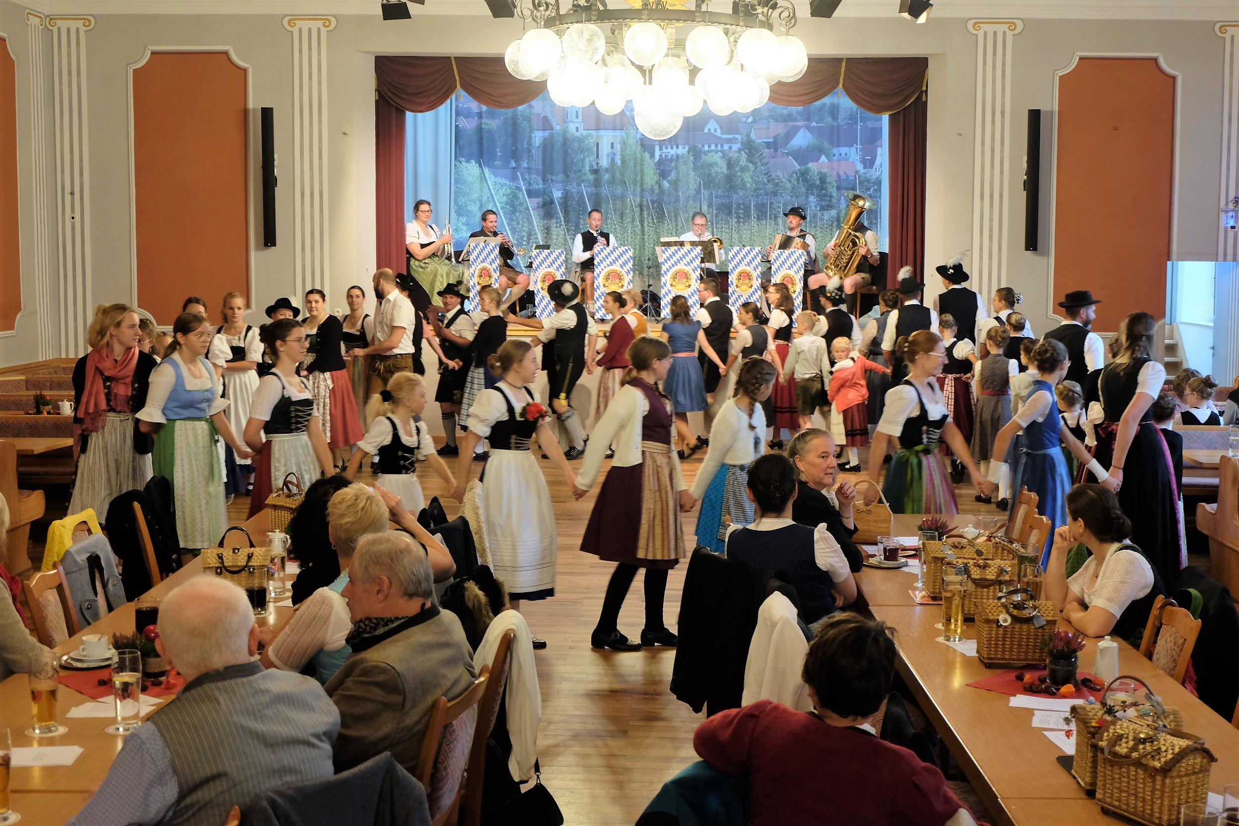 113 Deandln und Buam aus 17 Gauvereinen hatten sichtlich Spaß und Freude, sich endlich wieder zu einem Nachmittags-Volkstanz zu treffen. Da man die Musik bis auf Siegenburgs Straßen hören konnte, nahmen auch spontan Spaziergänger an der Tanzveranstaltung teil. Neben dem Tanzen und Platteln, kam das gemeinsame Spielen und singen auch nicht zu kurz. In der Pause zeigte die Gaujugendgruppe ihr Können. Gaujugendvertreterin Andrea Betz organisierte mit ihrem Jugendkomitee noch ein Rätsel mit diversen Fragen über das Trachtenkulturzentrum in Holzhausen und über unseren Donaugau. Hier hatten auch alteingesessene Trachtler kleine Schwierigkeiten, die Fragen zu beantworten. An dieser Stelle noch ein herzliches Vergelt´s Gott an den Trachtenverein Siegenburg für das ausgezeichnete Kuchenbüfett.