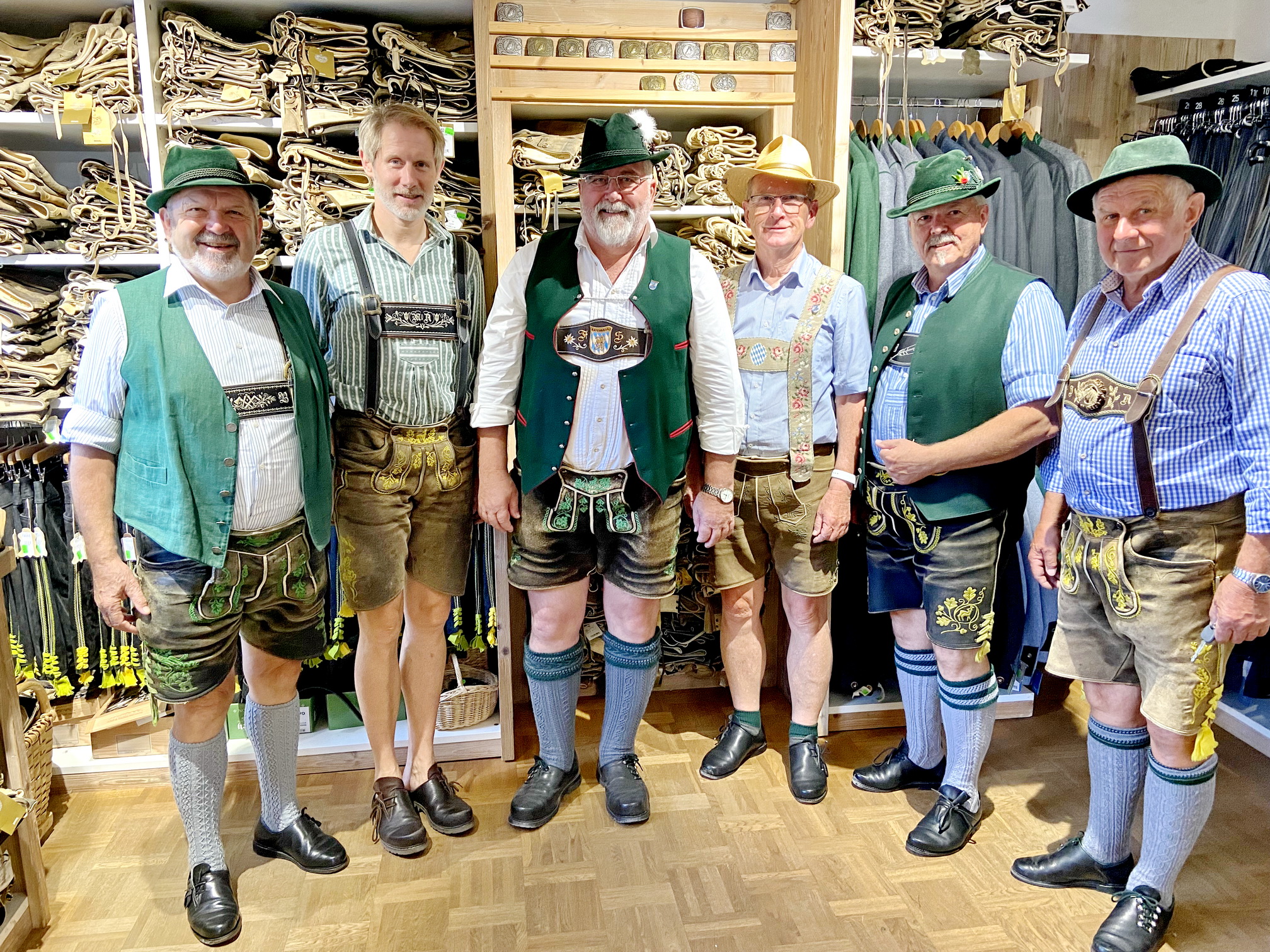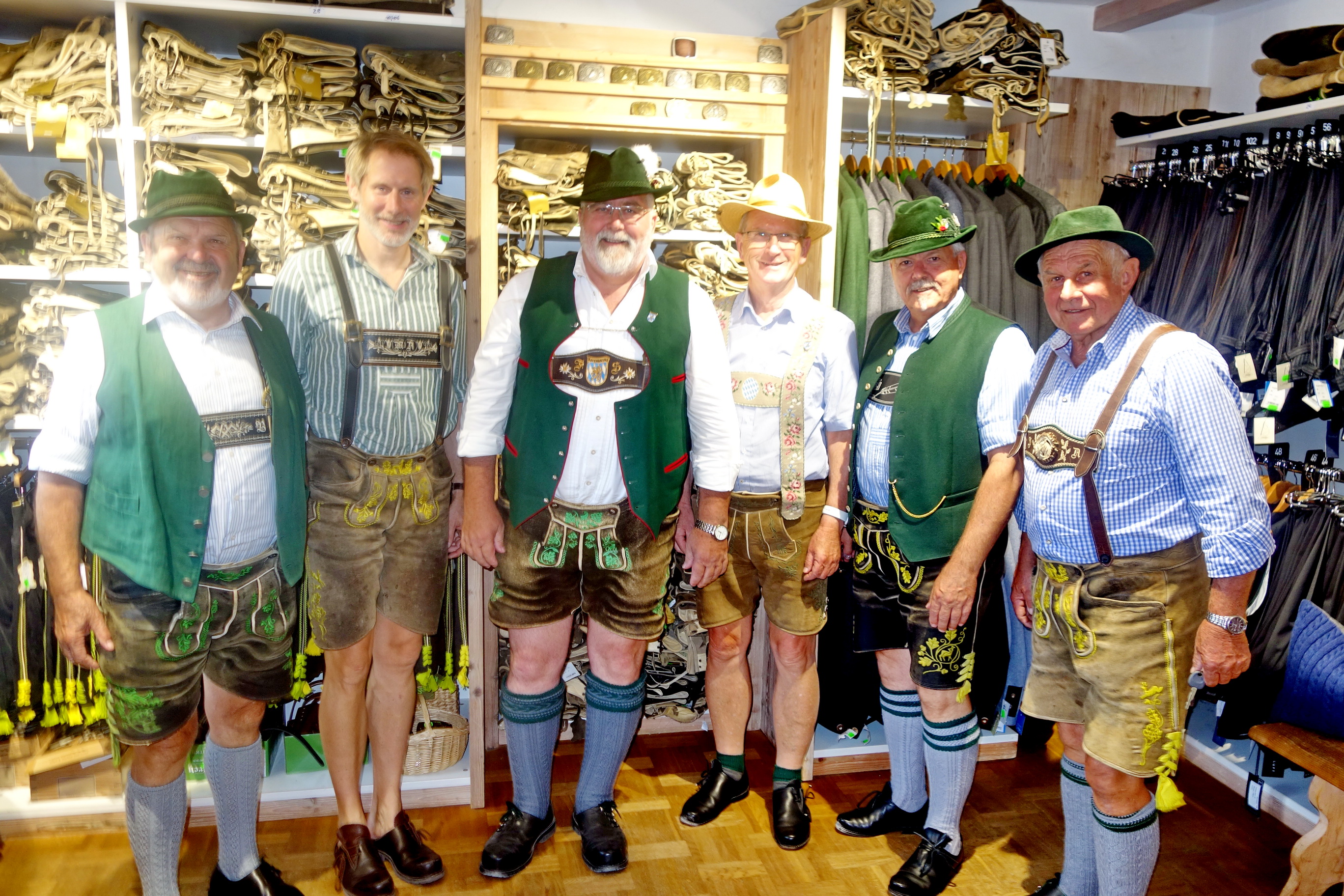 Foto: Hötzelsperger – Gestandene Mannerleute bei Trachten und Schuhe Auer in Törwang auf dem Samerberg, von links: Ehrenvorsitzender Max Bertl vom Bayer. Trachtenverband, Junior-Chef Michael Auer, Bayernbund-Landesvorsitzender Sebastian Friesinger, Fritz Lutzenberger, Redakteur der Bayernbund-Zeitung „Weiß-Blaue Rundschau“, Trachtler-Landesvorsitzender Günter Frey und Senior-Chef Hans Auer.