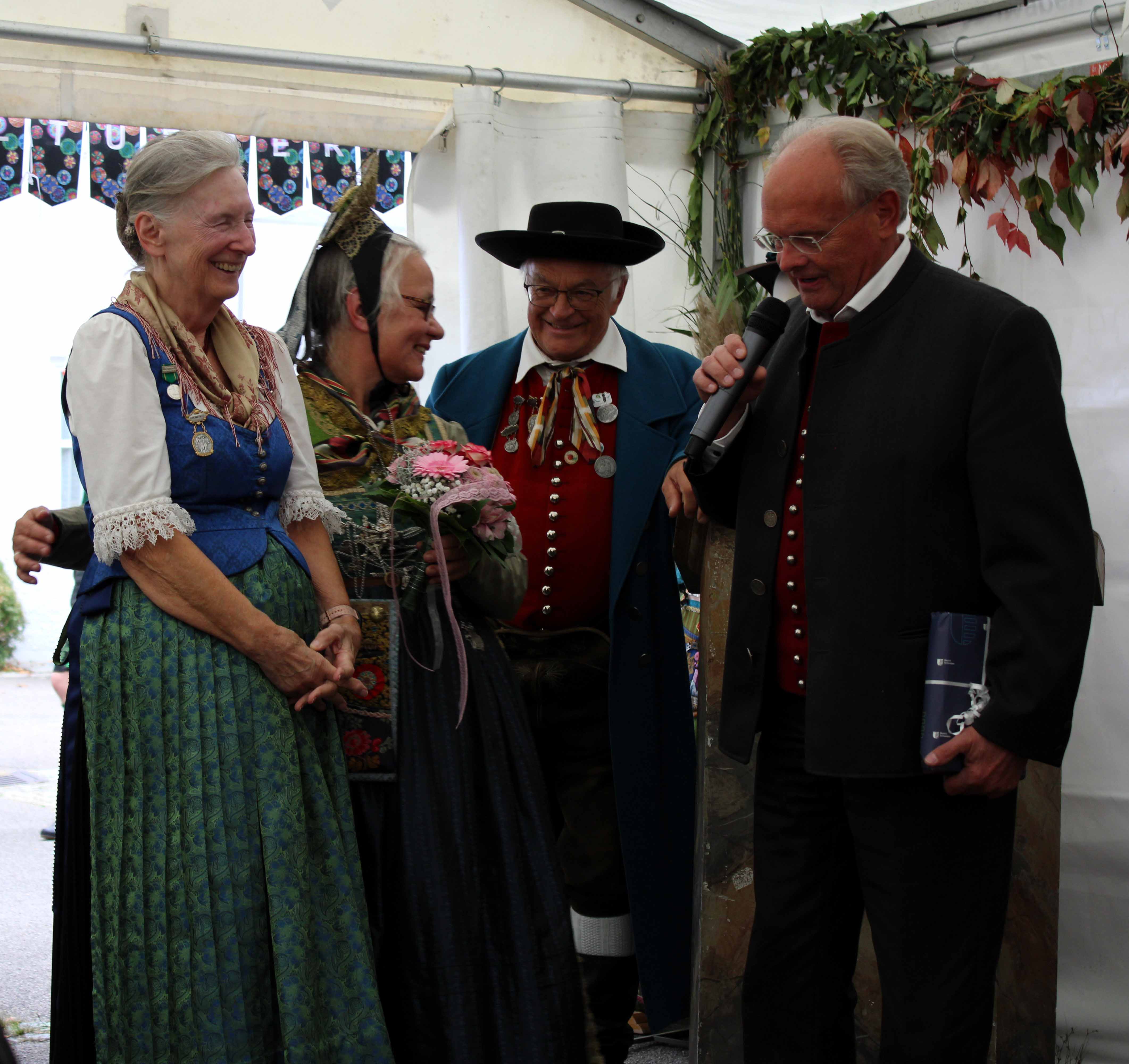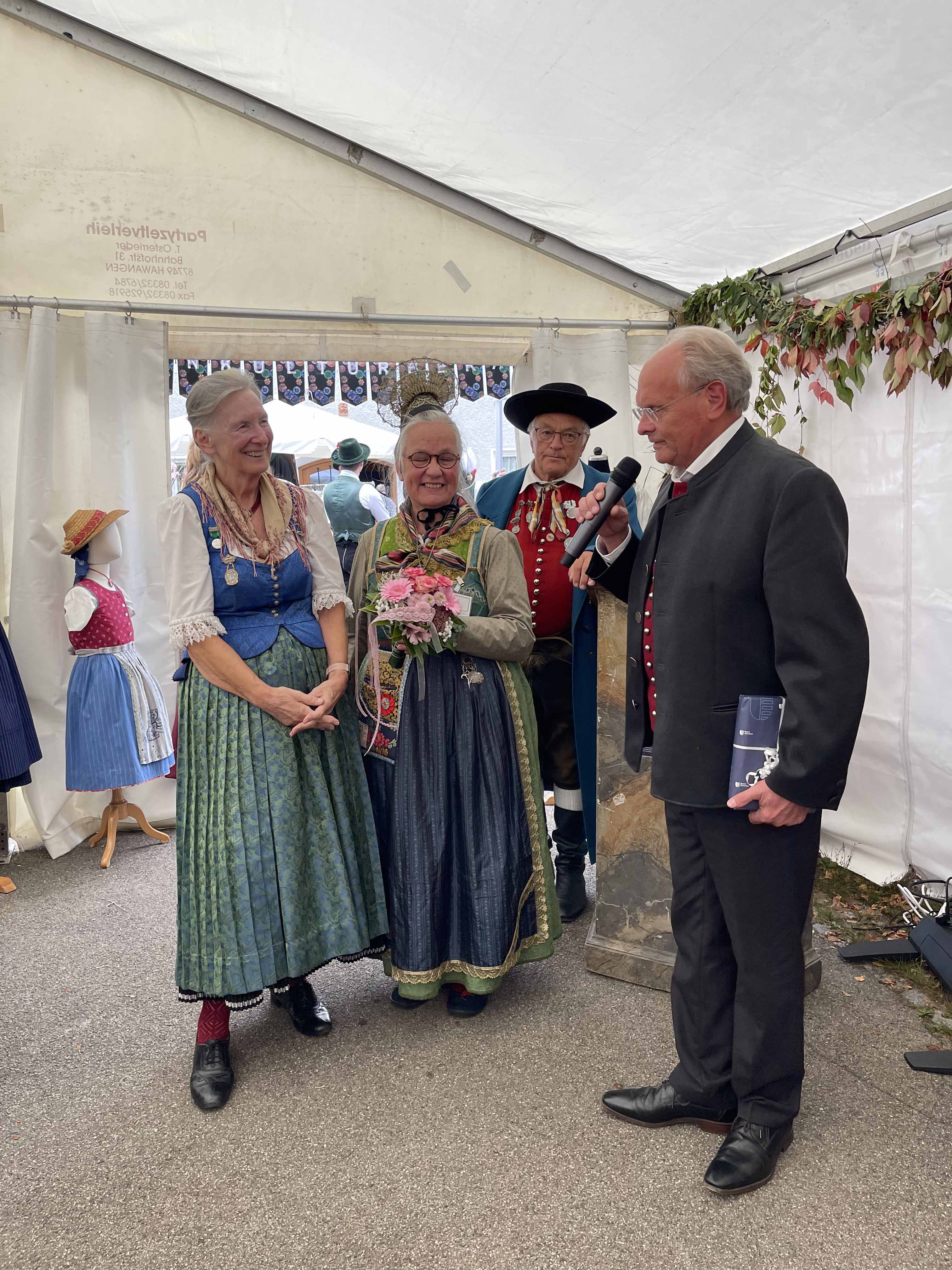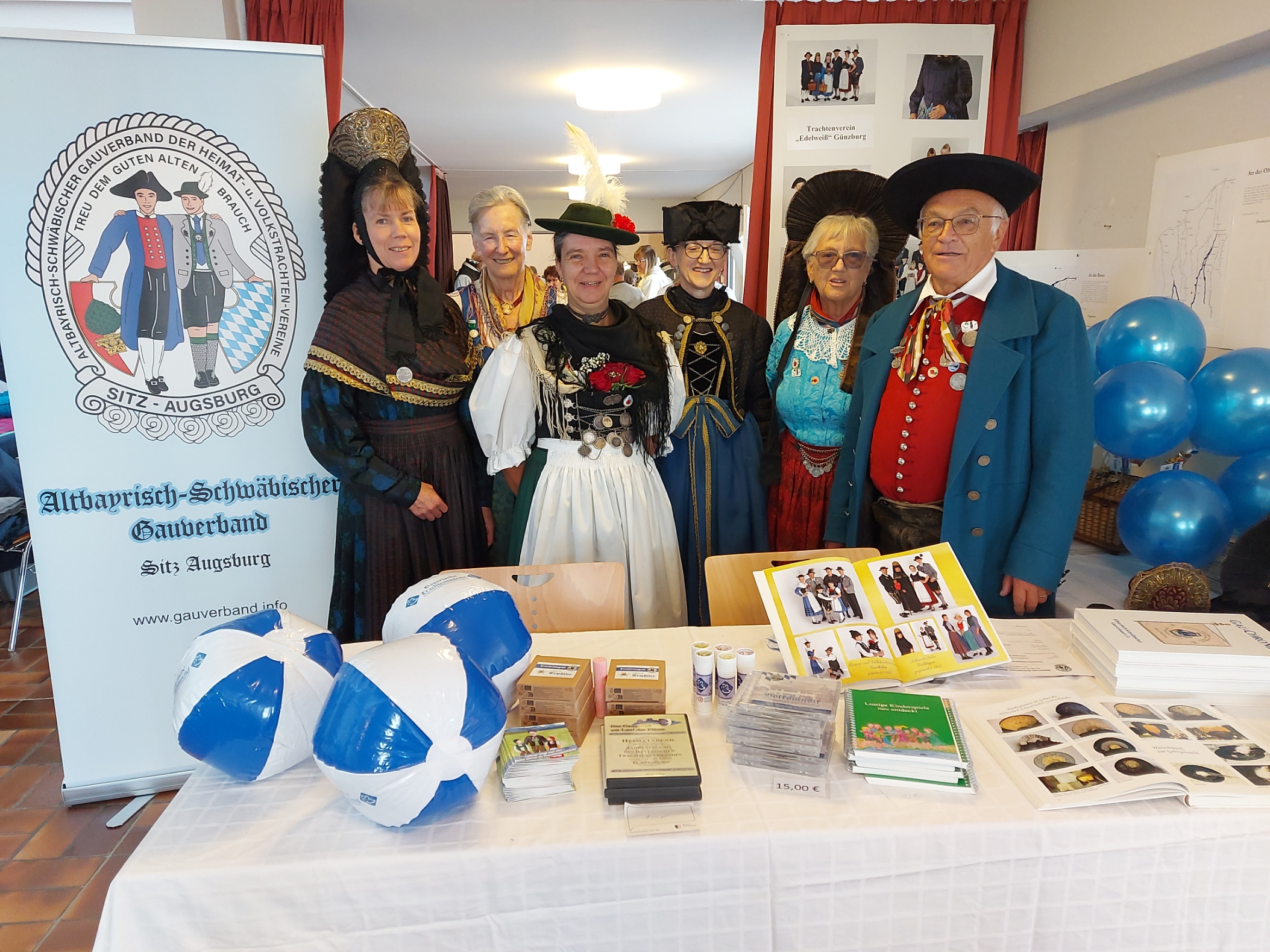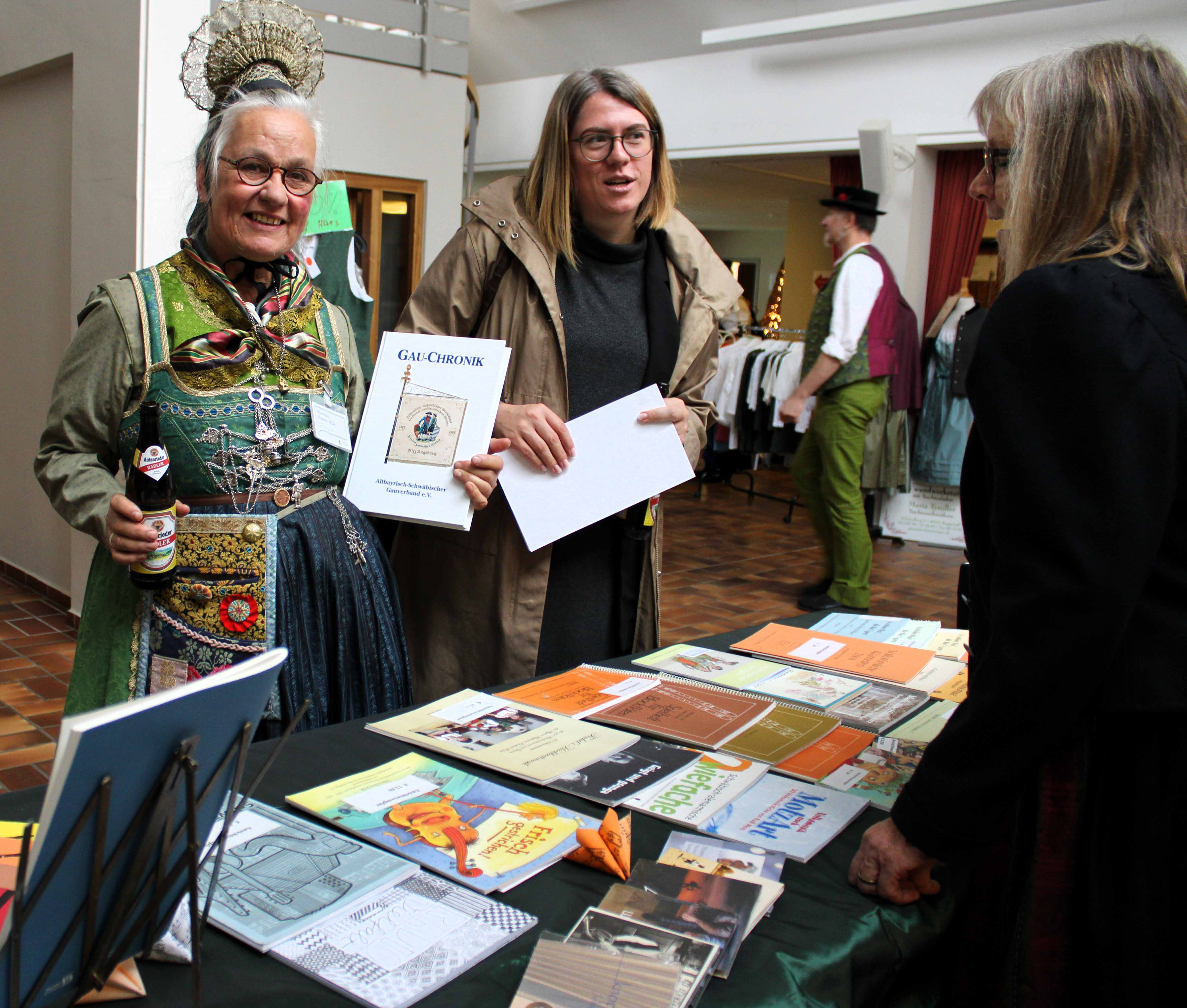 Bei frischen Temperaturen begann am Samstag 07. Oktober der Trachtenmarkt in Krumbach. Zur feierlichen Eröffnung erschienen u. a. Herr Alfons Weber stellvertretender Bezirkstagspräsident des Bezirk Schwaben, der 2. Bürgermeister der Stadt Krumbach Gerhard Weiß sowie frau Wiebke Reimer Abteilungsleiterin für Kultur und Heimatpflege des Bezirk Schwaben. Nach einem Musikstück von der Vöhringer Stubenmusik eröffnete Frau Monika Hoede von der Trachtenberatung Krumbach die Ausstellung, die zusammen mit der Trachtenberatung und dem Altbayrisch-Schwäbischen Gauverband durchgeführt wurde. Bei Ihrer Ansprache führte Frau Hoede aus, dass der Altbayrisch- Schwäbische Gauverband diese Veranstaltung im Zuge der 140 Jahre Trachtenbewegung mitträgt. Herr Alfons Weber wies ebenfalls auf das Jubiläum der Trachtenbewegung hin und freute sich über die zahlreich erschienen schwäbischen Trachtenpaare. Diese wurden im Anschluss von Marianne Hinterbrandner, Gauehrenmitglied des Altbayrisch-Schwäbischen Gauverbandes, vorgestellt und in gekonnter Weise und mit viel speziellem Wissen kommentiert. Im Anschluss spielte die Vöhringer Stubenmusik auf und die Volkstänzer und Schuhplattler zeigten Volkstänze und Plattler aus der Region vor und im Pfarrzentrum St. Michael. Am Stand des Altbayrisch-Schwäbischen Gauverbandes wurden am Samstag sowie am Sonntag viele interessante Gespräche geführt. Am Sonntag spielte die Burlafinger Stubenmusik im Verpflegungszelt, ebenso zeigten die Volkstänzer aus dem Trachtenbezirk Burgau ihr können.