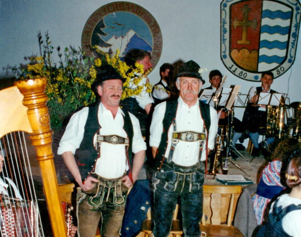Mit dem Trachtenheim gab es verschiedene Impulse und neue Veranstaltungsmöglichkeiten. Unter anderem rief Jakob Irrgang, der nach Miche Berneder Zweiter Vorstand wurde, Tanzkurse für Jugendliche und einen Volkmusik-Hoagascht ins Leben. Und die Volksmusik war für Miche Berneder von Kindheit an etwas Schönes, dazu erinnert er sich gerne: „Schon als kleiner Bua habe ich Radio-Lieder nachgesungen, nach dem Trachtenheimbau traten Sepp und Hans Steinbichler und ich mit Zitherbegleitung durch Willi Weitzel sechs Jahre als Hittenkirchener Sänger auf. Alsdann erlernte ich das Gitarrenspielen und das Balladensingen, rund 15 Jahre pflegte ich mit Angela Grannetsberger aus Übersee (und nach ihrer Heirat aus Antholling) sowie auch mit Georg Seifritzberger aus Traunstein einen Zwoagesang“. Zehn Jahre organisierte Miche Berneder die stets ausverkauften Hoagascht mit bekannten und regionalen Volksmusikgruppen. Weitere Gesangs-Aktivitäten waren die 27jährige Zugehörigkeit zum Männerchor Grabenstätt und die Gründung eines vierstimmigen Gesangs aus den Reihen des Chores. „Auftritte sind zwar schön, aber nicht entscheidend, wir treffen uns wenn´s geht jede Woche zur eigenen Freude so wie wir es viele Jahre bei den Musikanten-Stammtischen gewohnt waren“ – so Miche Berneder, der sich mit Gitarre und Kontrabaß auch noch mit Musikfreunden aus Eggstätt und Trostberg zusammentut. Seit seiner Pensionierung als Immobilienmakler und nach überstandener Krankheit hört sich der rege Volksmusikant die entsprechenden Radio-Sender an und spielt bei ihm bekannten Stückln für sich in der guten Stube mit. Oder er spielt die Stückln nach, die er mit seinen Volksmusikfreunden in den letzten Jahrzehnten auf CD aufgenommen hat.