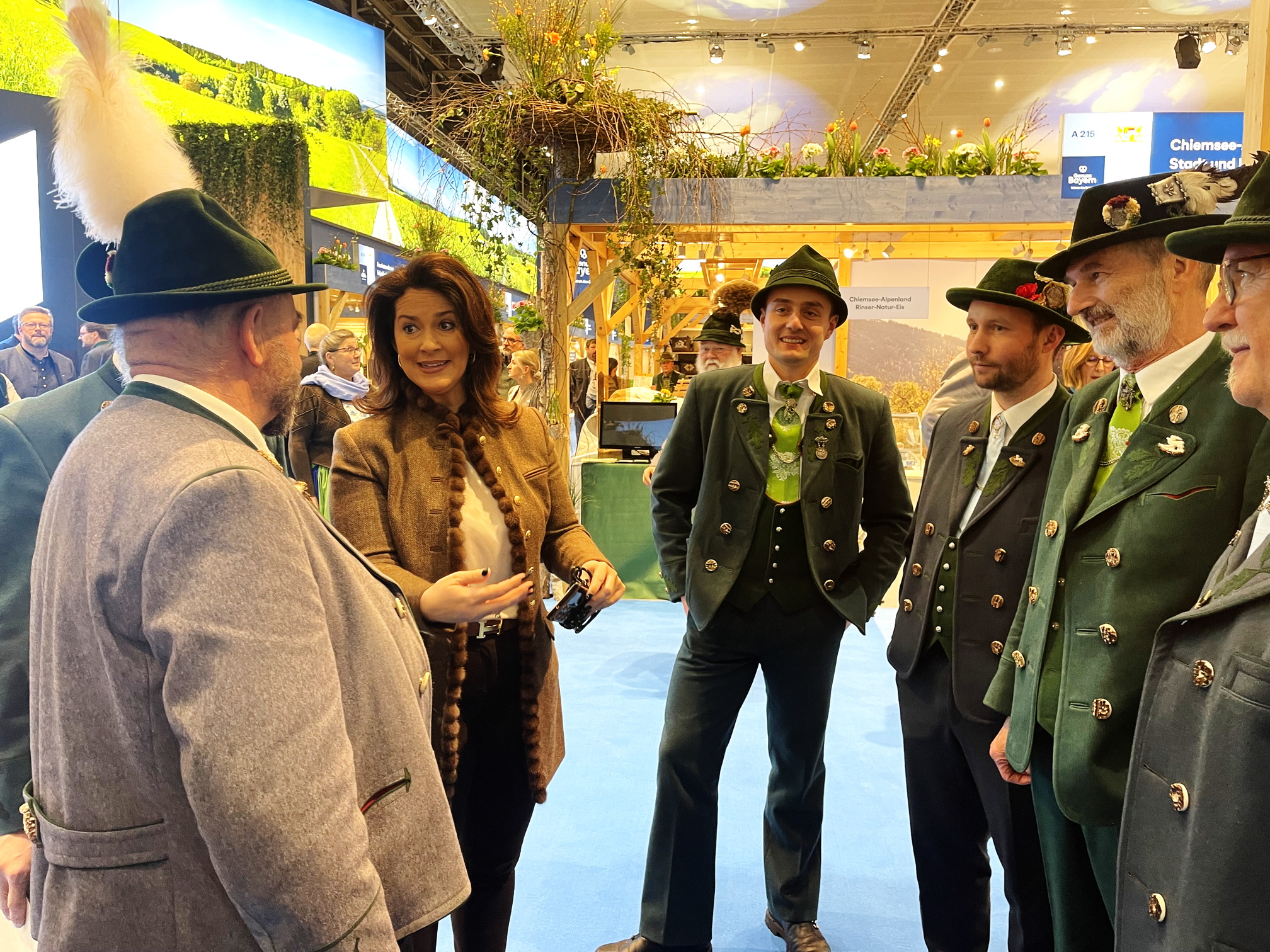 Zu den vielen Gesprächspartnern auf der Grünen Woche zählte auch Bayerns Landwirtschafts- und Tourismusministerin Michaela Kaniber, unsere Aufnahme zeigt sie in der Bayernhalle mit den Trachtenverantwortlichen des Gauverbandes I und der drei Traunsteiner Vereine von links Andreas Klauser (Traunstein), Alfred Prosser (Hochberg), Michael Hauser (Gauvorstand), Simon Schreiber (Festleiter), Sepp Kaiser (3. Bürgermeister und Mitglied der Trauntaler), Franz Maier (Rettenbach) und Julian Heigenhauser (Hochberg).