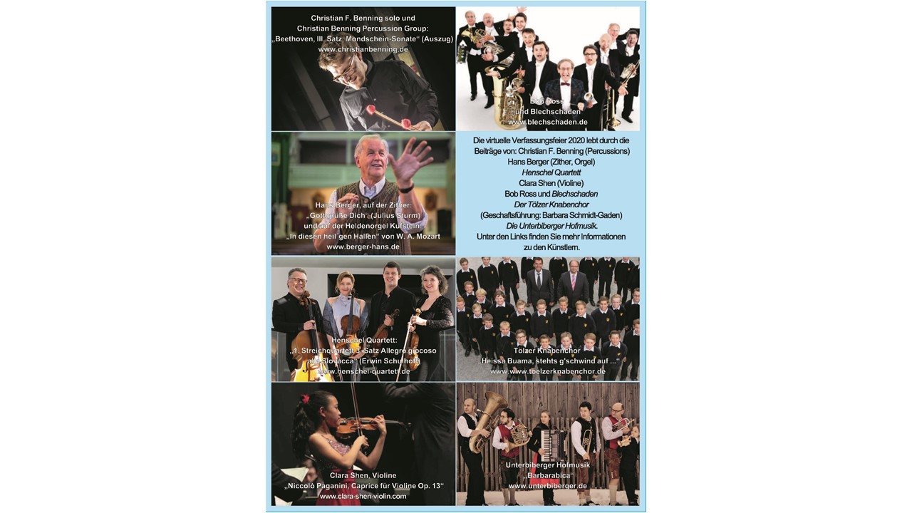 Das Thema dazu ist die Bewahrung unserer Kulturstaatlichkeit auch in Corona-Zeiten. Diese Thematik ist die Konsequenz aus der Tatsache, dass die Bayerische Einigung und Volksstiftung auch Anlaufstelle vieler Informationen und Klagen aus allen Bereichen von Kunst und Kultur ist. Intention für die Gestaltung dieser erstmalig virtuellen Verfassungsfeier war die Idee, durch die Übermittlung von hochwertigsten musikalischen Grußbotschaften von den besten Musikern aus allen verschiedensten Musikrichtungen die nobelste Form einer Anmahnung zur Erhaltung unseres Kulturstaates auch in schwierigster Zeit zu übermitteln.