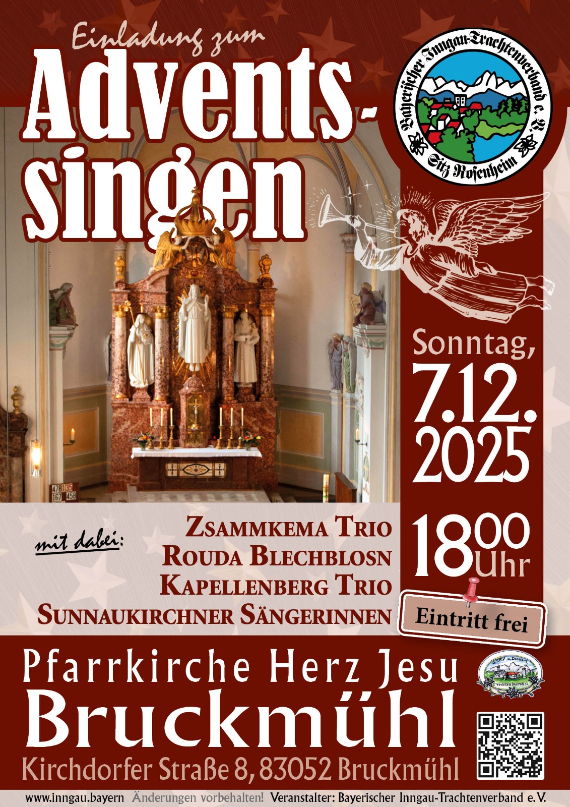 Am Sonntag, 7.12. veranstaltet der Bayerische Inngau-Trachtenverband in der Pfarrkirche Herz Jesu in Bruckmühl. Ab 18:00 Uhr sorgen das Zsammkema Trio, die Rouda Blechblosn, das Kapellenberg Trio und die Sunnaukirchner Sängerinnen mit bayerischen Klängen für eine adventliche Stimmung. Zudem wird ein Adventsspiel aufgeführt mit dem Thema „As Liacht in uns."