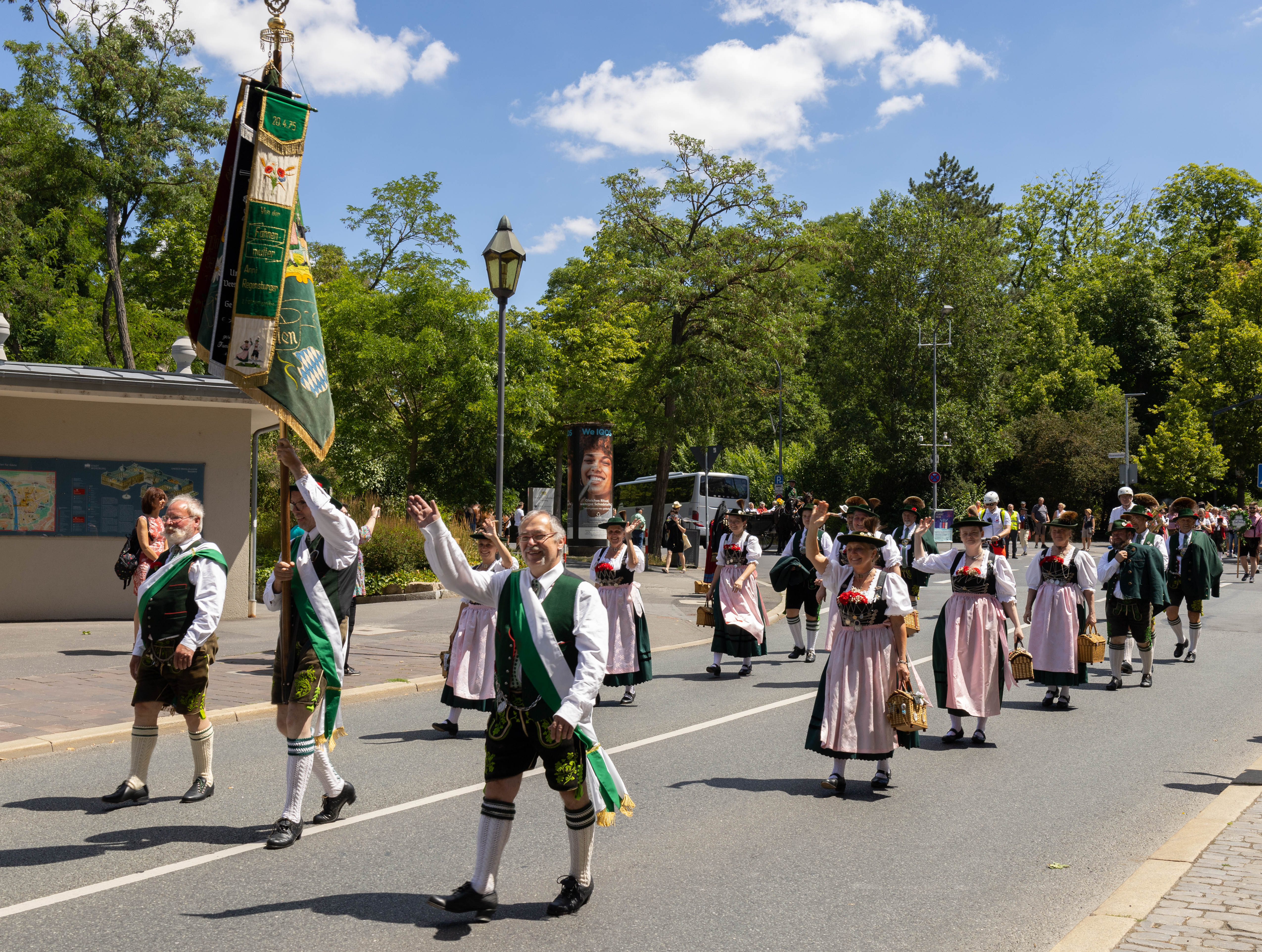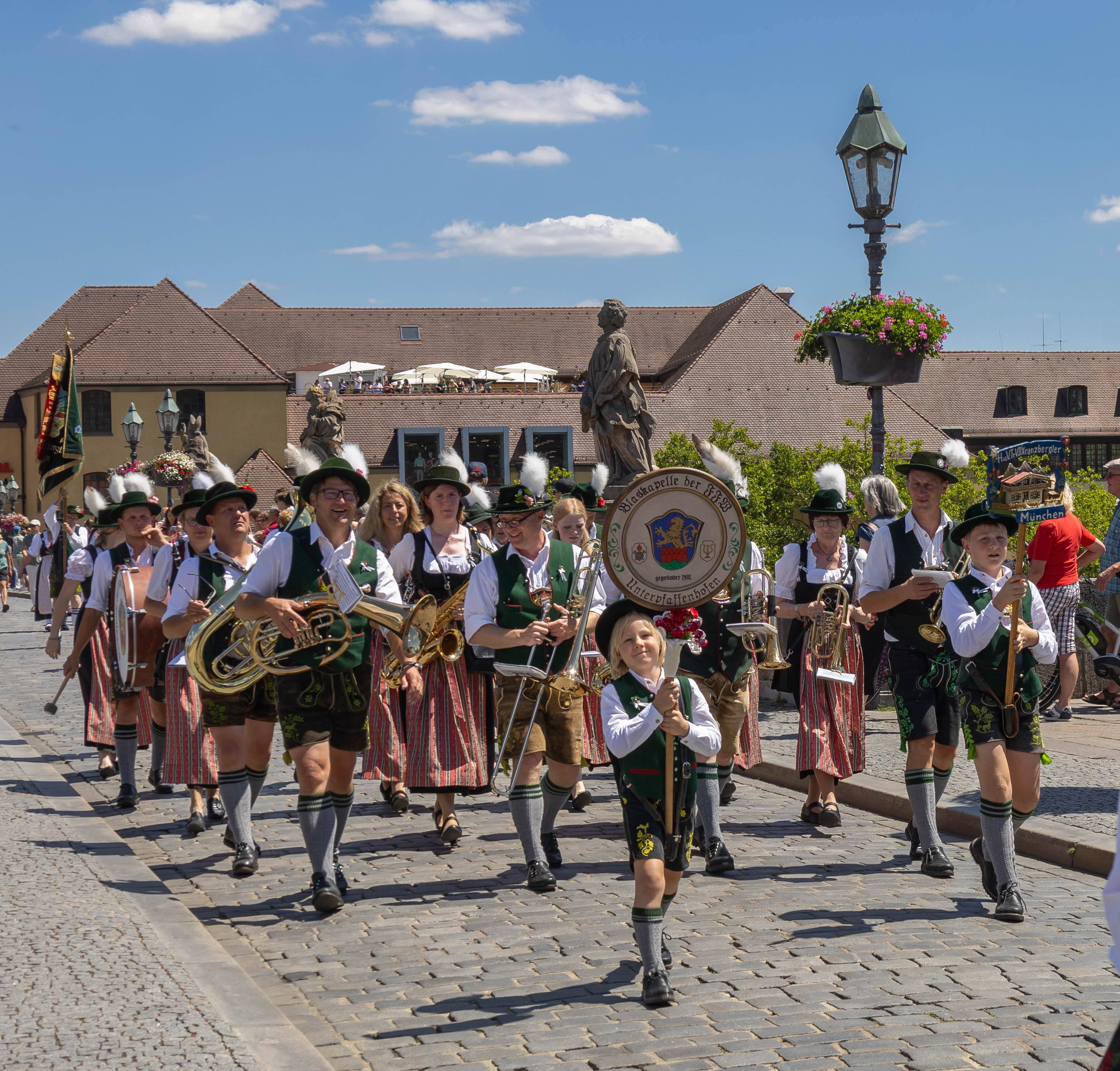 Für die Kranzbergler und unsere Musikfreunde ging es am Samstag, den 2. Juli 2022, in der Früh um ca. 6:40 Uhr mit dem Bus dann endlich los gen Franken. Denn man wollte auf keinen Fall zu spät zum Kiliani-Festzug kommen. Stolz präsentierten wir uns nach der langen Durststrecke der letzten zwei Jahre im Festzug und freuten uns, die Zuschauer - vor allem auch mit unserem Münchner Kindl, für das sich unsere liebe Eva Pfluger bereit erklärt hatte - begeistern zu können.