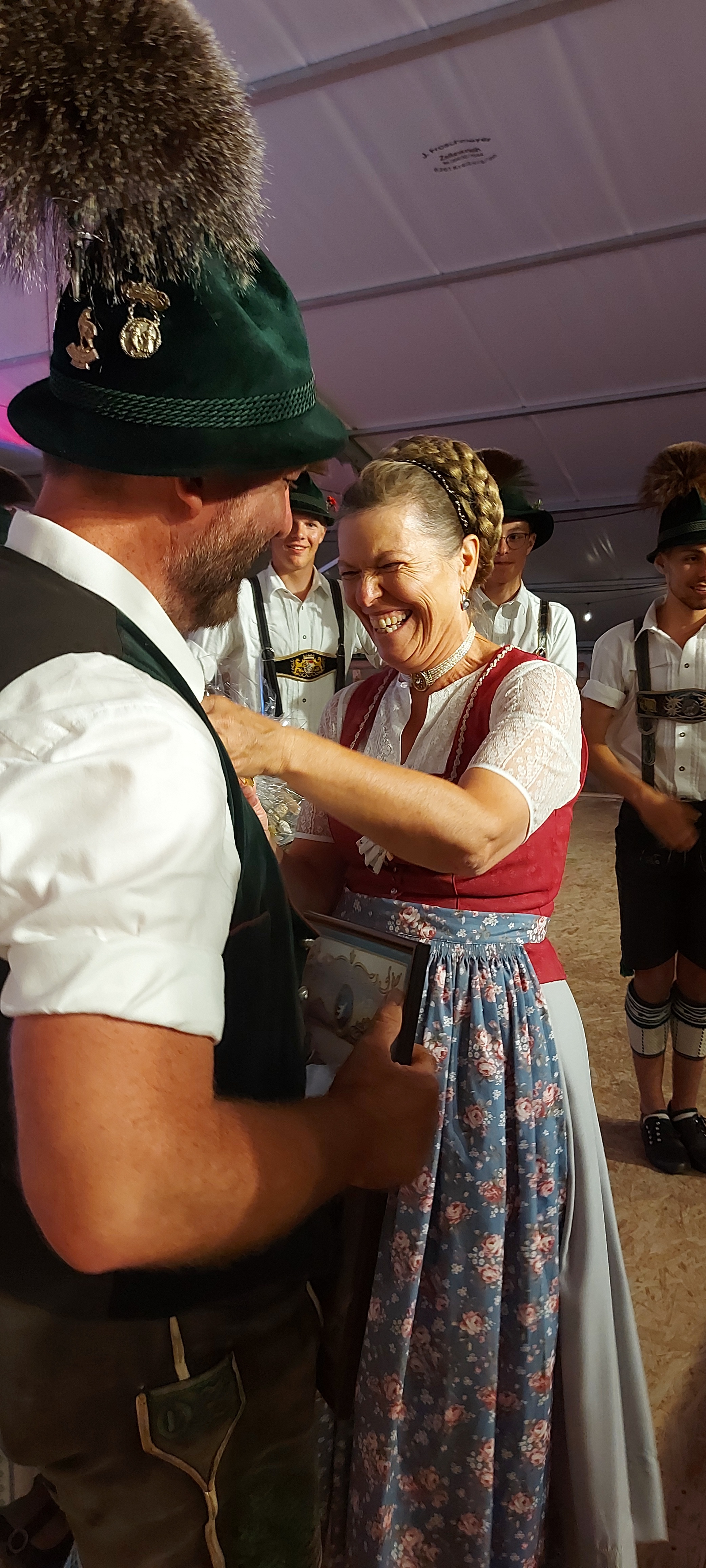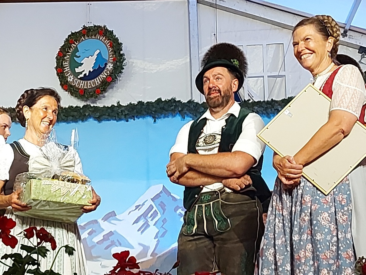 Der Gauvorstand ging mit Brauchtums- und Trachtenwartin auf die Bühne, die beiden Damen holten den Gautanzwart Otto Zaiser in ihre Mitte. Völlig verblüfft und ahnungslos wurde dieser vor allen Besuchern mit dem goldenen Gauehrenzeichen geehrt, für die vielen Jahre im Verein und im Gau, die er der Jugend und dem Tanz, auch mit unzähligen Tanzkursen, gewidmet hat. Die Überraschung ist gelungen, man wollte bei in „seinem“ Gau-Tanzfest in „seinem“ Schleching auszeichnen, alle haben dicht gehalten.