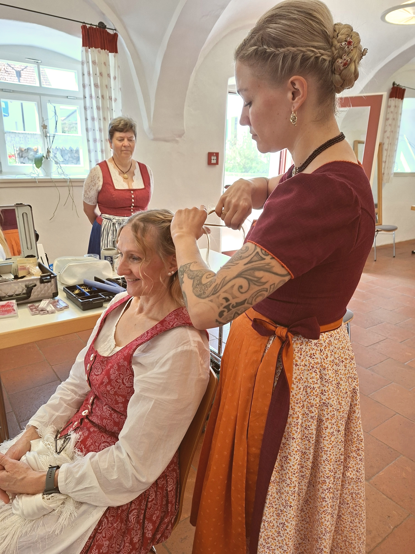 Zur Sonderausstellung „Heimat und Dirndl“ im Trachtenkulturzentrum Holzhausen gab es am 18. April einen Aktionstag. Dabei konnte zahlreichen Handwerkern über die Schultern geschaut werden und sie stellten ihre Arbeit vor: Miederherstellung, Goldstickerei, Rüschenanfertigung, Smokstickerei. Informationen wurden gegeben und Fragen zu einzelnen Arbeitsgängen wurden beantwortet. Zu guter Letzt konnten sich die Deandl schöne Anregungen zu Dirndl-Frisuren holen oder auch für den Abend „aufbrezeln“ lassen.