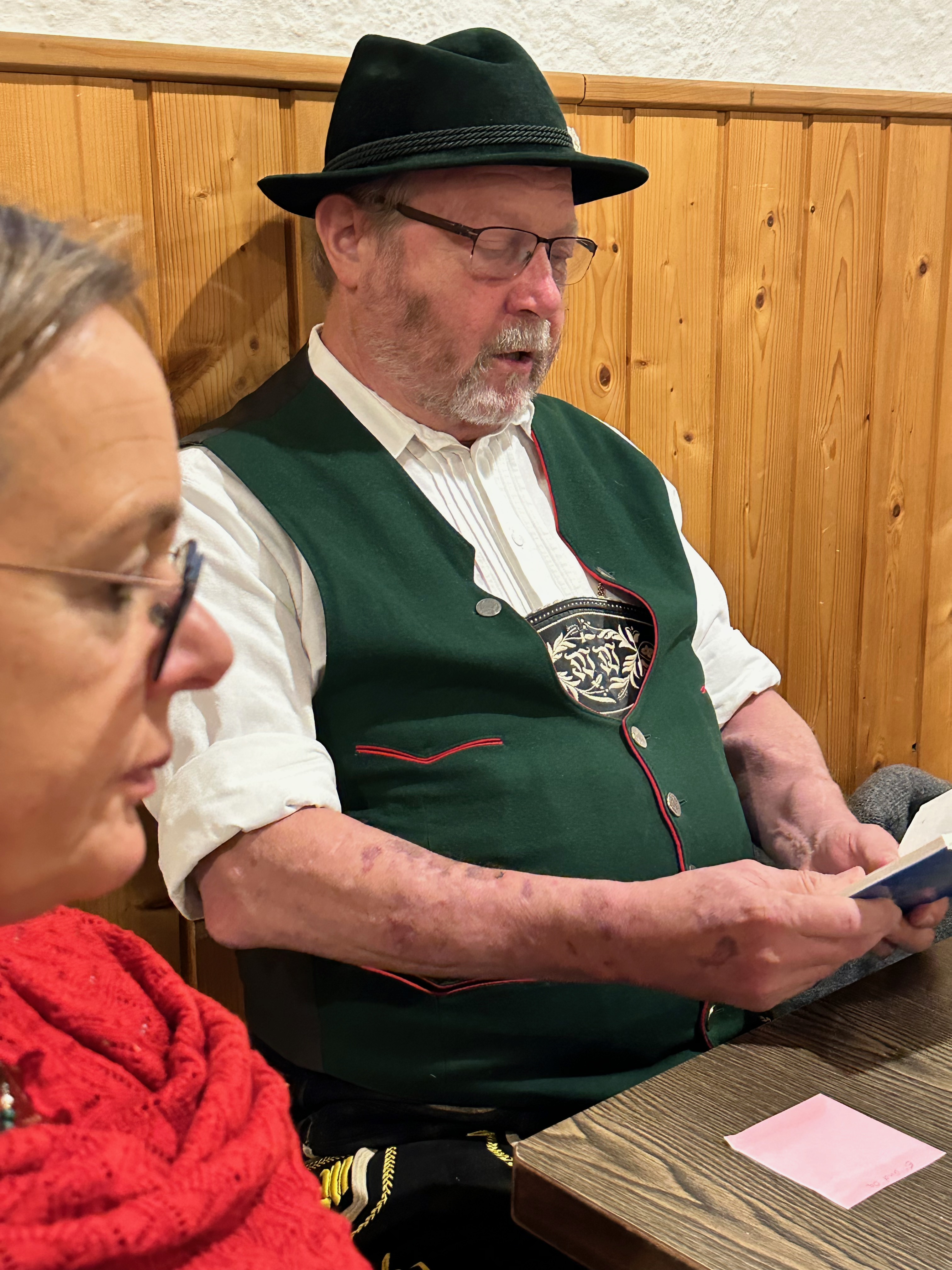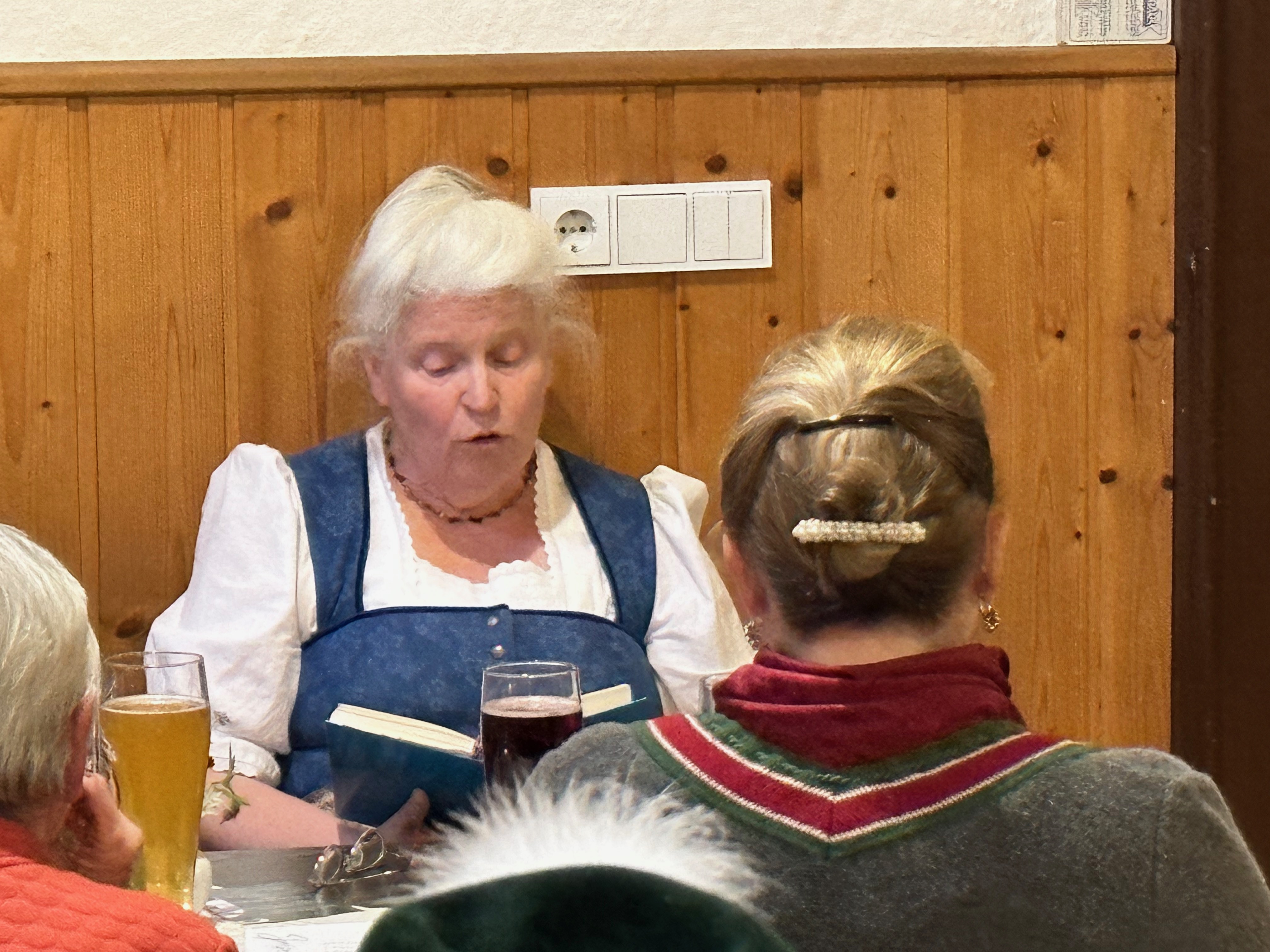 Mal nachdenklich, mal lustig, mal informativ waren dabei die gewählten Texte: Anna Hausstätter las von der Fräulein Zizibe und ihrem Leben, sowie das "Henna attentat", in dem es um die Folgen von Alkohol fürs Federvieh ging. Christa Schmied trug etliche ihrer selbstgeschriebenen Mundartgedichte vor, die ihre Gedanken und Beobachtungen im Leben wieder geben und die Zuhörer zum nachdenken anregte. Walter Weinzierl las zum einen unterhaltliche Gedichte wie von einem Gast aus Kiel, der eine Bayerin mit seinen frisch erlernten bajuwarischen Kenntnissen beeindruckten möchte. Aber auch nachdenkliches war von ihm zu hören: so über Erlebnisse auf dem Rosenheimer Christlkindlmarkt oder über heutige Kindernamen. Sepp Huber als vierter Mundartsprecher berichtet zunächst über die "Greisn", ein bayerisches Fabelwesen ähnlich dem Wolpertinger und wie dieses in Vollmondnächten zu fangen ist. In einem weiteren Beitrag berichtet er von alten baierischen Wörtern und Redewendungen, die er als Kreisheimatpfleger im Landkreis Ebersberg sammelt und lies die anwesenden Gässte mitraten, was denn das eine oder andere Wort bedeutet. Vor allem hierbei traten Feinheiten des Baierschen in unserem Gaugebiet zu Tage:viele dieser alten Worte unterscheiden sich stark, je nachdem ob sie beispielsweise im östlichen Ebersberger Raum oder im Inntal oder gar im unteren Inntal gesprochen werden.