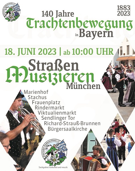 Anlässlich unseres Jubiläums 140 Jahre Trachtenbewegung in Bayern möchten wir ein Straßenmusizieren in der Landeshauptstadt München durchführen. Der Bayerische Trachtenverband hat bereits Straßenmusizieren im Jahr 2006, 2008 und 2014 in München mit großem Erfolg und großer Anerkennung durchgeführt.