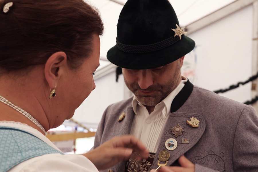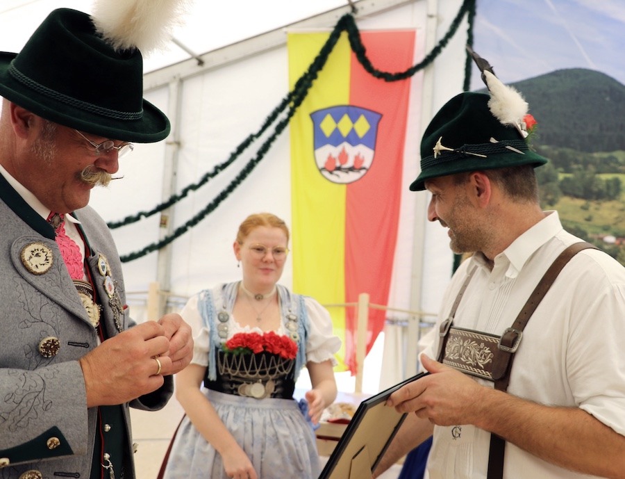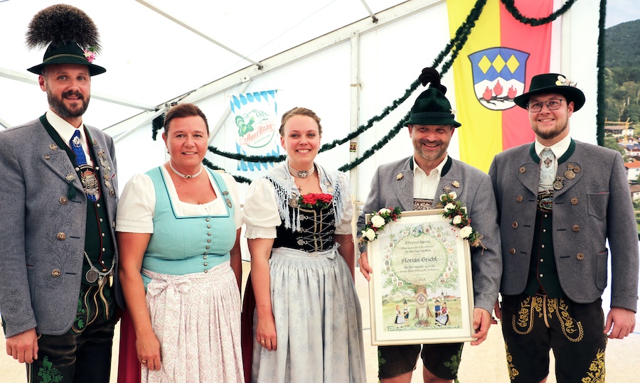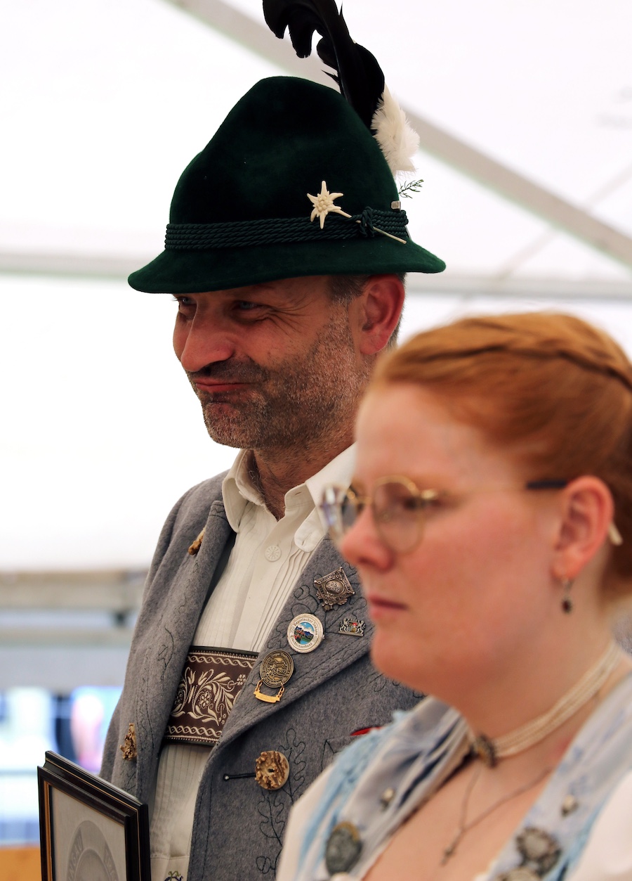 Zunächst hatte 1. Gauvorstand Pankraz Perfler die Freude, dem im vergangenen Jahr aus dem Gauausschuss ausgeschiedenen Florian Griebl das Ehrenzeichen des Bayerischen Inngau-Trachtenverbandes für Dank und Anerkennung in Gold zu überreichen. Ganze 26 Jahre war Florian in der Gaugruppe (1996 - 2021), ab 2000 war er 2. Gauvorplattler, ab 2003 1. Gauvorplattler. Von 2009 - 2012 brachte er sich als Beisitzer im Gauausschuss ein und übernahm von 2012 bis 2015 das Amt als 2. Gaujugendleiter. Von 2015 bis 2024 war er Preisrichterobmann. Außerdem war er von 2009 an 12 Jahre lang Gaujugendgruppenleiter und ist seit 1996 Preisrichter.