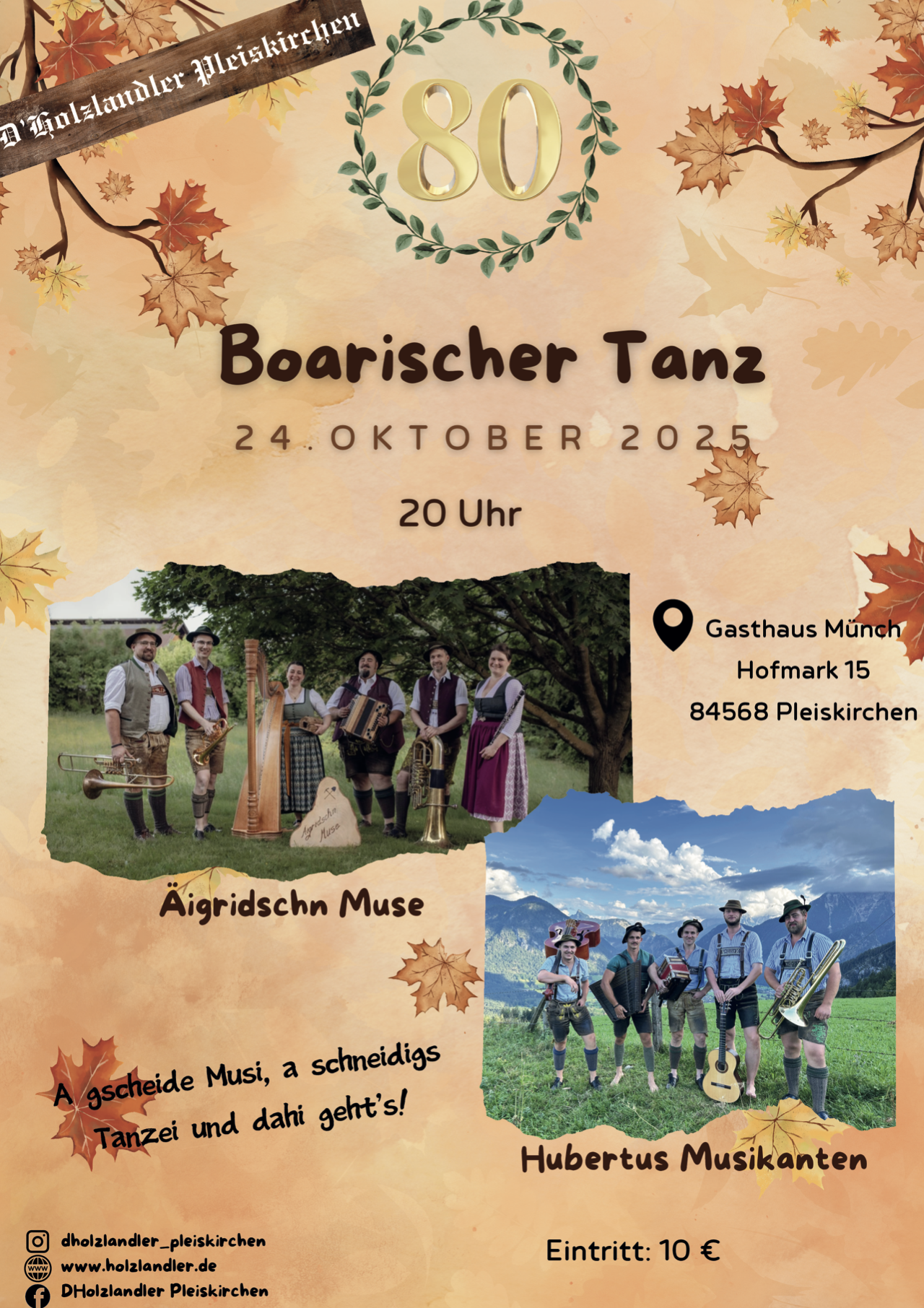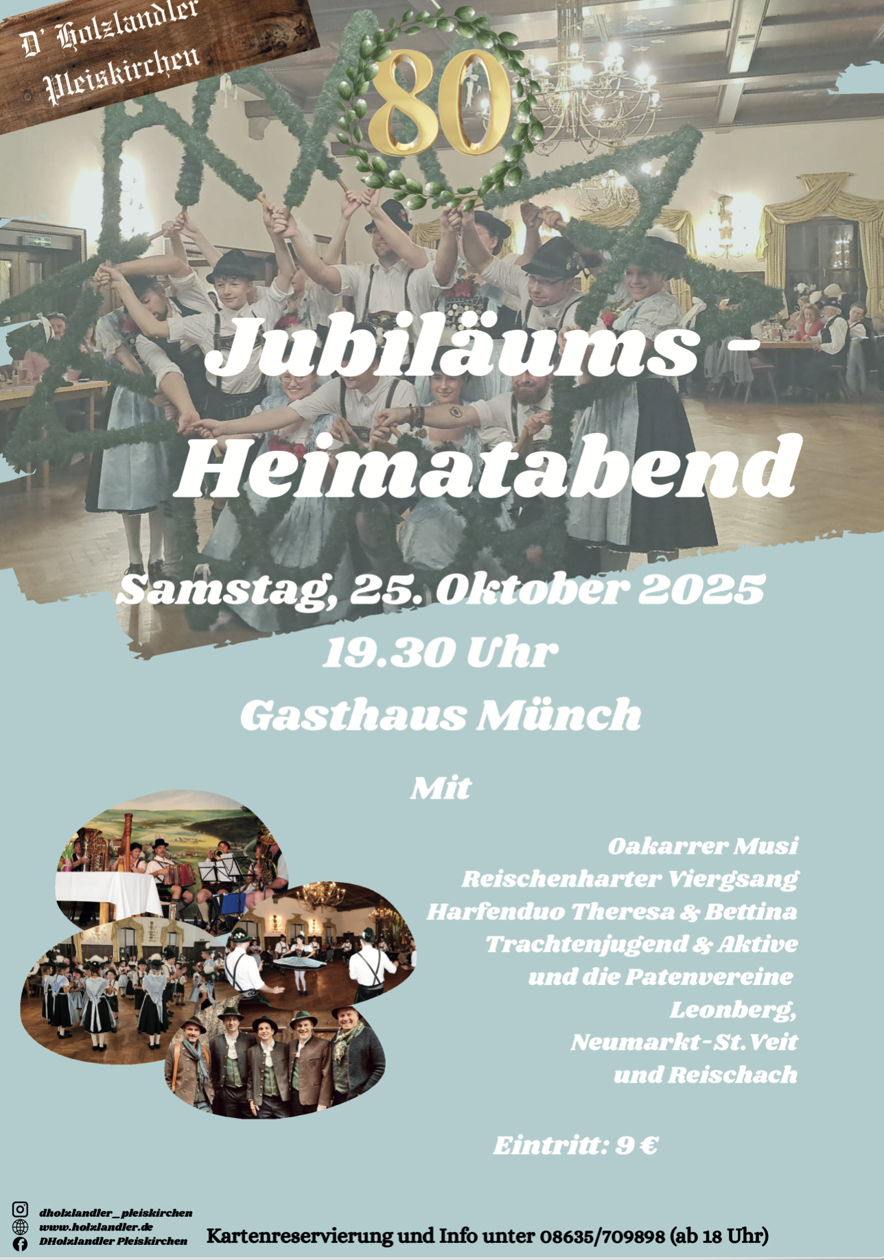 Jubiläums-Heimatabend zum 80jährigen Vereinsbestehen des Trachtenvereins D’Holzlandler Pleiskirchen/Lkrs. Altötting um 19.30 Uhr im Gasthaus Münch in Pleiskirchen mit der Oakarrer Musi, dem Reischenharter Viergesang, den Burgkirchner Alphornbläsern, dem Harfenduo Theresa&Bettina, den Tanz- und Plattlergruppen und den Patenvereinen Neumarkt-St.Veit, Leonberg und Reischach. Sprecher: Andreas Wachs, Bayerische Trachtenjugend. Kartenvorbestellung unter Tel.: 08635/709898 (ab 18 Uhr).